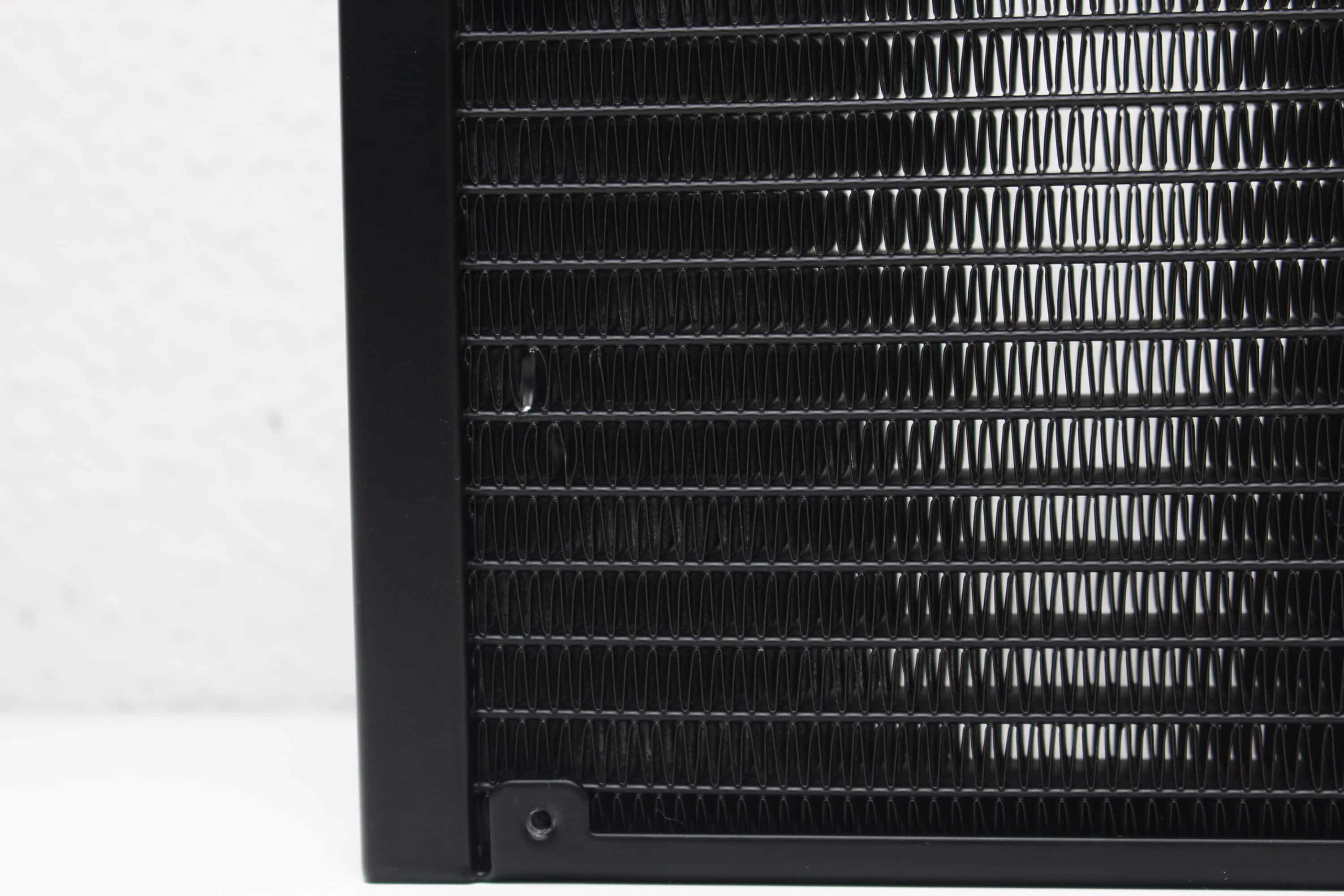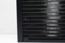 Der Radiator der LC-CC-360-B-ARGB – JetFlow misst 398 x 120 x 27 Millimeter und ist komplett schwarz lackiert. Er besteht aus Aluminium und kommt ohne Schriftzüge oder auffällige Akzente daher. Lediglich seitlich sind gewisse Einbuchtungen zu erkennen. Auch auf eine RGB-Beleuchtung im bzw. am Radiator hat der Hersteller verzichtet. Im Bereich der Schläuche platziert LC-Power zudem eine Art Stutzen, der vermutlich zur Befüllung der AiO-Wasserkühlung genutzt wurde oder als eine Art Druckausgleichsventil dient.