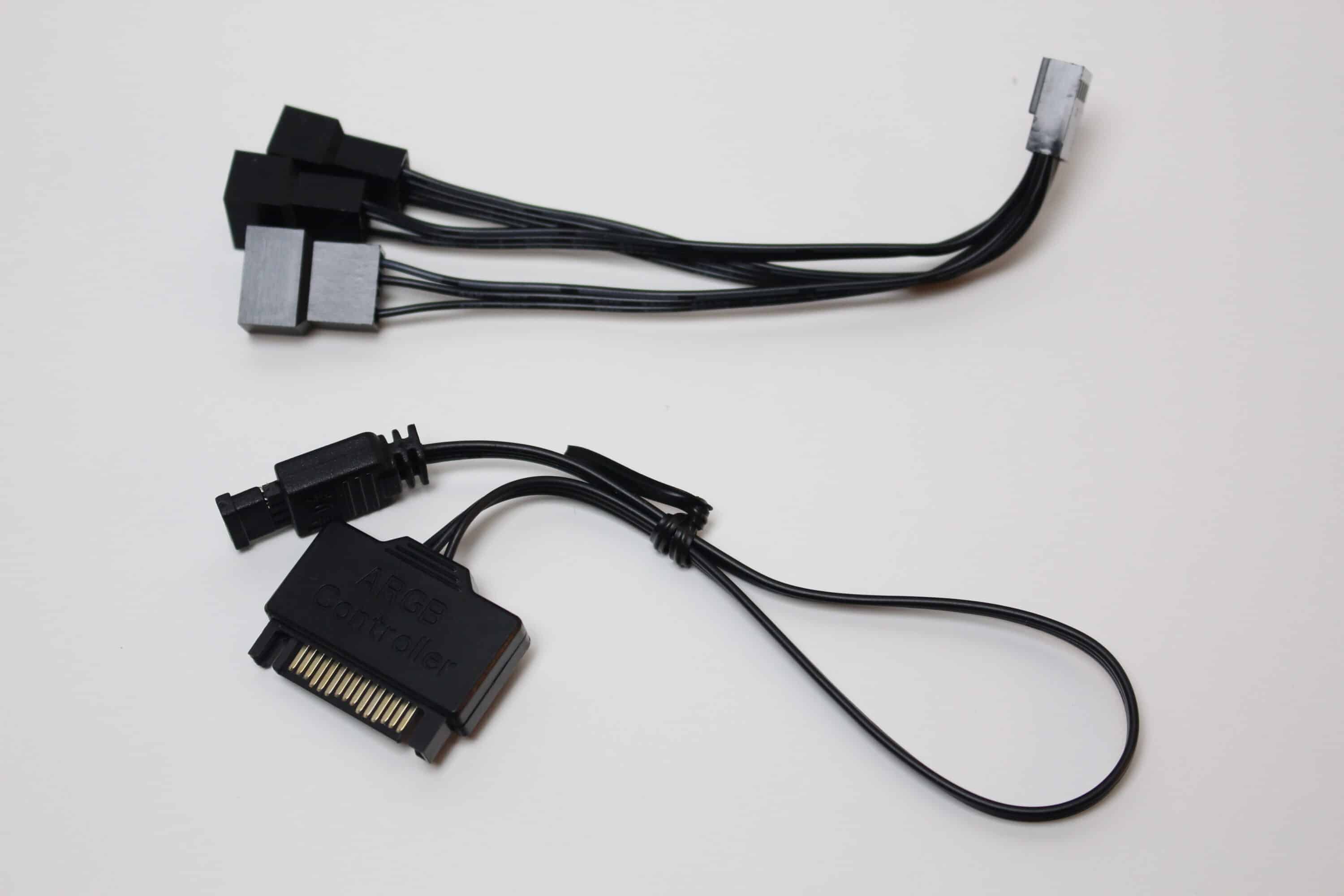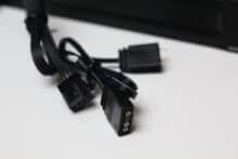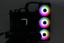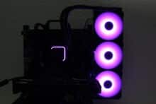 Die LC-Power LC-CC-360-B-ARGB – JetFlow verfügt über diverse ARGB-Elemente, die über das Mainboard angesteuert werden können. Dazu gehören sowohl die Lüfter, deren Lüfternabe über jeweils 8 LEDs verfügt, als auch der Pumpenblock, der mit einem dezenten ARGB-Streifen ausgestattet wurde. Die Ansteuerung erfolgt jeweils über einen 3-Pin-5V-ARGB-Stecker. Um den Anschluss an einem Mainboard mit wenigen Anschlüssen zu erleichtern, besitzen die Lüfter bzw. die Pumpe jeweils einen Splitter für das ARGB-Signal. Falls das Mainboard über keinen passenden Anschluss verfügt, liegt dem Lieferumfang auch ein simpler ARGB-Controller dabei. Abschließend noch ein paar Impressionen der aktivierten Beleuchtung.