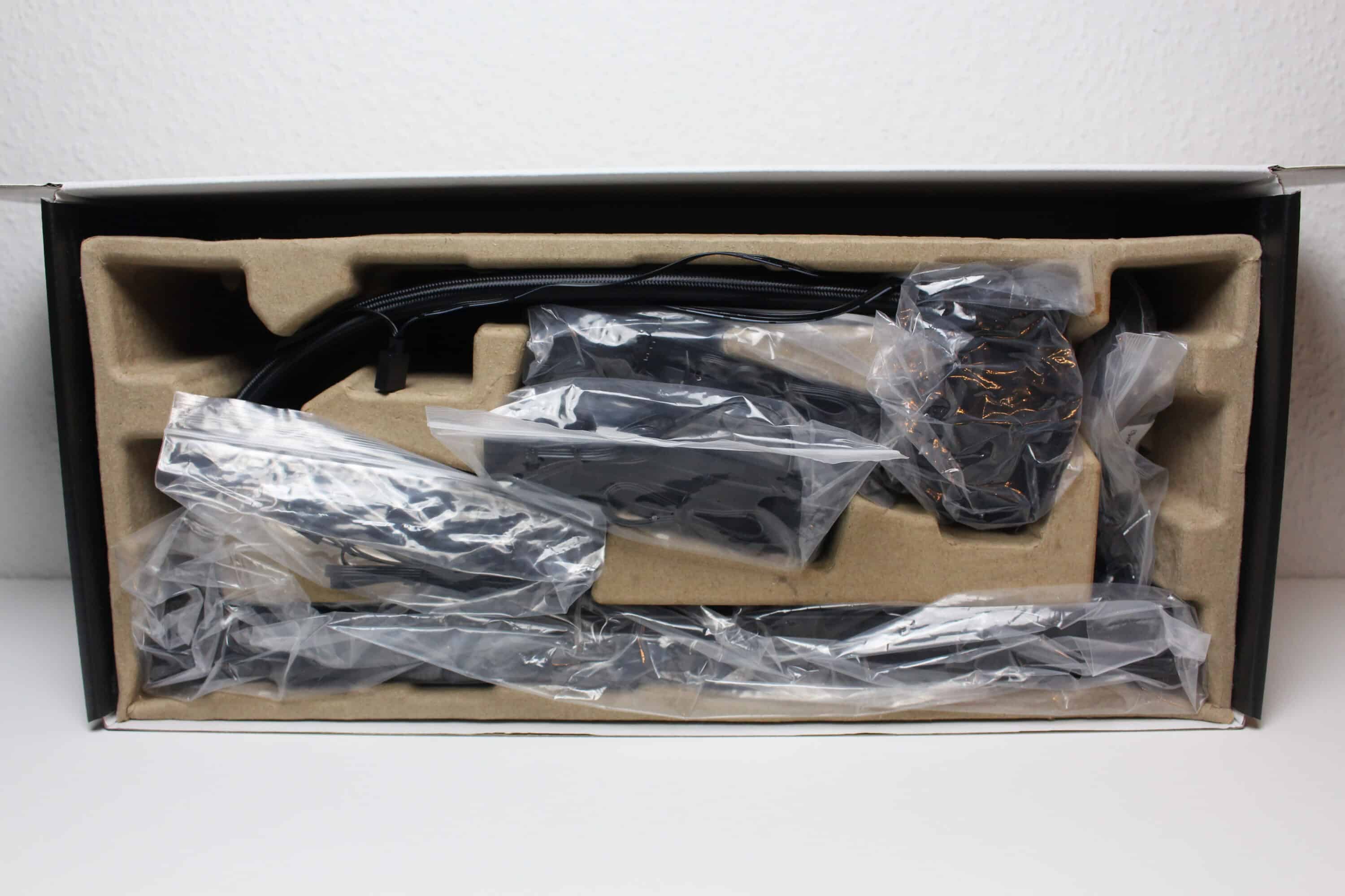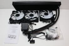 Öffnet man die Verpackung, trifft man zunächst auf eine dünne Schicht Schaumstoff und darunter auf eine Form aus recycelter Pappe. Innerhalb dieser Form platziert LC-Power sämtliche Komponenten der AiO-Wasserkühlung und hüllt diese für einen zusätzlichen Schutz in einzelne Folien aus Kunststoff. Zum Lieferumfang gehören die Radiator-Pumpen-Kombination, drei 120-mm-ARGB-Lüfter, das notwendige Montagematerial für alle gängigen Sockel, eine Tube Wärmeleitpaste, eine Montageanleitung sowie eine dreifache Y-Weiche für die drei Lüfter und ein einfacher ARGB-Controller.