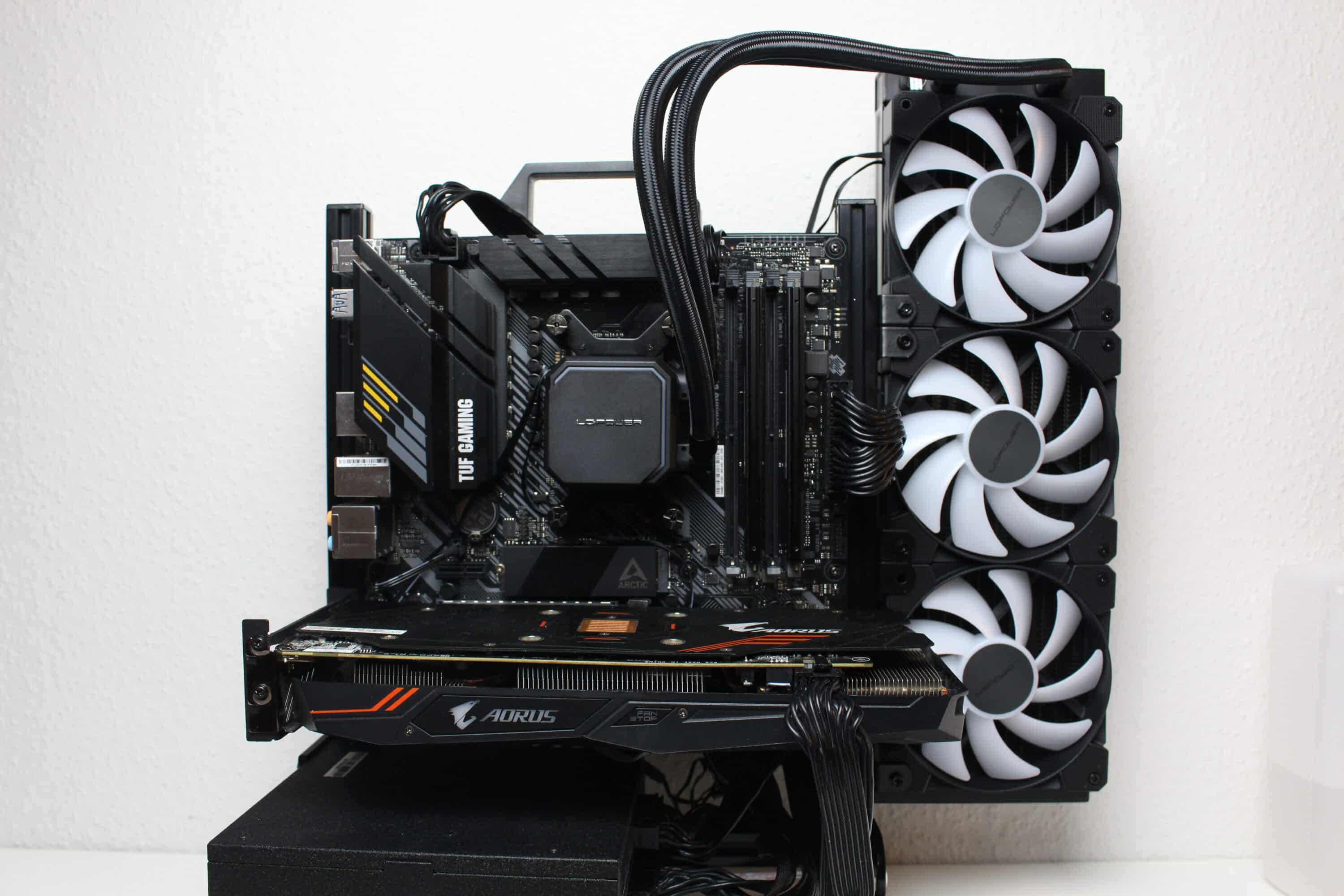 Für den Leistungstest kommt ein Testsystem zum Einsatz, welches auf einem Benchtable montiert ist. Dadurch können wir Faktoren wie einen Hitzestau im Gehäuse ausschließen. Das Testsystem besteht aus den folgenden Komponenten.
