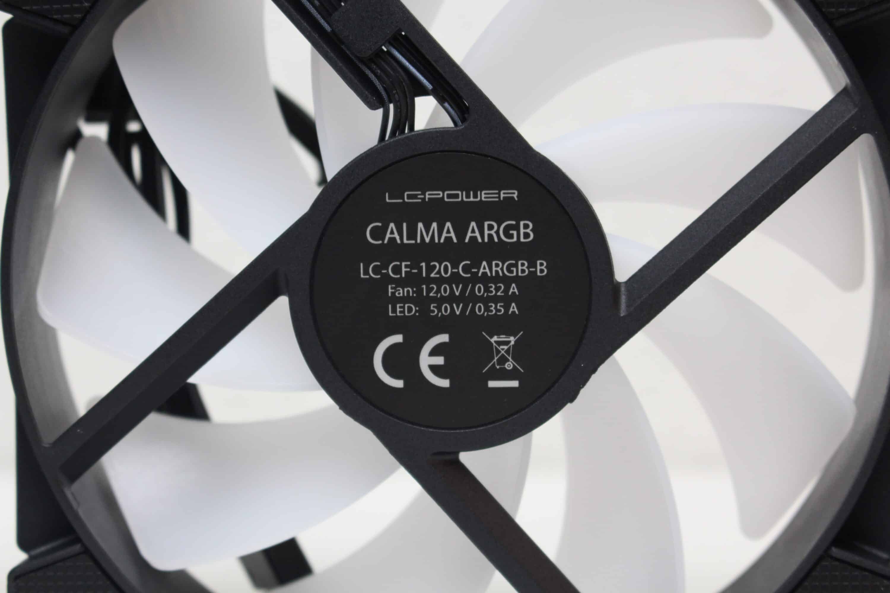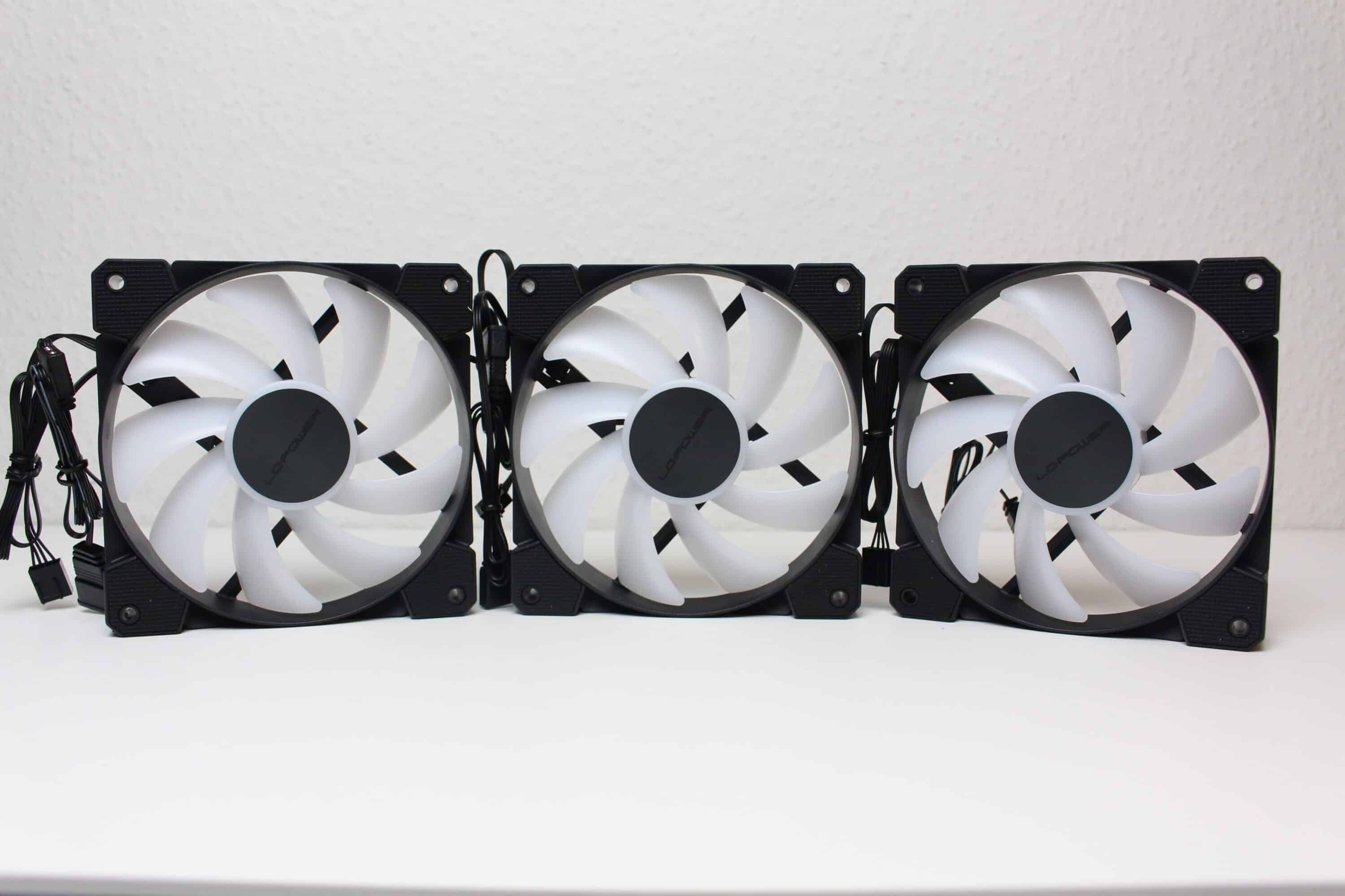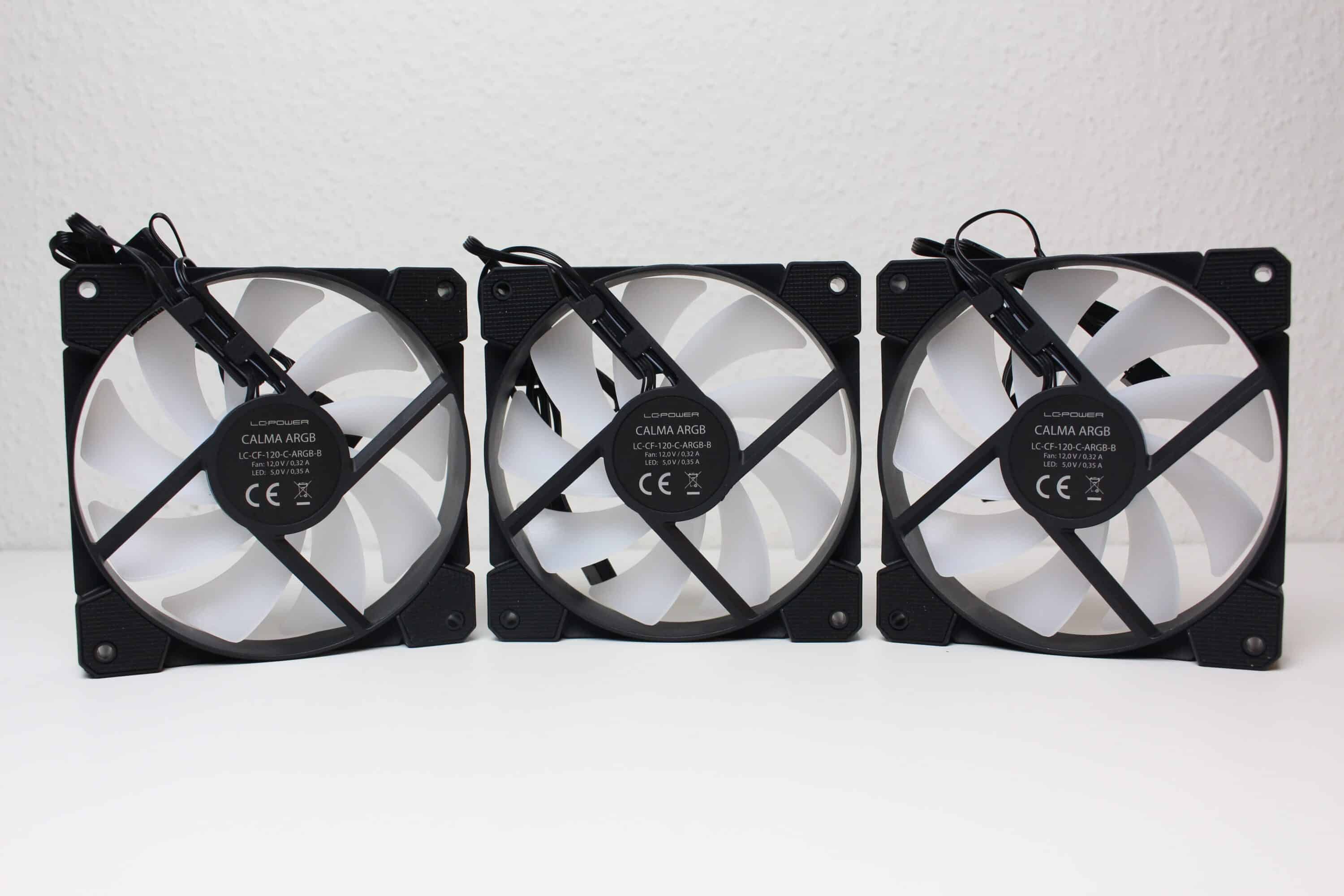 Die drei mitgelieferten Lüfter vom Typ LC-Power CALMA ARGB haben eine Rahmenbreite von 120 Millimetern und bestehen aus einem schwarzen Rahmen sowie einem milchig-weißen Rotorblatt mit jeweils neun Lüfterblättern. Über den 4-Pin-PWM-Anschluss können die Lüfter Umdrehungszahlen zwischen 500 und 2000 Umdrehungen pro Minute erreichen. Die RGB-Beleuchtung wurde mittels acht einzelner LEDs in der Lüfternabe realisiert und deren Ansteuerung erfolgt über einen herkömmlichen 3-Pin-5V-ARGB. Zur Reduzierung von Vibrationen verfügen alle acht Ecke über eine Schicht aus Gummi.