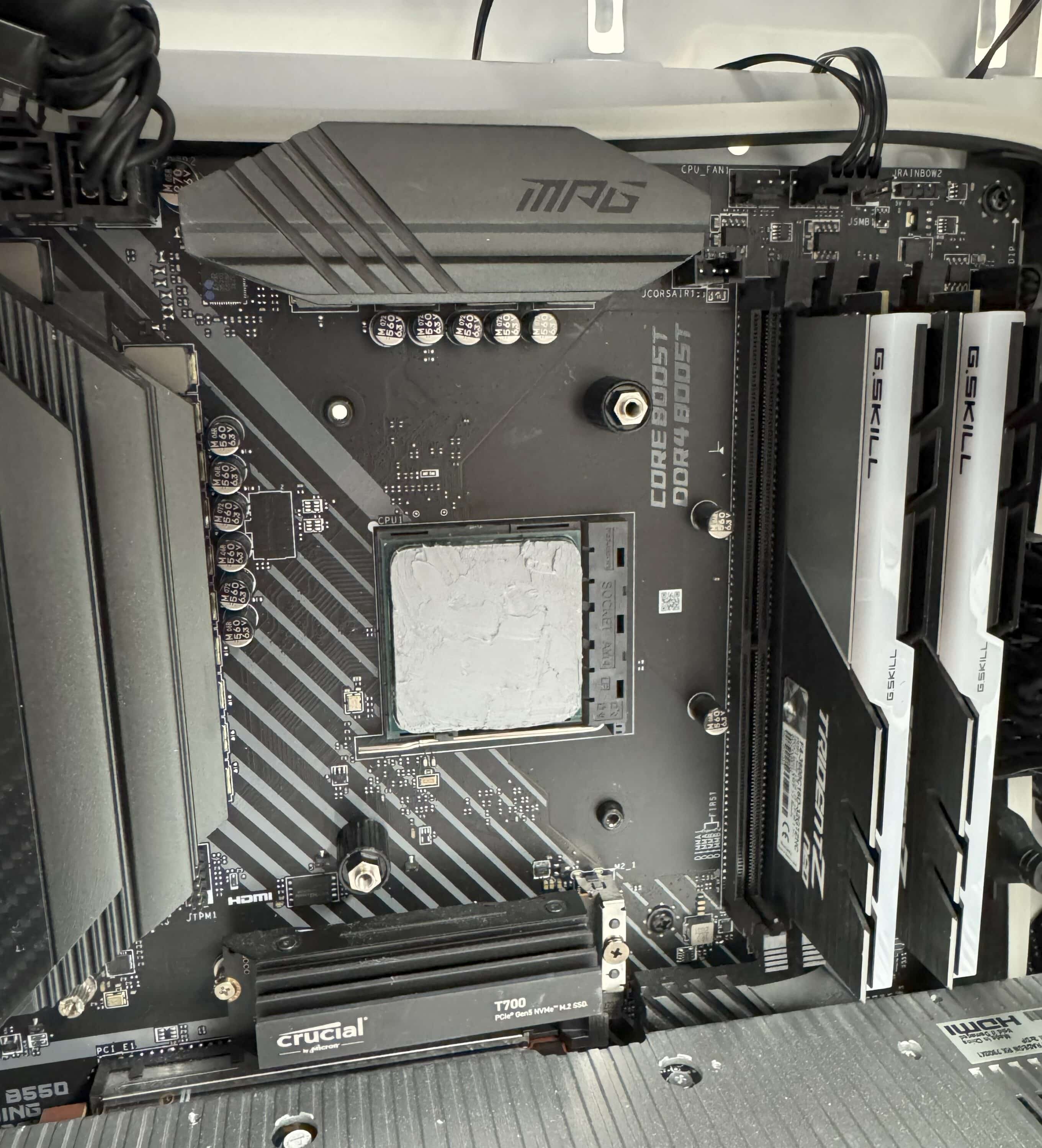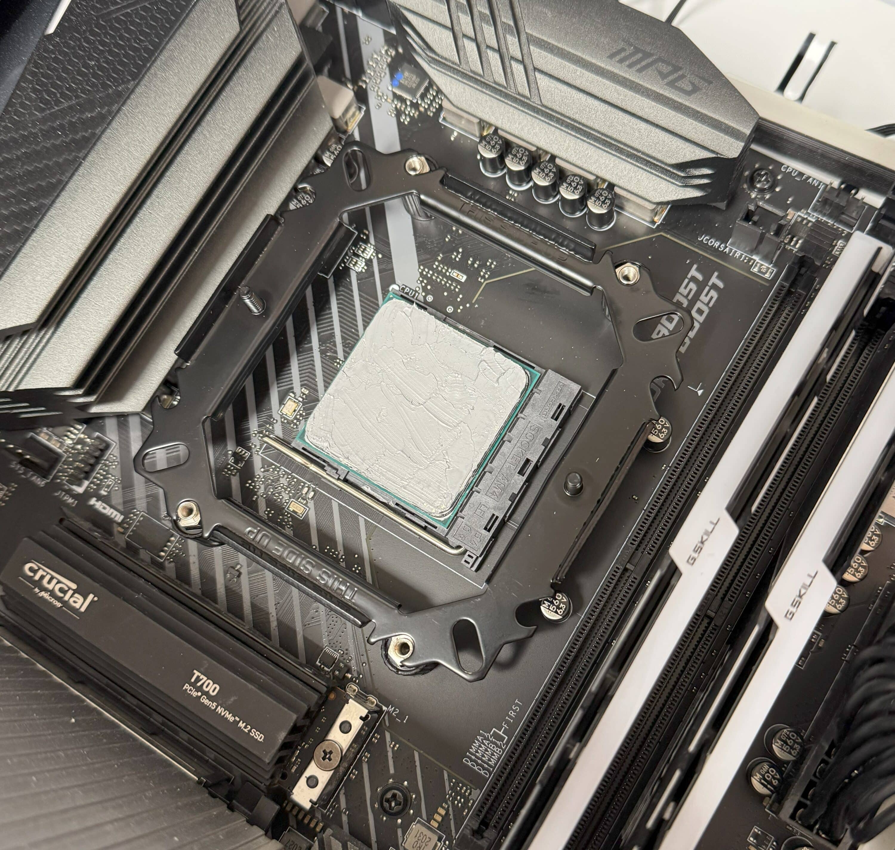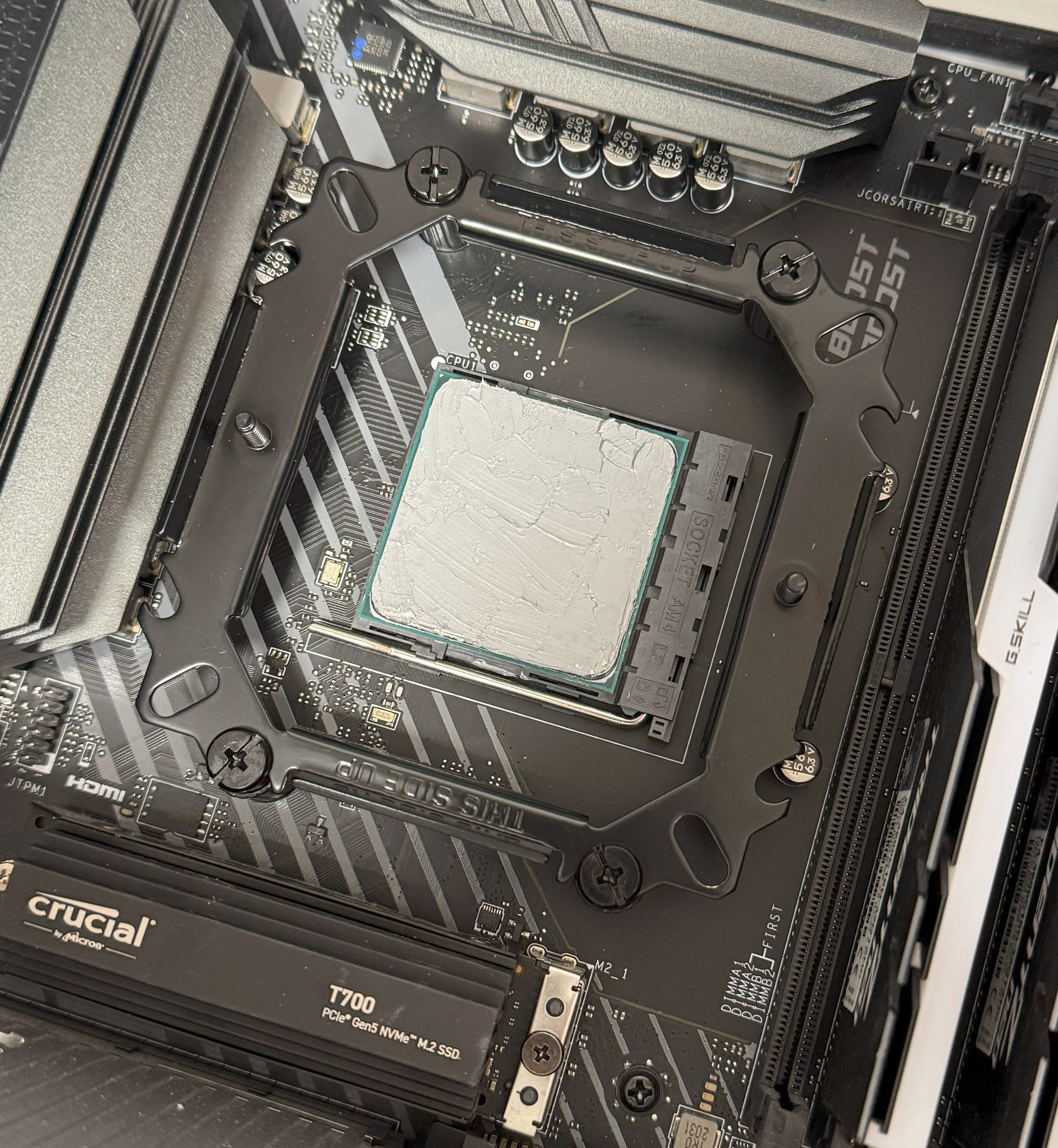 Nun wird der Kühler vorsichtig aufgesetzt und mit den federgelagerten Muttern fest angezogen. Der Anpressdruck wird durch die Federn optimal eingestellt. Die Auflagefläche des Kühlers überdeckt die Abdeckung der AM4-CPU nicht komplett.