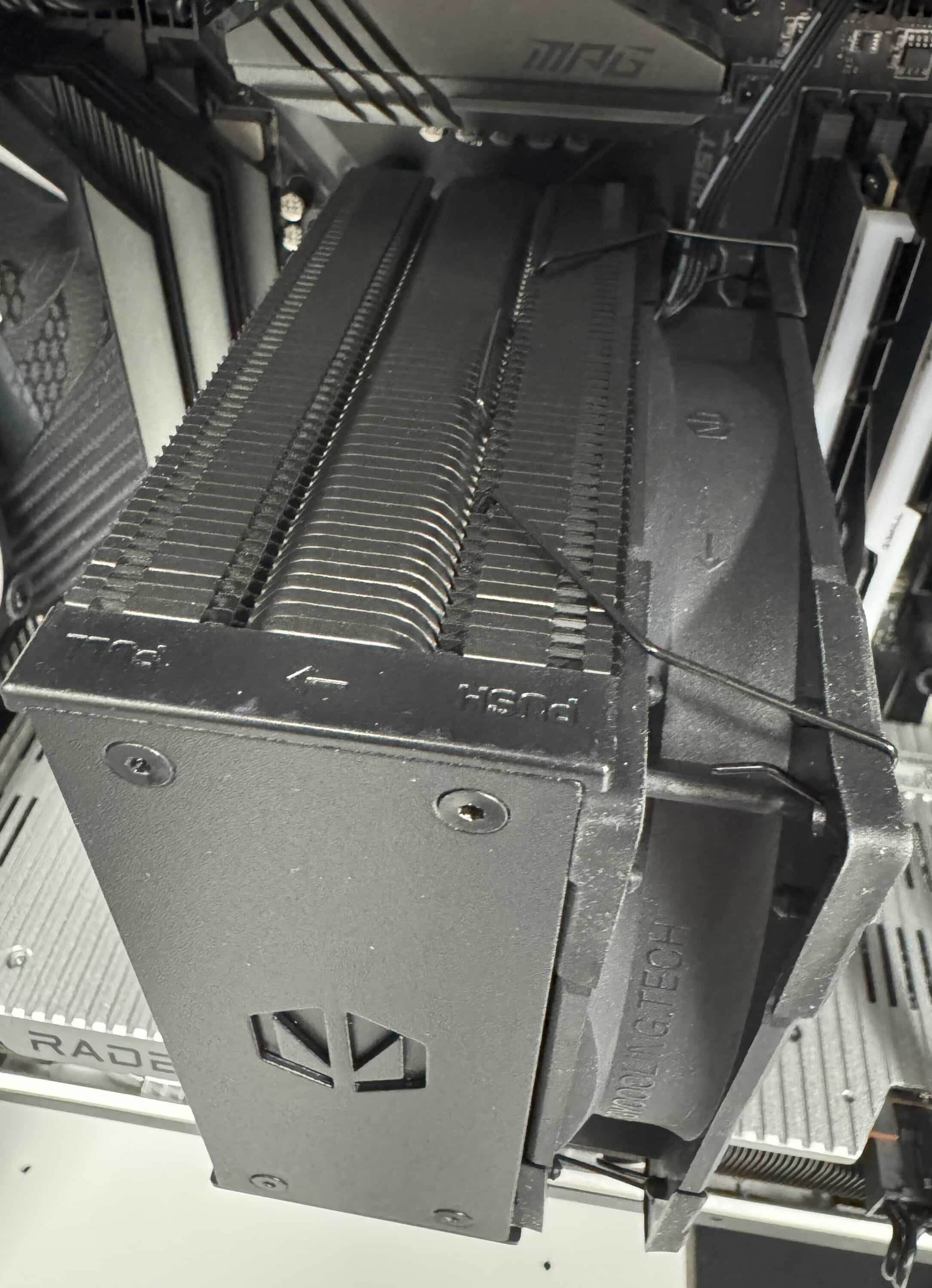 Ein ca. 3 mm Rand blickt darunter hervor. Für die Kühlung sollte dies aber keine größere Auswirkung haben. Der Lüfter wird, wie üblich, durch Klammern am Kühlkörper angebracht. Durch die kleinen Beschriftungen mit „Push“ und „Pull“ werden die Funktionsweisen der beiden Montageplätze nochmal optisch dargestellt.