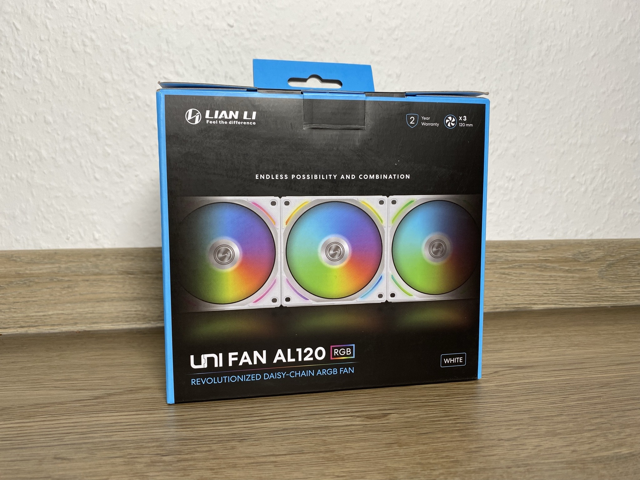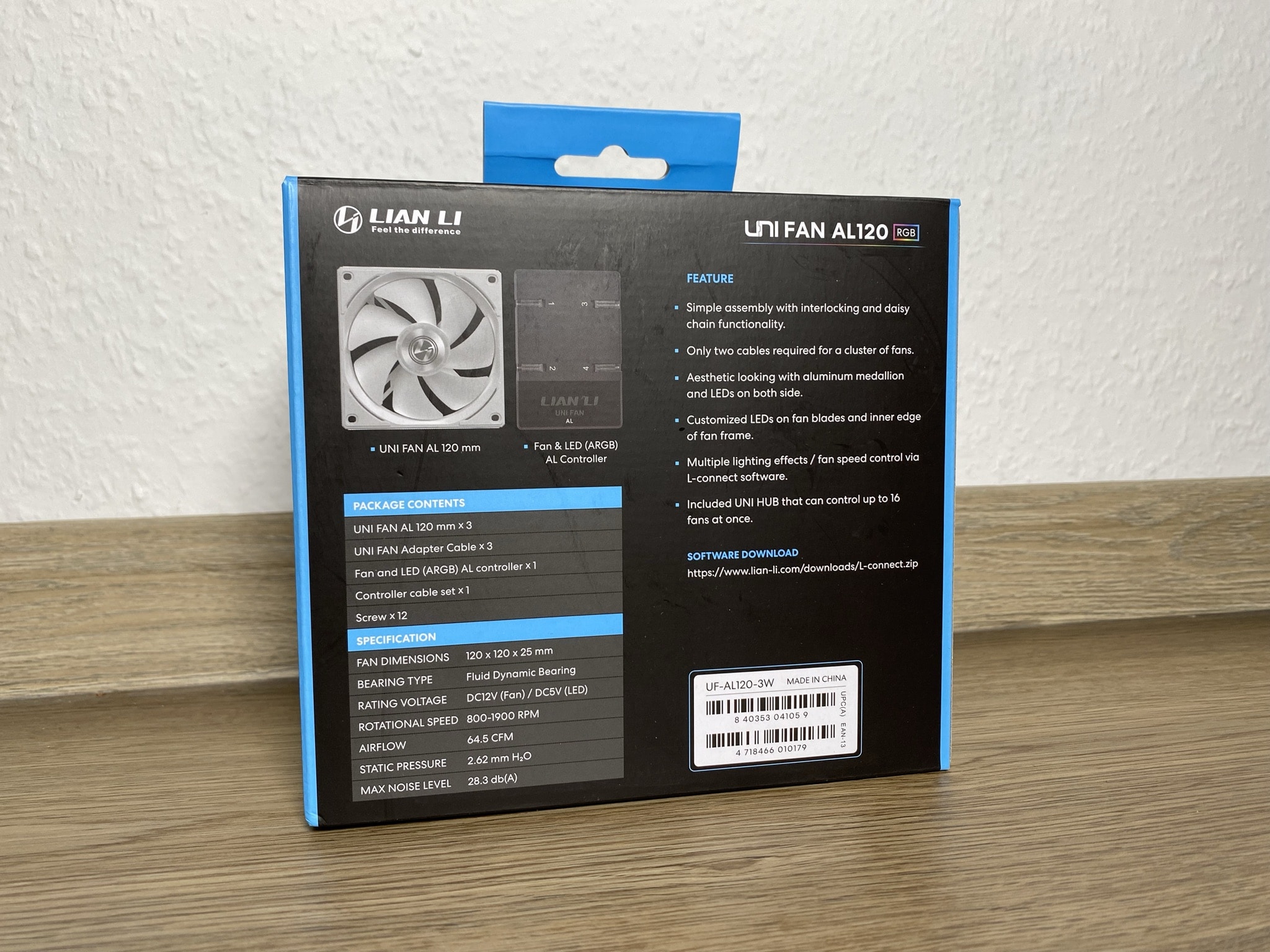 Bei der Verpackung hat sich nicht viel mehr als der Aufdruck geändert. Geliefert werden die AL120 Uni Fans in einem schlichten Karton, auf dem die Lüfter mit ihren RBG-Farben direkt ins Auge springen. Auf der Rückseite finden wir alle Spezifikationen, die man gleichzeitig auch auf der Website von Lian Li nachlesen kann.