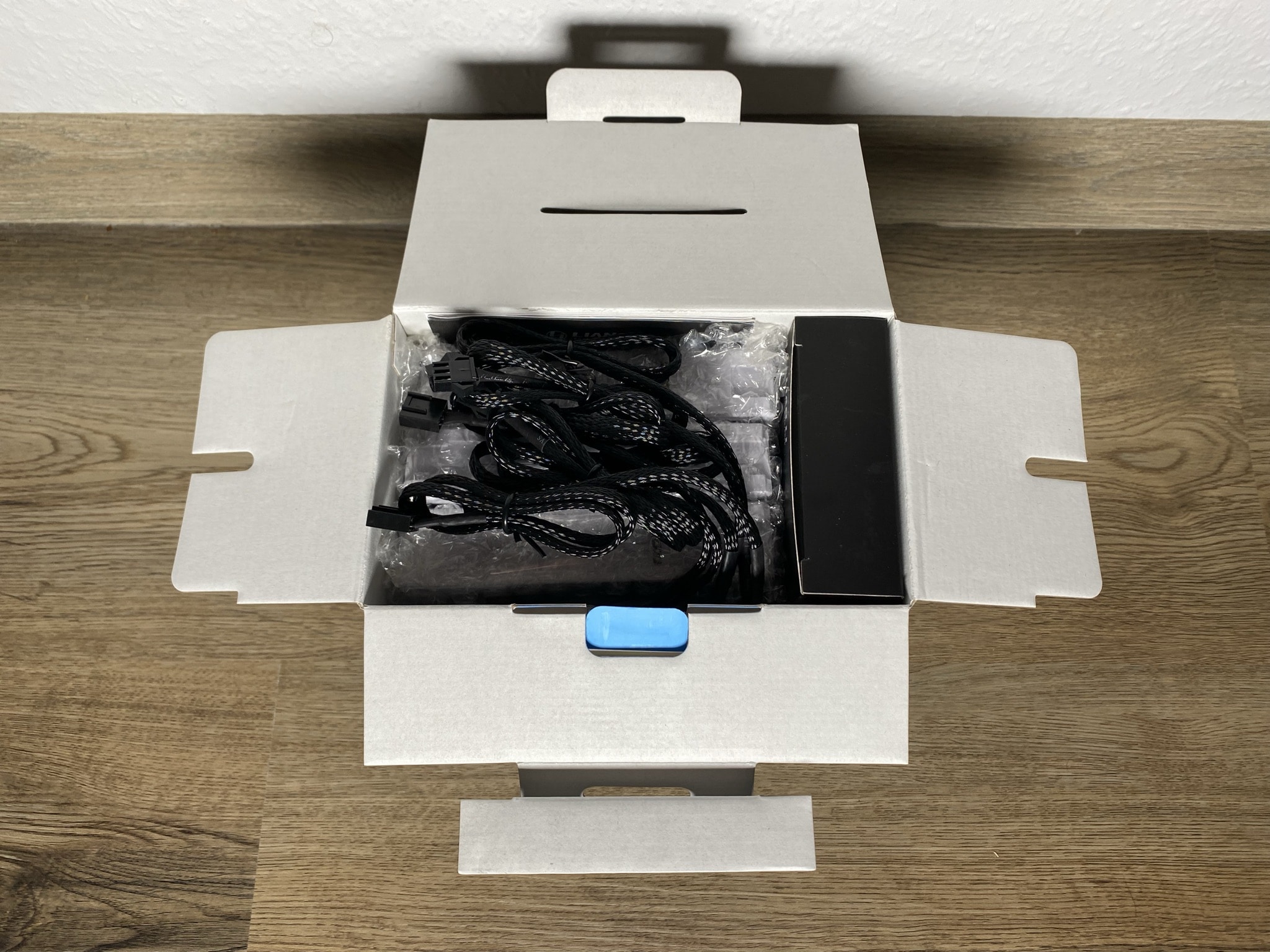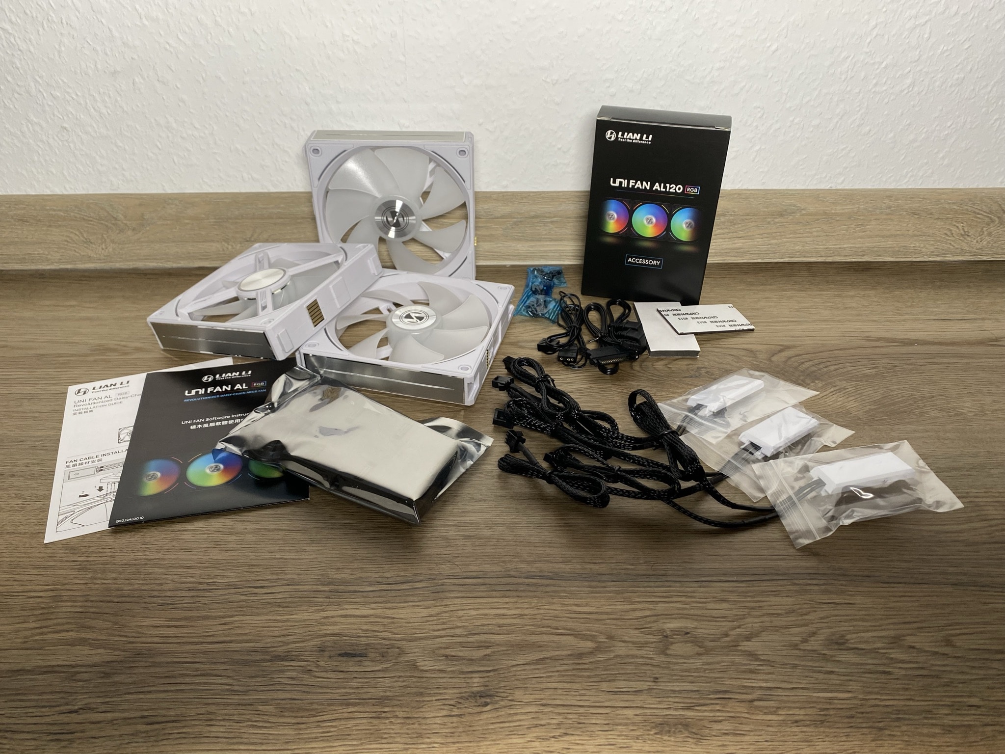 Innerhalb der Verpackung spiegelt sich das gleiche Bild ab – nichts ausschlaggebendes neues. Die einzelnen Lüfter sind jeweils in Folie verpackt, der Controller samt Kabel in einem kleinen schwarzen Karton daneben. Zusätzlich werden noch schwarze Schrauben, die Lüfterkabel mit den Kontakten und der RGB-Controller einzeln in Folie verpackt. Standard und einfach.