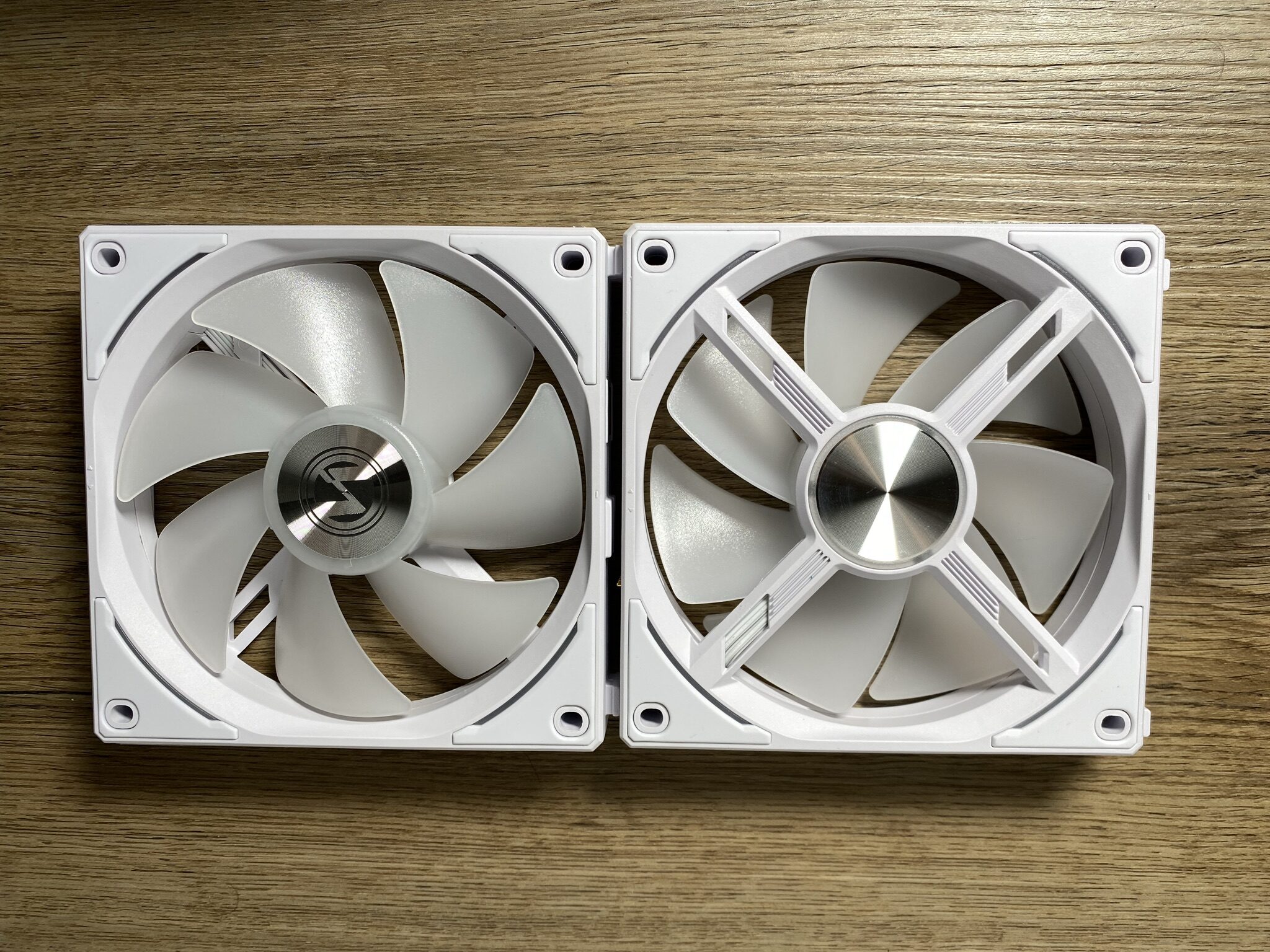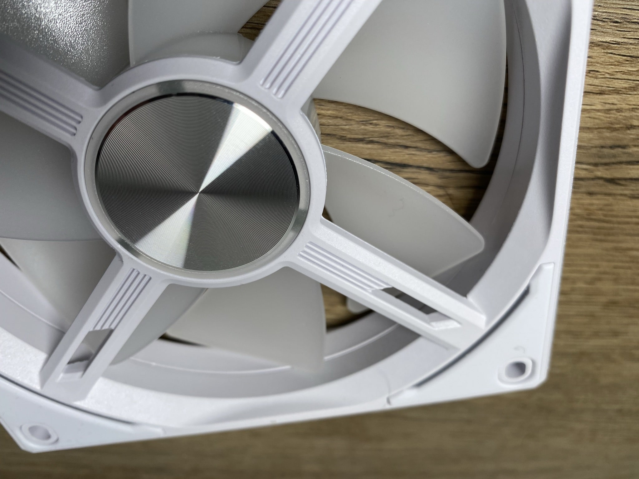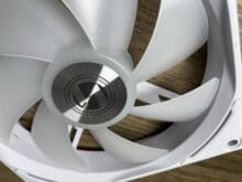 Abgesehen von dieser einen Änderung hat sich Lian Li beim Altbewährten bedient. Das Lager ist ein fluiddynamisches Lager welches besonders geschmeidig und über einen langen Zeitraum laufen kann. Den sichtbaren Abschluss stellt der silberne Lian Li-Sticker dar. Eine besondere Änderung finden wir auf der Rückseite. Hier stehen üblicherweise die Spezifikationen. Darauf hat Lian Li verzichtet und hier einen weiteren silberfarbenen Sticker angebracht. Somit lassen sich die Lüfter in beiden Richtungen montieren, ohne dabei einbüßenden in der Optik machen zu müssen.