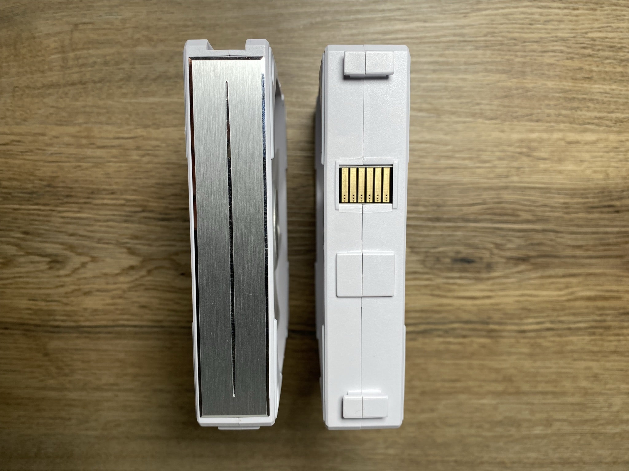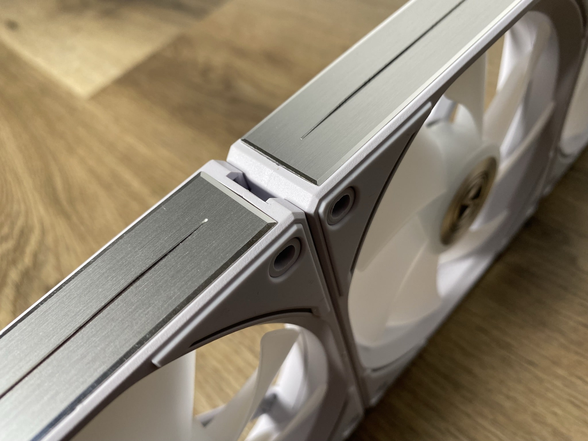 Des Weiteren befindet sich wieder, an den später im verbauten Zustand sichtbaren Seiten der Lüfter, ein weiterer silberfarbener Aluminium-Teil, welcher im Vergleich zum Vorgänger in der Größe deutlich gewachsen ist und die Lüfter damit optisch nochmals edler erscheinen lässt. Wenn man schon bei den Seiten ist – Lian Li greift hier wieder auf das bewährte Steck-Design zurück. Die AL120 lassen sich wie die SL120 bis zu vierfach zusammenstecken und mit einem einzelnen Kabel beleuchten und steuern.