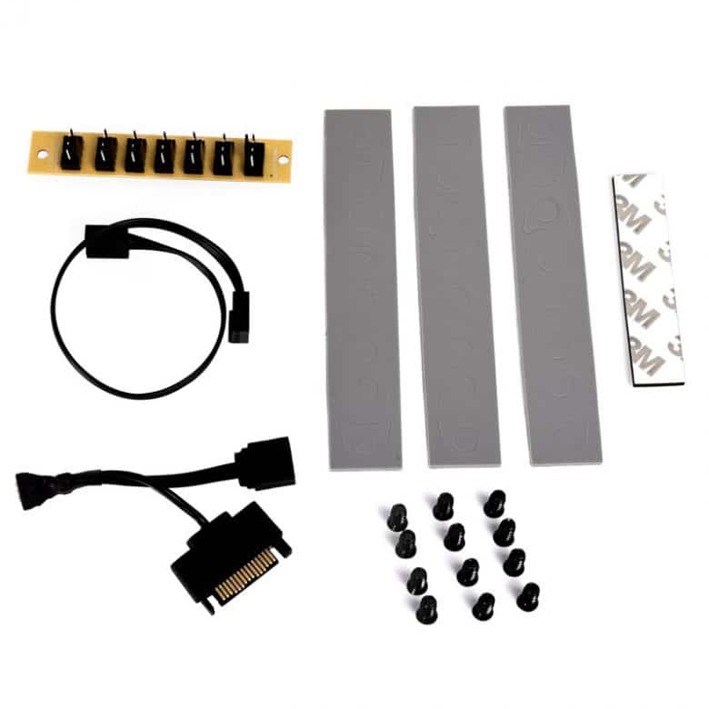 | Lieferumfang | 3x Lüfter 1x Hub für sechs 4-Pin-Lüfter 1x Y-Kabel mit drei 5050-Anschlüssen für die RGB-Steuerung 1x 4-Pin-Kabel für Anschluss des Hubs an das Mainboard 12x Lüfterschrauben Klebestreifen |