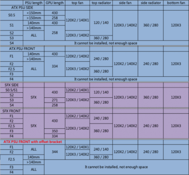 Durch den modularen Netzteilrahmen, in dem sowohl ATX- als auch SFX(-L)-Netzteile befestigt werden können und der an diversen Stellen platziert werden kann, erlaubt das innere Layout des Lian Li & DAN A3-mATX sehr viele verschiedene Varianten bzw. Zusammenstellungen. Generell gibt es Platz für einen 167 Millimeter hohen Luftkühler, eine 415 Millimeter lange Grafikkarte bzw. ein 220 Millimeter langes Netzteil. Ein langes Netzteil schränkt jedoch die Maximallänge der Grafikkarte ein und umgekehrt. Für eine bessere Übersicht stellt der Hersteller eine umfangreiche Dokumentation zur Verfügung in welcher die Möglichkeiten unter anderem tabellarisch dargestellt werden.