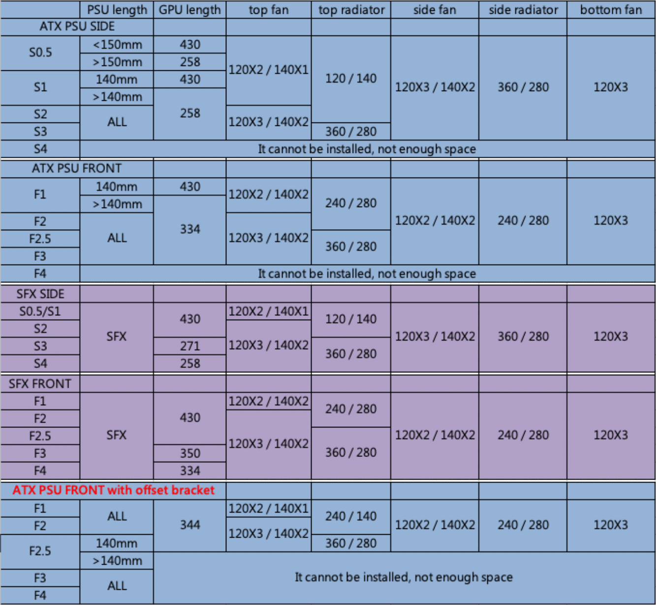 | Radiatoren: | Deckel: 1x 240/ 280/ 360 mm Boden: 1x 240/ 280 mm Seite: 1x 240/ 280/ 360 mm |