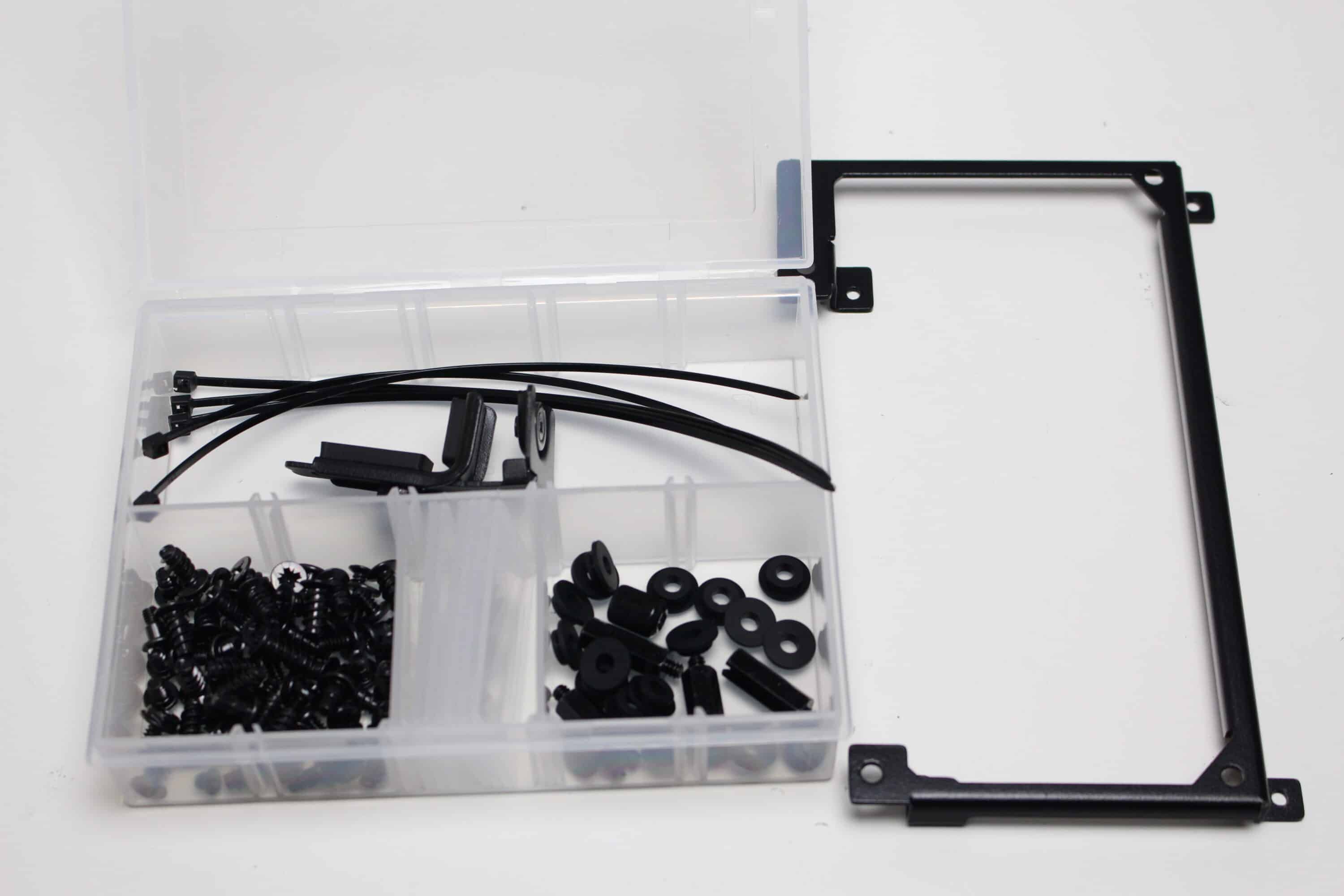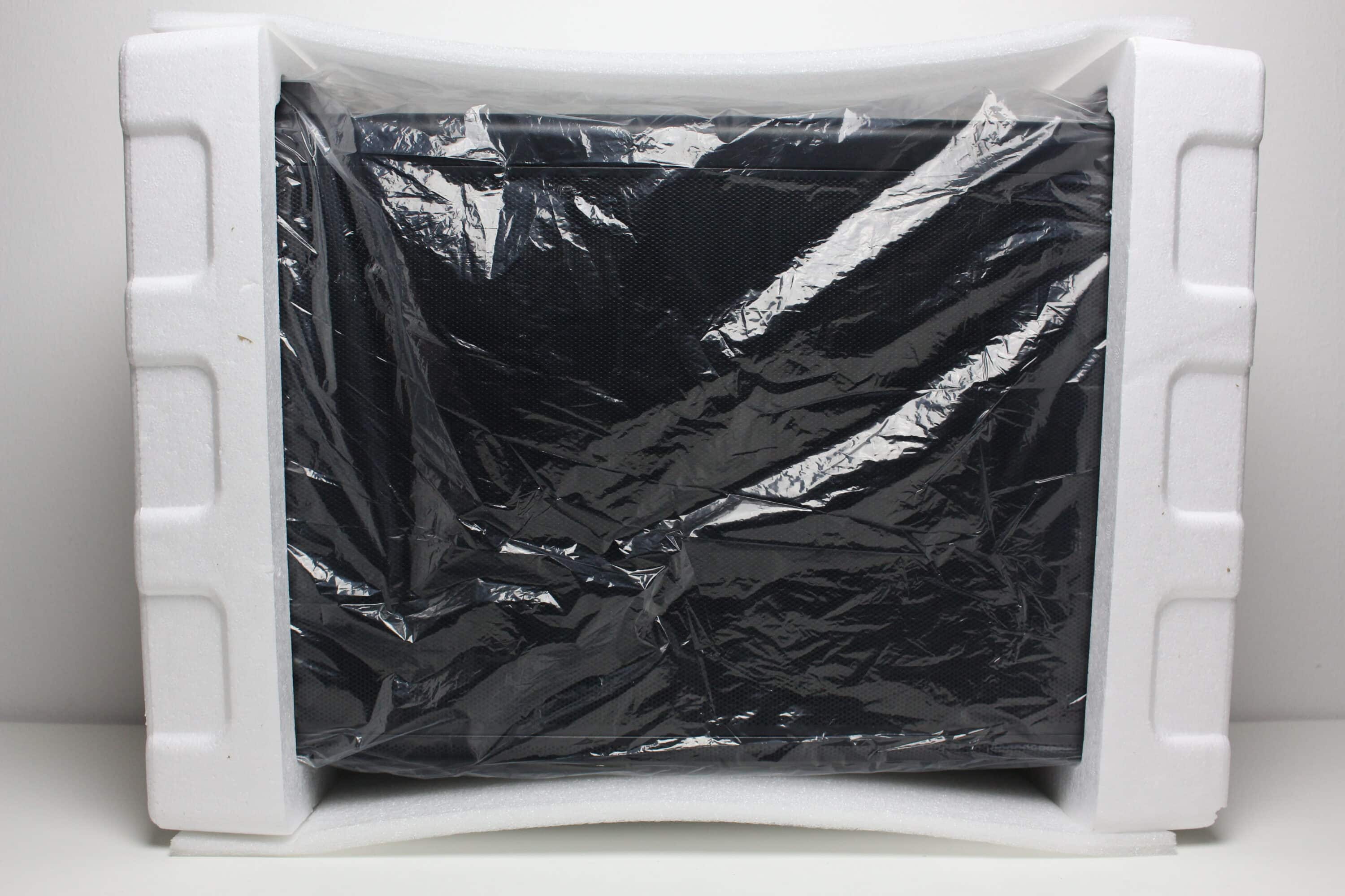 Im Inneren hüllt Lian Li & DAN das A3-mATX in eine Folie aus Kunststoff sowie in zwei Blöcke aus normalem Styropor. Das Styropor hat eine ordentliche Stärke und sollte den Mini-Tower sehr gut vor Beschädigungen schützen. Sämtliches Montagematerial wurde in einer praktischen Sortierbox aus Kunststoff verstaut. Vorhanden sind alle notwendigen Montageschrauben, ein Offset-Montagerahmen für das Netzteil, einige Kabelbinder, Gummiringe für die Festplattenmontage, eine magnetische GPU-Stütze, eine gedruckte Montageanleitung sowie weitere Trennelemente für die Sortierbox.