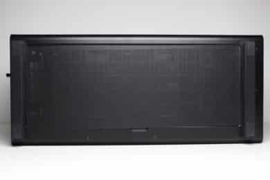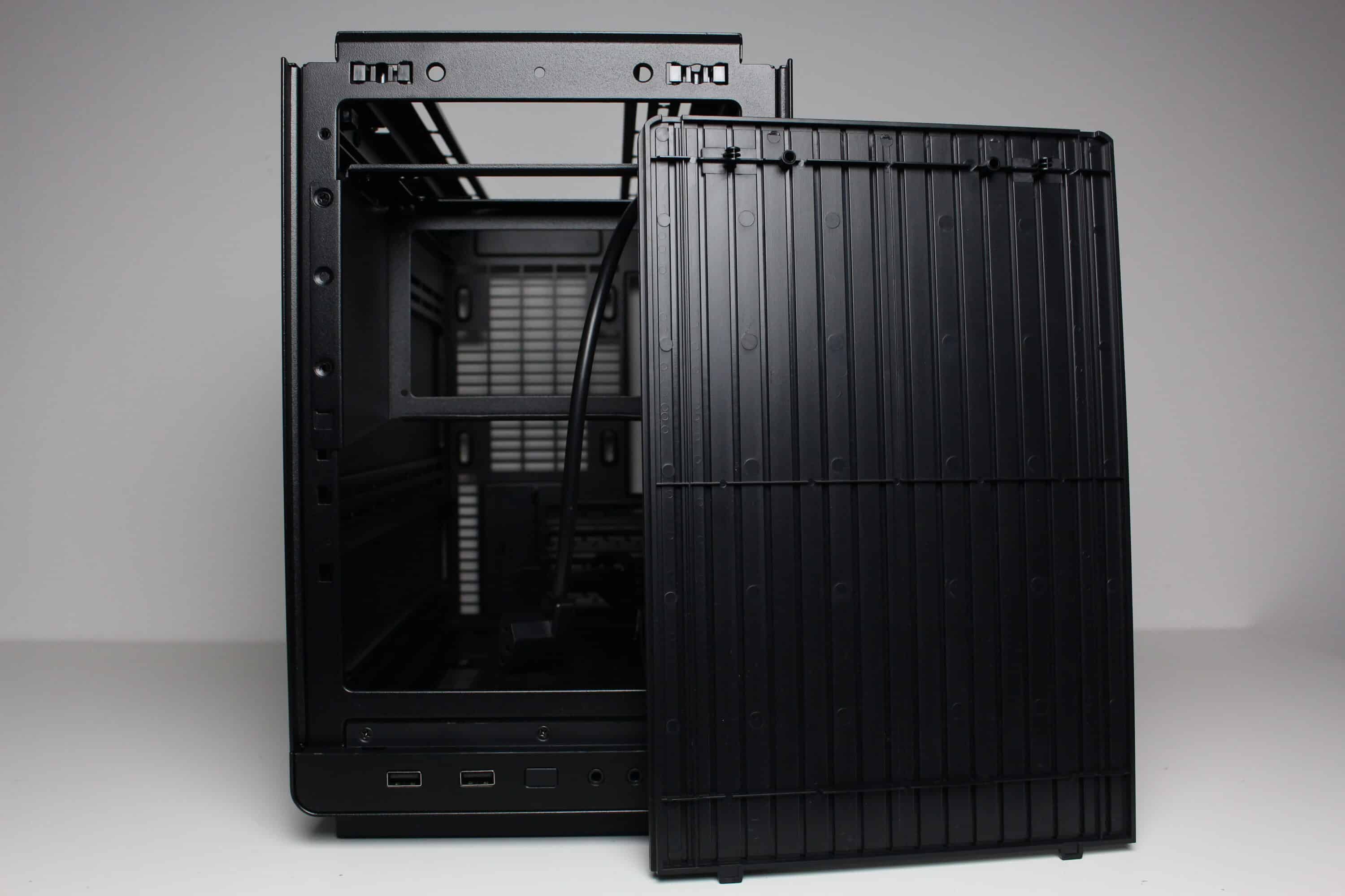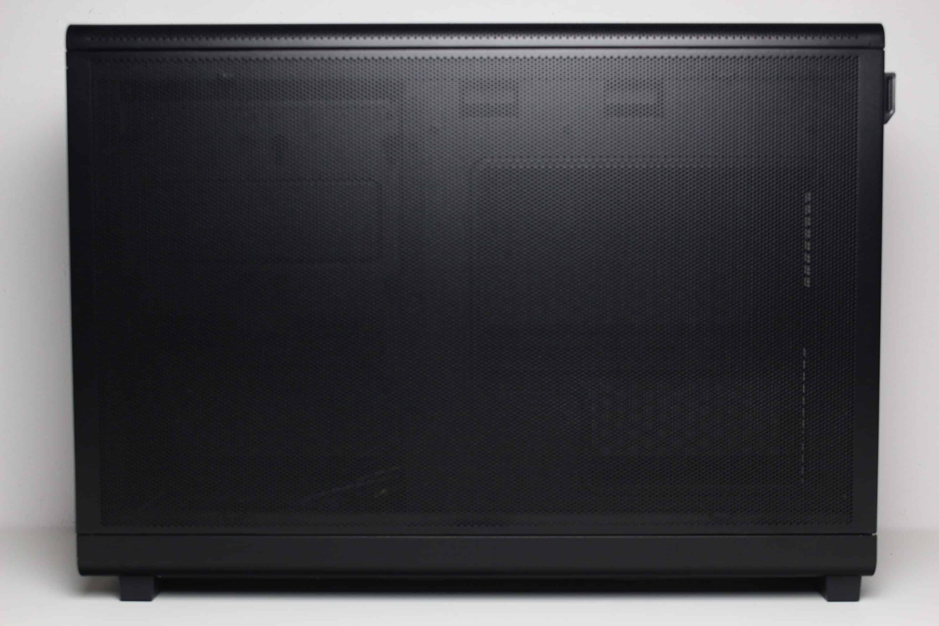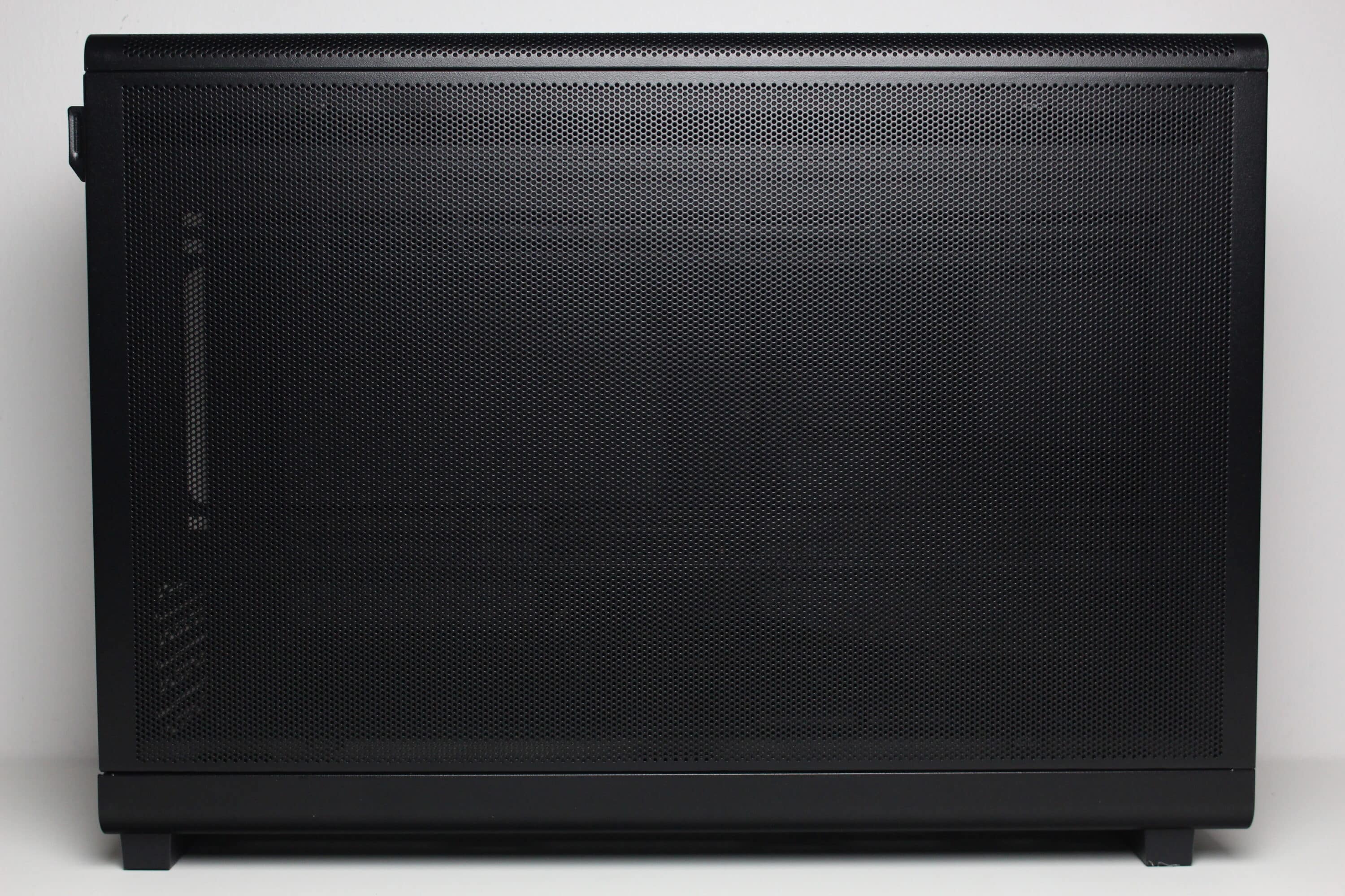 Mit einem großen Fokus auf Kühlung zeichnet sich der Korpus, welcher größtenteils aus Stahl gefertigt ist, durch viele Belüftungsöffnungen und Lüfterplätze aus. Einzig das Frontpanel besteht aus Kunststoff und ist vollständig geschlossen. Das Kunststoffelement ist mit Push-Pins befestigt und lässt sich einfach entfernen. Dahinter befindet sich eine große Öffnung sowie der modular gestaltete Netzteilkäfig.