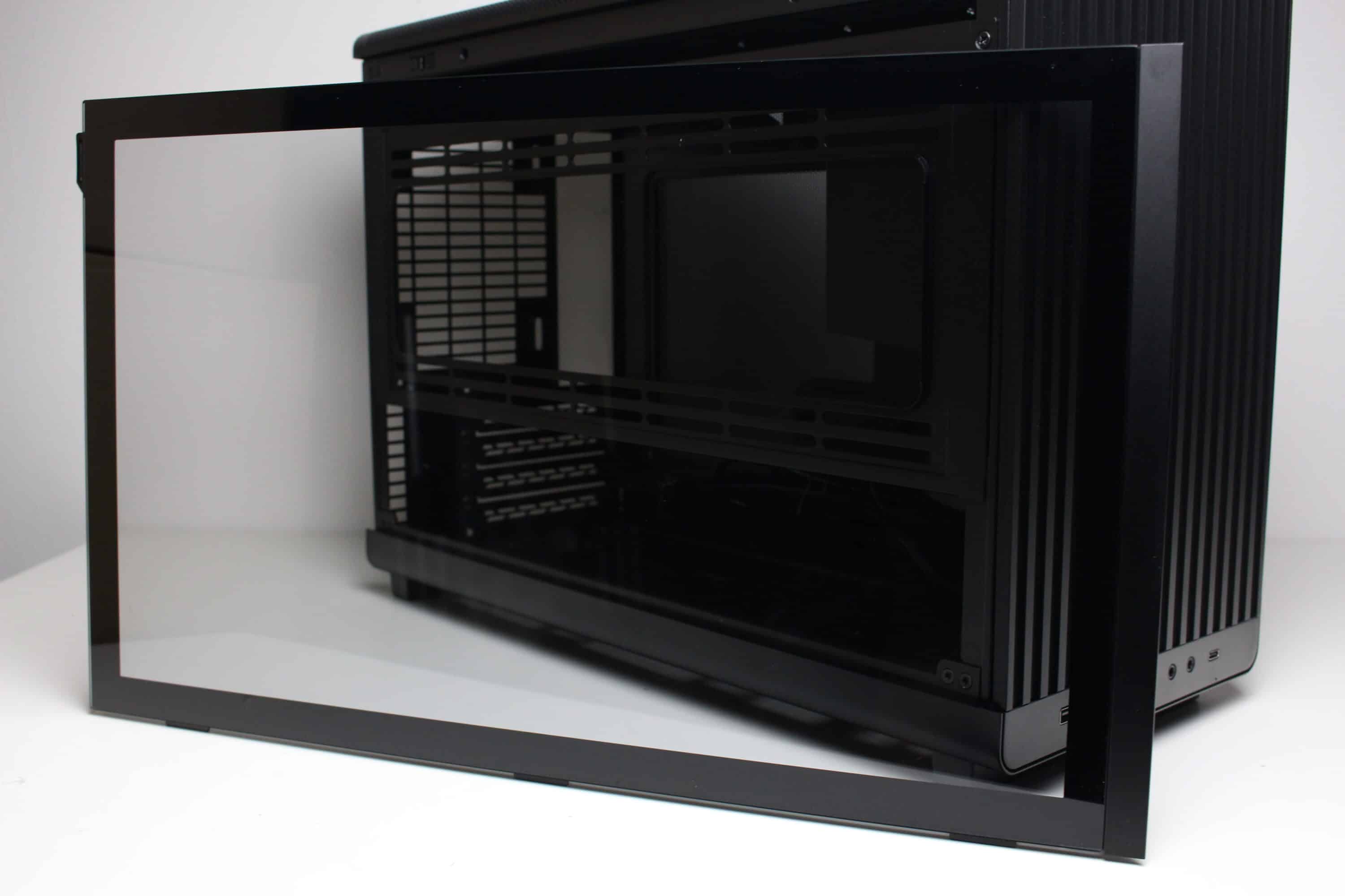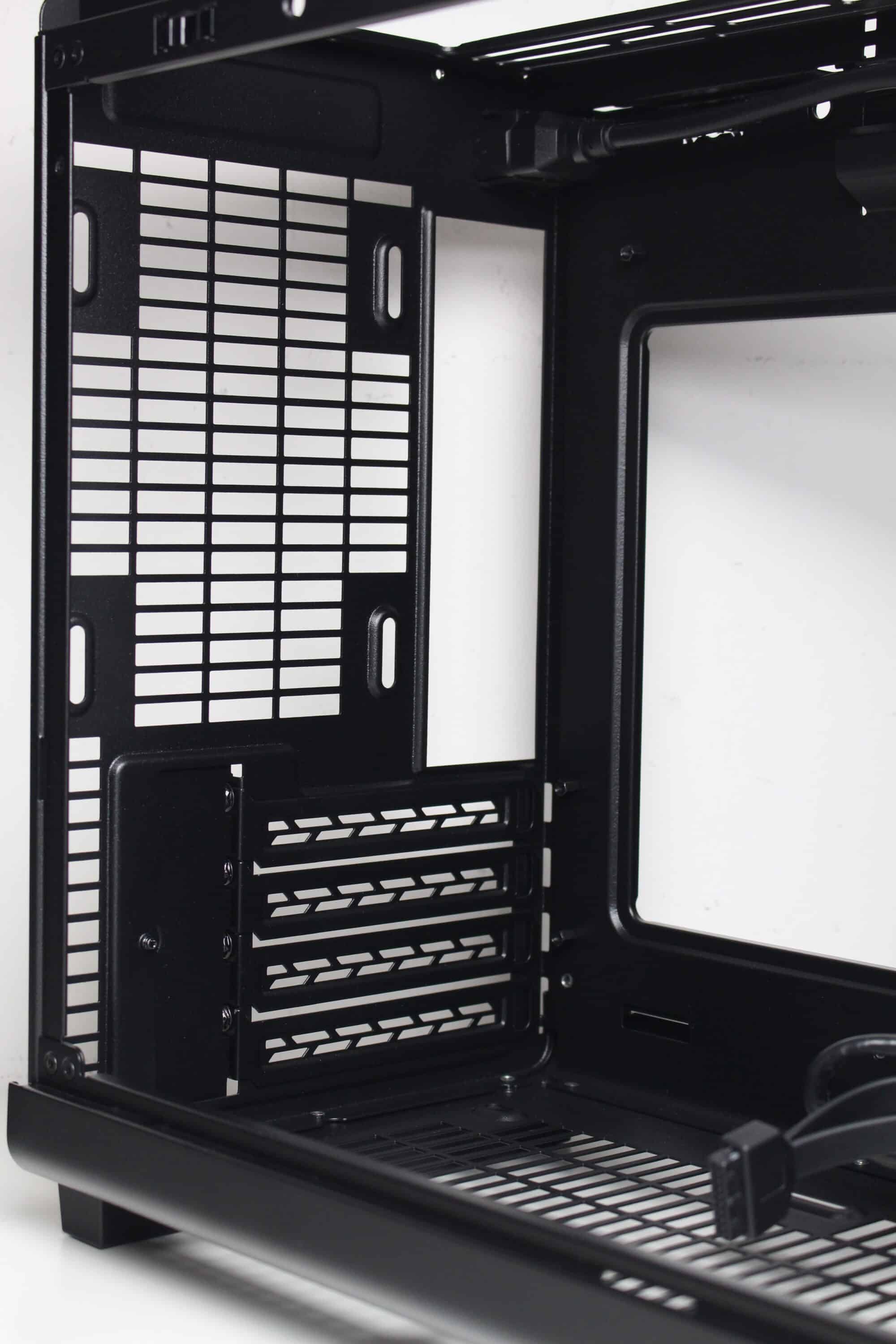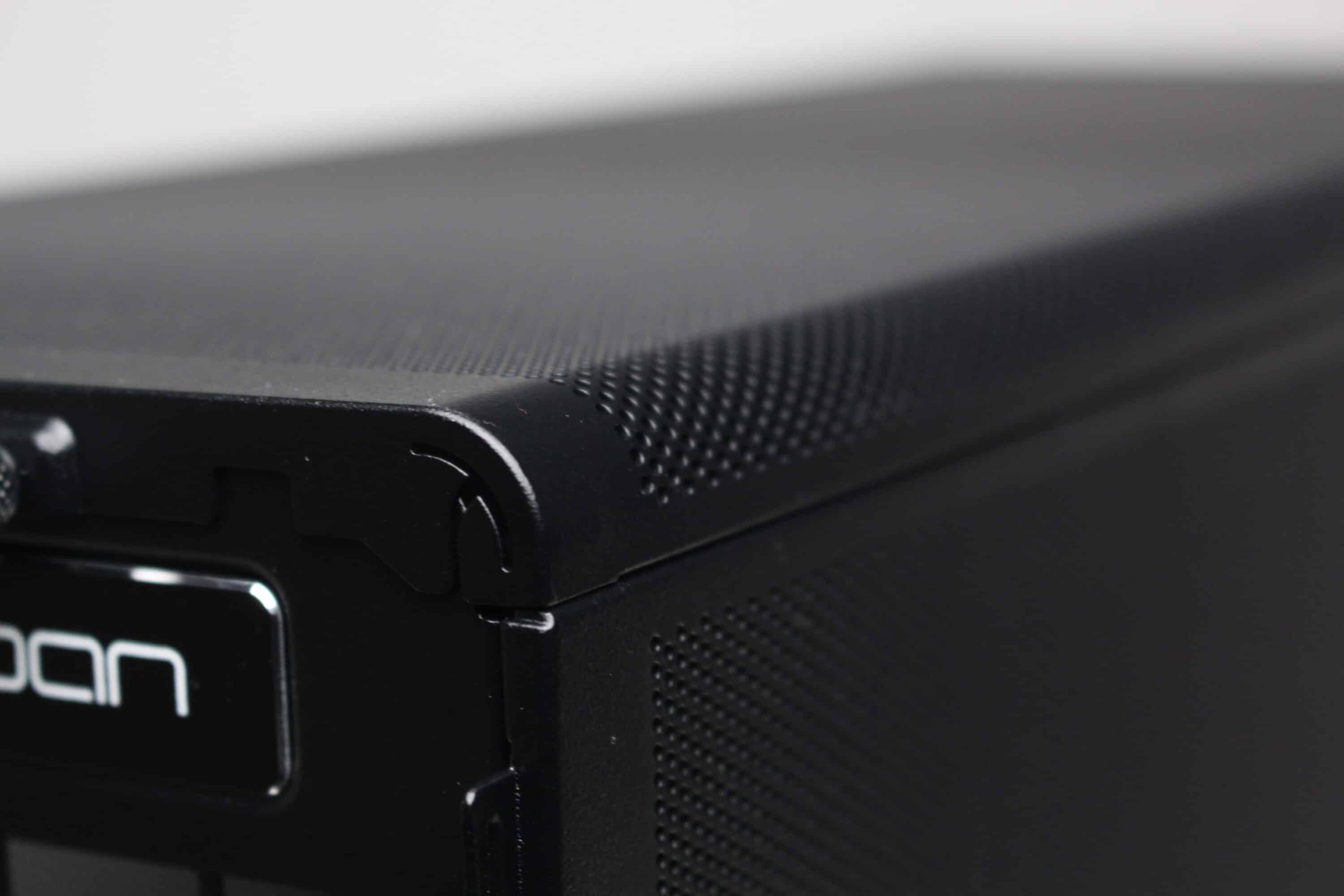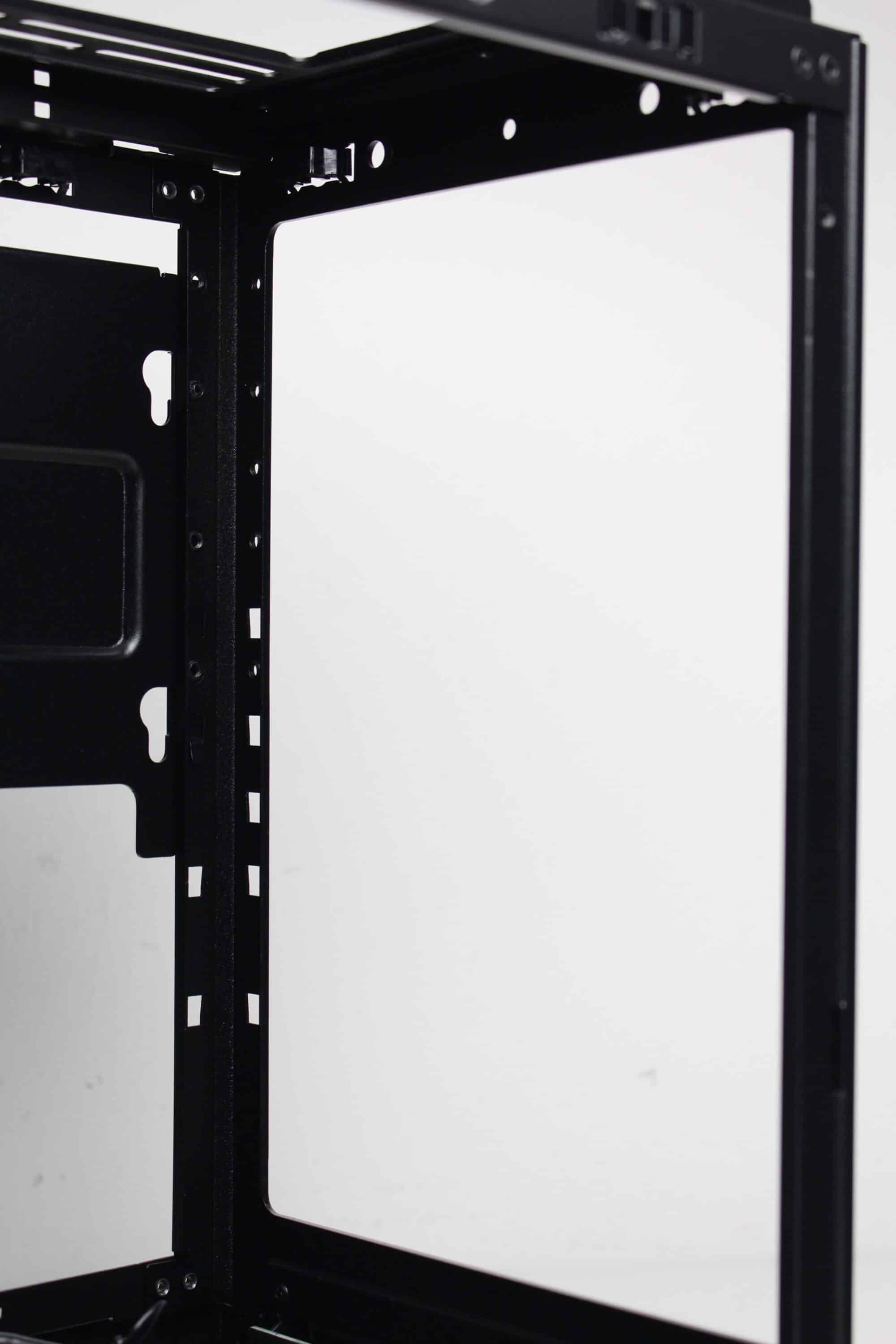Mit einem großen Fokus auf Kühlung zeichnet sich der Korpus, welcher größtenteils aus Stahl gefertigt ist, durch viele Belüftungsöffnungen und Lüfterplätze aus. Einzig das Frontpanel besteht aus Kunststoff und ist vollständig geschlossen. Das Kunststoffelement ist mit Push-Pins befestigt und lässt sich einfach entfernen. Dahinter befindet sich eine große Öffnung sowie der modular gestaltete Netzteilkäfig.
