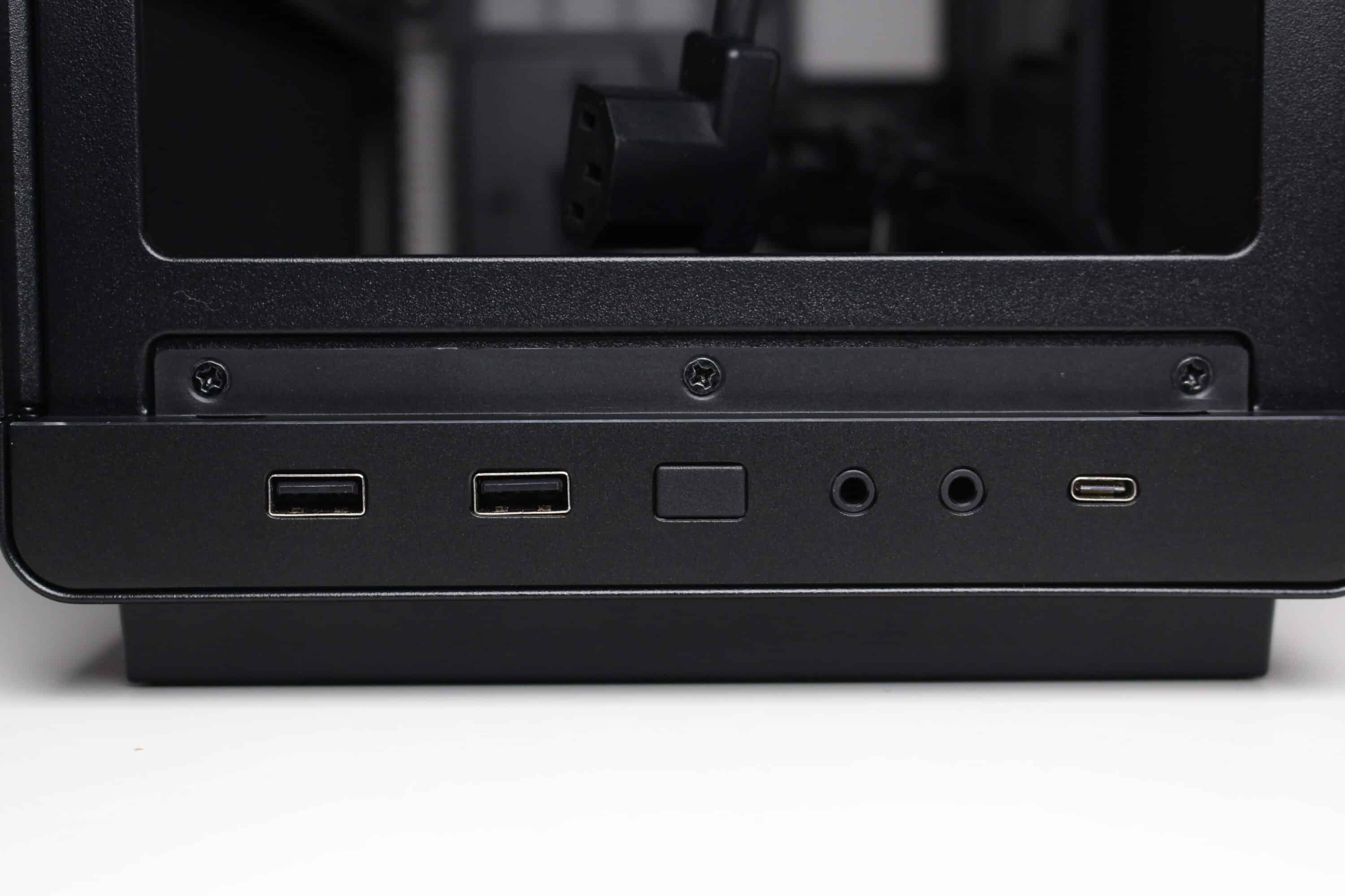 Auch das I/O-Panel platziert der Hersteller an der Front. Ausgestattet wurde es mit insgesamt drei USB-Ports (1x USB-C 3.2, 2x USB-A 3.0) sowie einem Power-Button und zwei Buchsen für Kopfhörer und Mikrofon. Eine gute Ausstattung für ein Gehäuse dieser Preisklasse.