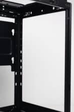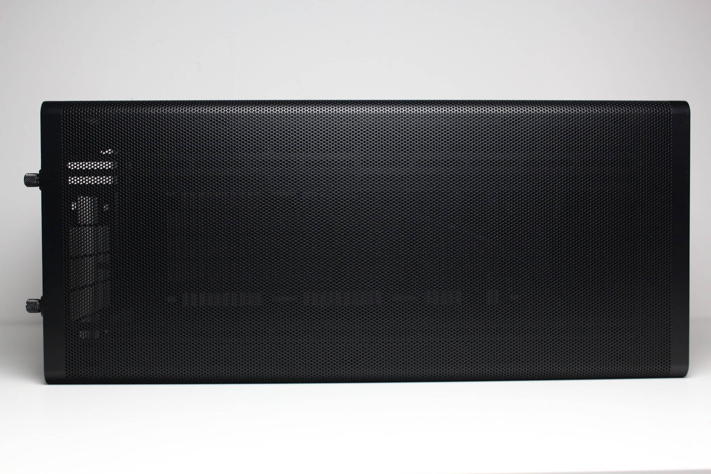 Beide Seitenteile des A3-mATX bestehen aus Stahl und verfügen großflächig über ein Meshgitter, welches optisch den Öffnungen im Deckel nachempfunden ist. Die Befestigung am Korpus erfolgt über Push-Pins aus Stahl sowie Aufnahmen aus Kunststoff. Kleine Griffflächen an der Rückseite der Sidepanels erlauben zudem eine einfache Demontage beim Zusammenbau. Auf Staubfilter muss man an den Seitenteilen aber ebenfalls verzichten. Optional bietet der Hersteller für die linke Seite auch ein Seitenfenster aus Tempered Glass an. Dieses ist in der schwarzen Variante leicht getönt und wird ebenfalls mittels Push-Pins befestigt.