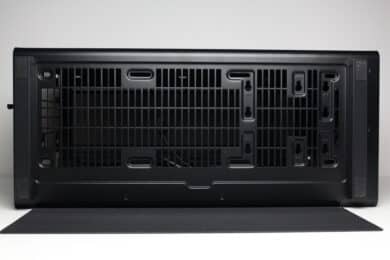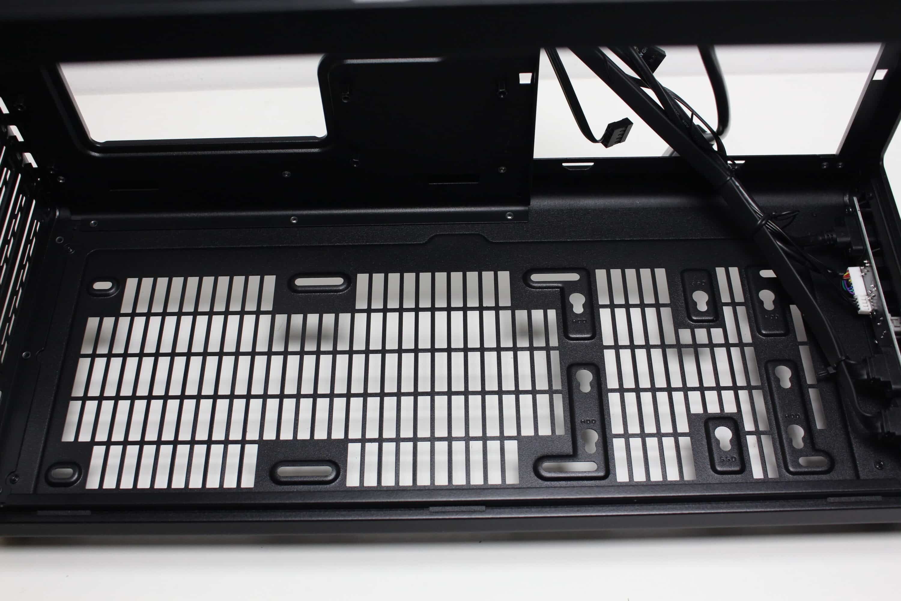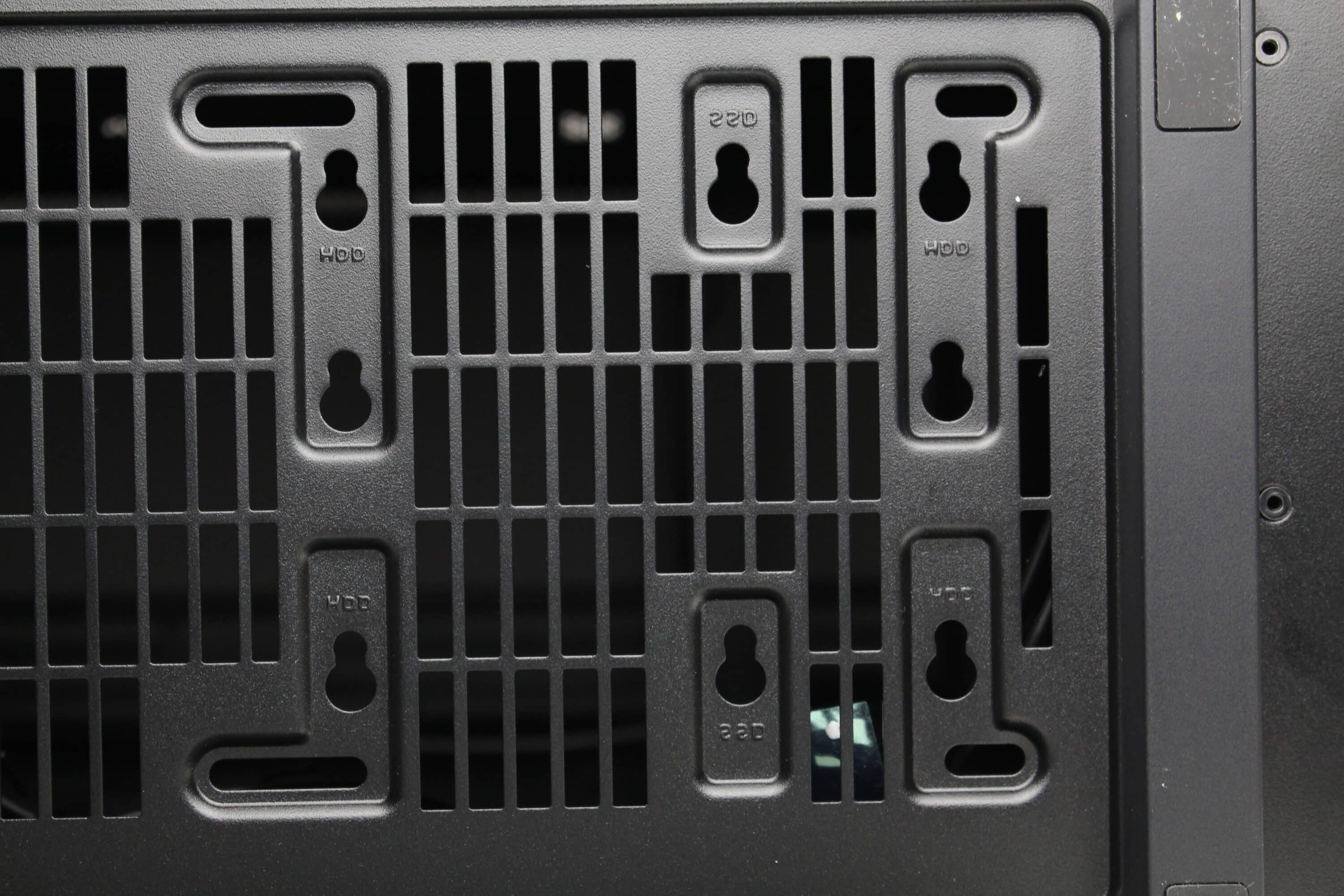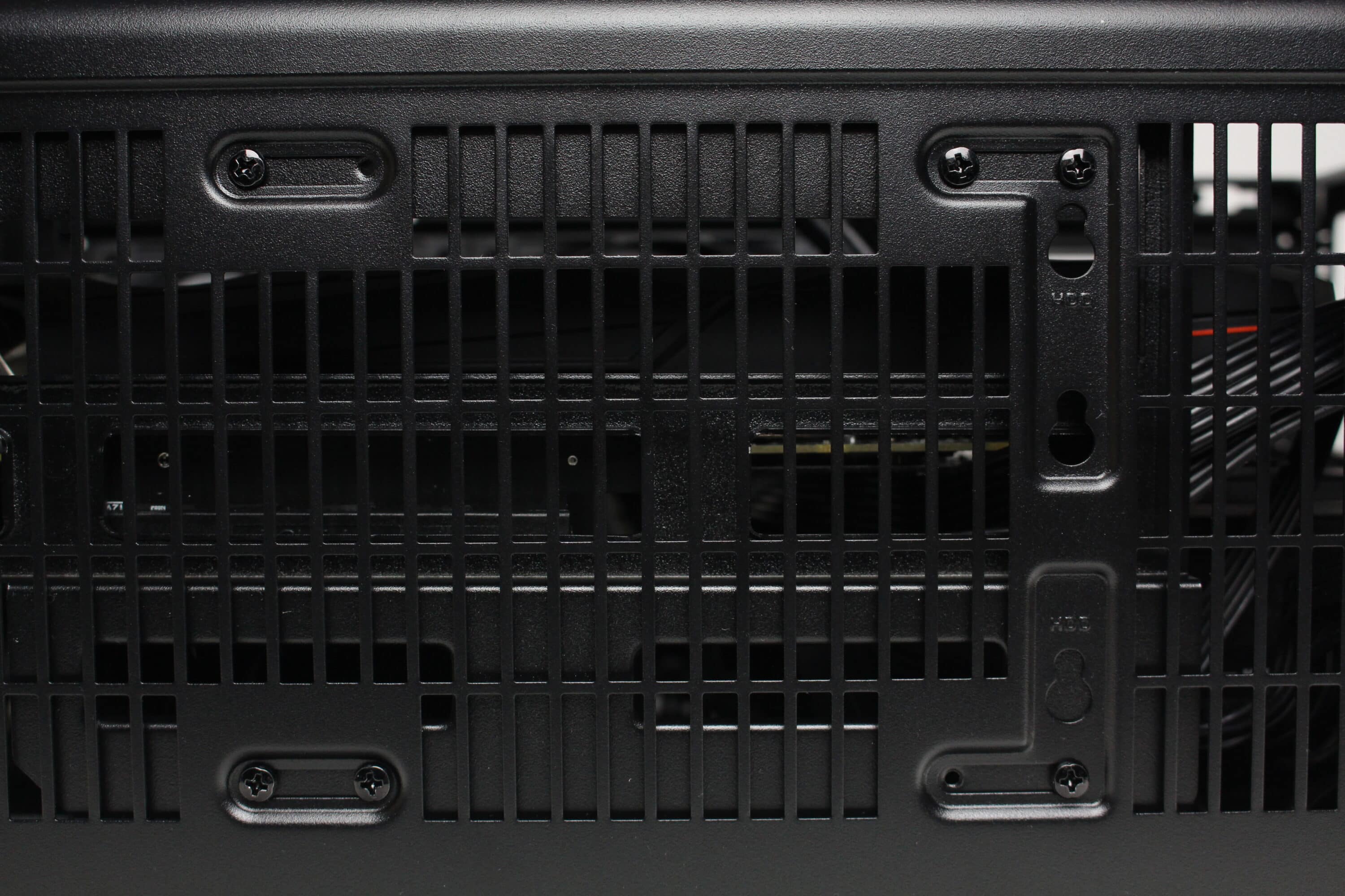 Wie bereits erwähnt, verfügt das A3-mATX an der Rückseite über einen unbestückten Lüfterplatz und vier wiederverwendbare Slotblenden, deren Verschraubung von außen erfolgt. Im vorderen Bereich lassen sich ein modularer Netzteil- sowie SSD-Rahmen erkennen. Der Boden im Innenraum ist plan gestaltet, wurde mit einer großzügigen Belüftungsöffnung ausgestattet und bietet Platz für drei 120-mm-Lüfter oder zwei Lüfter und einen Datenträger.