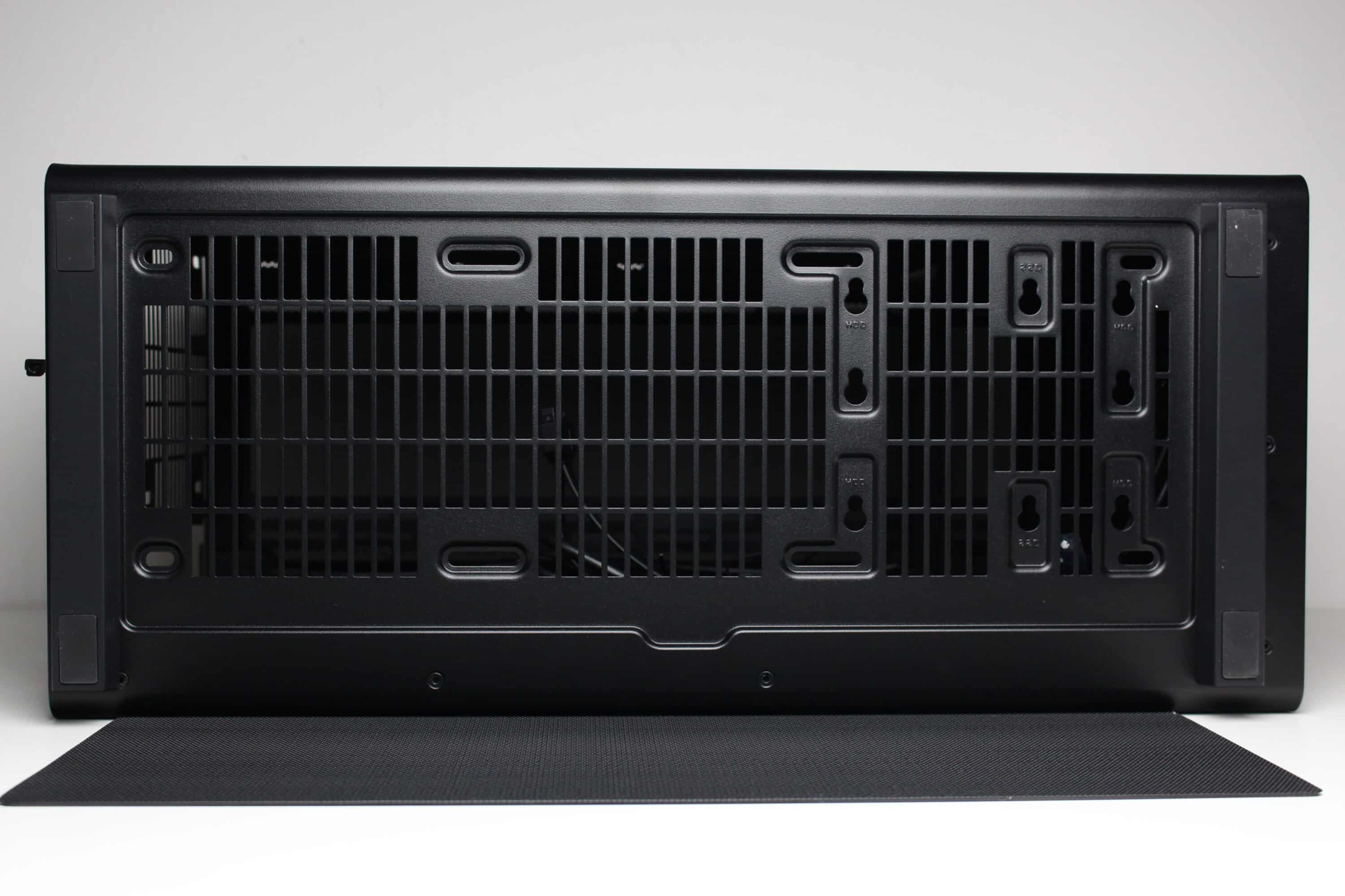 Für einen sicheren Stand sorgen beim A3-mATX zwei längliche Füße aus Kunststoff, die im vorderen sowie hinteren Bereich der Unterseite befestigt und zur Vibrationsreduzierung mit jeweils zwei Streifen aus Gummi beklebt wurden. Weiterhin lässt sich auch hier eine große Belüftungsöffnung mit Montagepunkten für bis zu drei 120-mm-Lüfter erkennen. Darüber platziert der Hersteller zuletzt noch einen feinen Meshfilter, der über Magnetstreifen an der Unterseite befestigt werden kann.