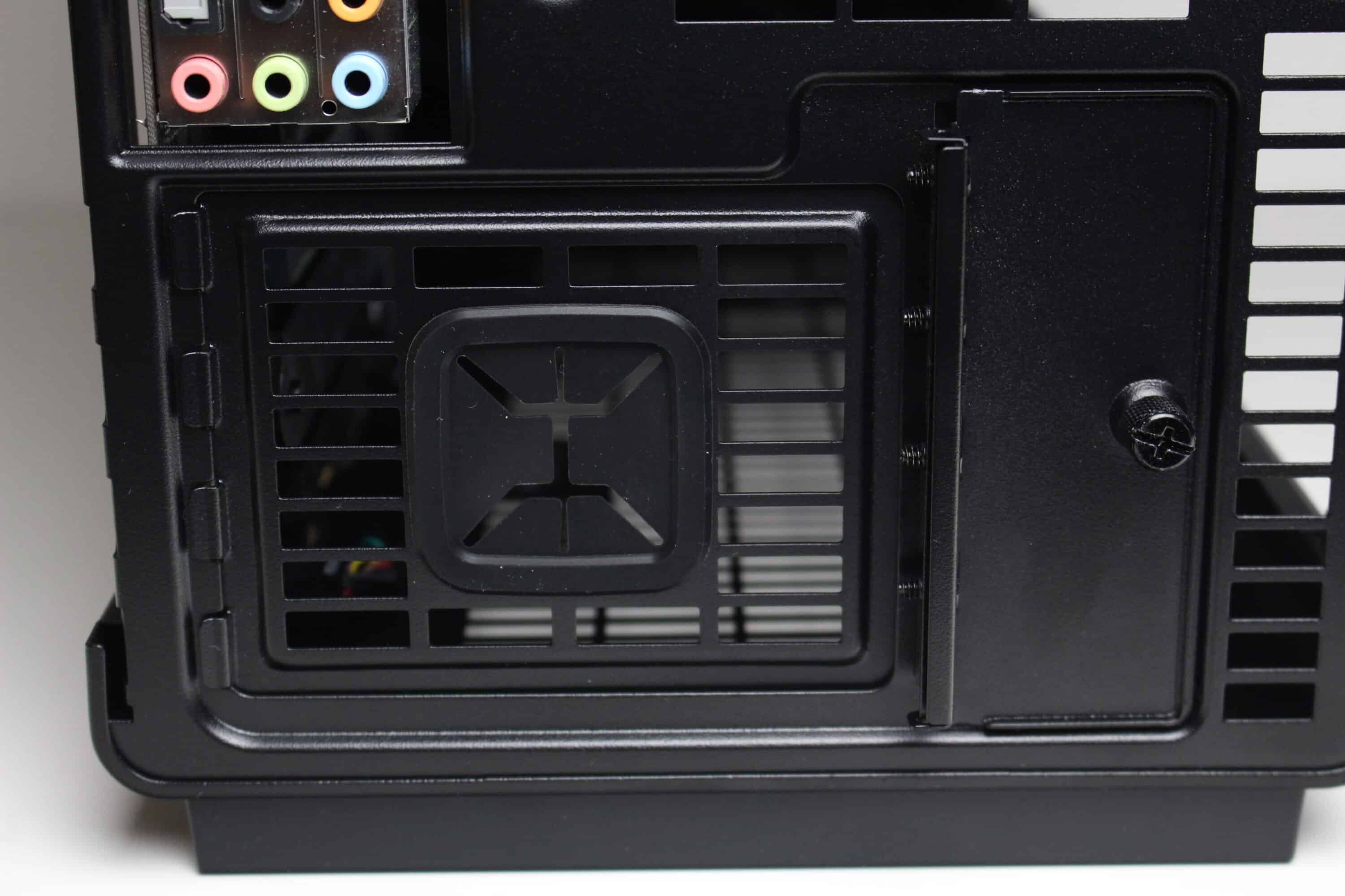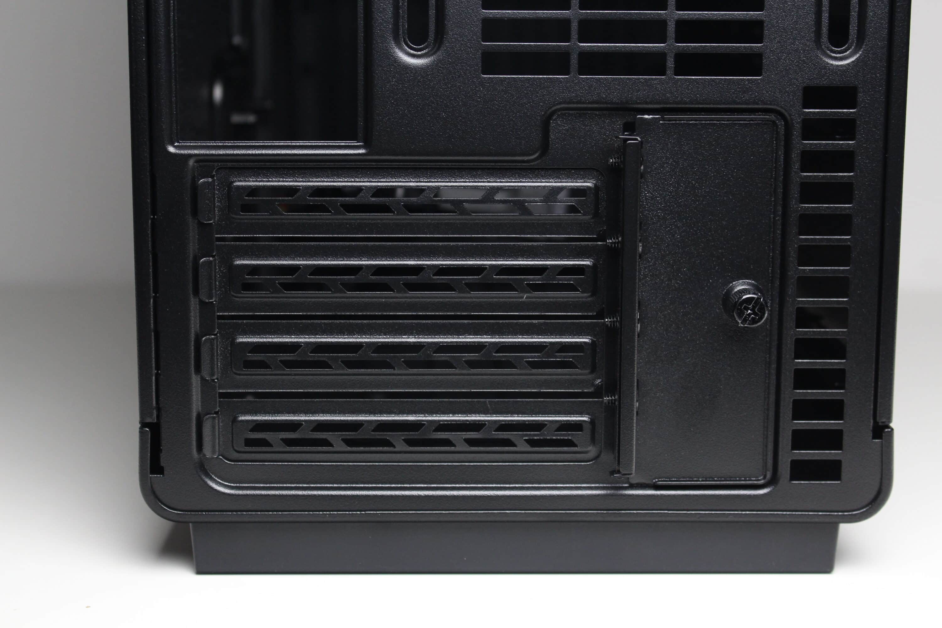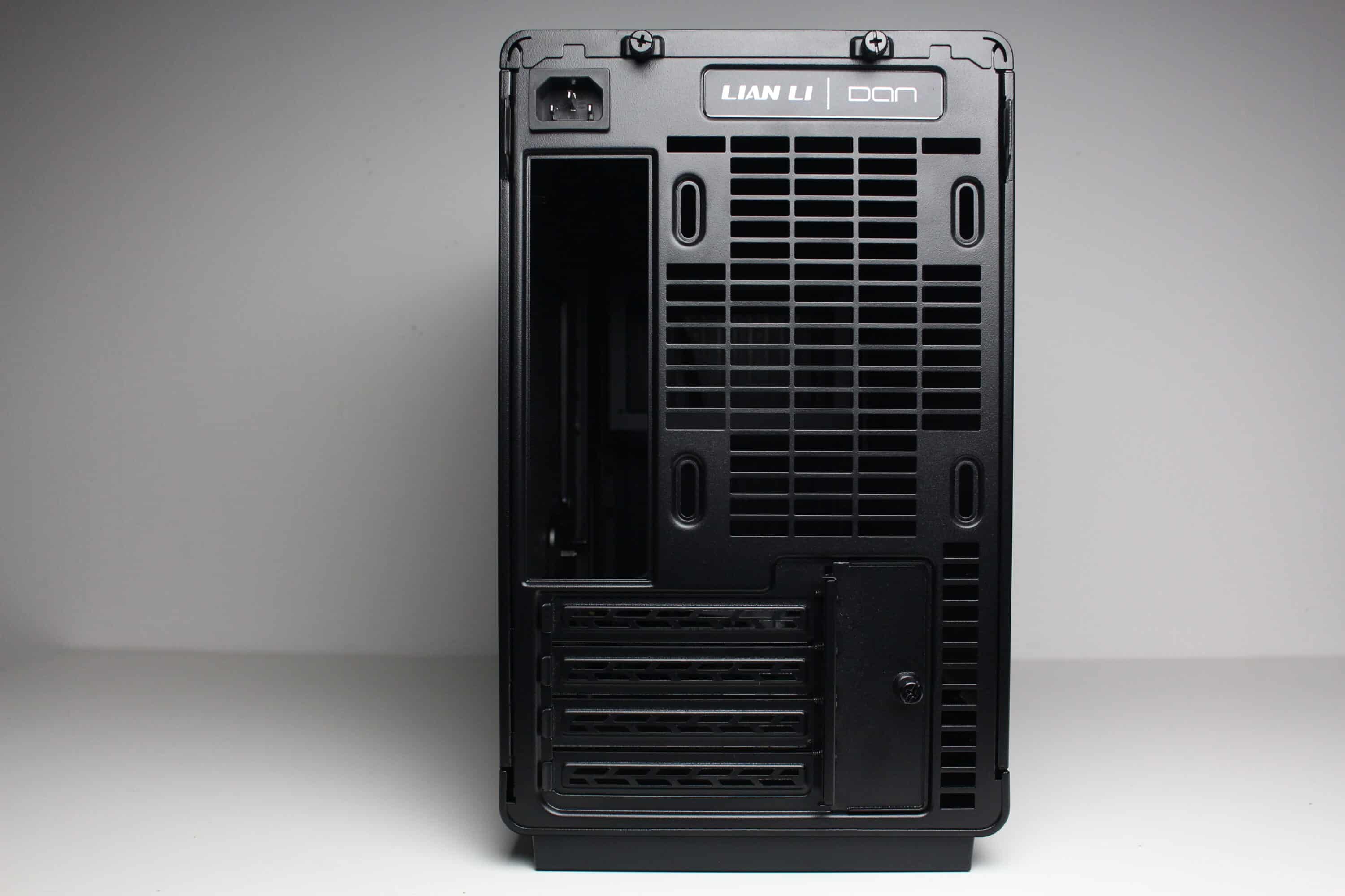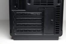 An der Rückseite zeigt sich ein fast übliches Erscheinungsbild für einen Mini-Tower. Neben vier Erweiterungsslots im unteren Bereich lassen sich auch der Ausschnitt für das I/O-Shield des Mainboards sowie ein unbestückter Montageplatz für einen 120-mm-Lüfter erkennen. Was beim A3-mATX an der Rückseite fehlt, ist die Montageposition für ein Netzteil. Stattdessen lässt sich hier lediglich eine Buchse für das Kaltgerätekabel erkennen.