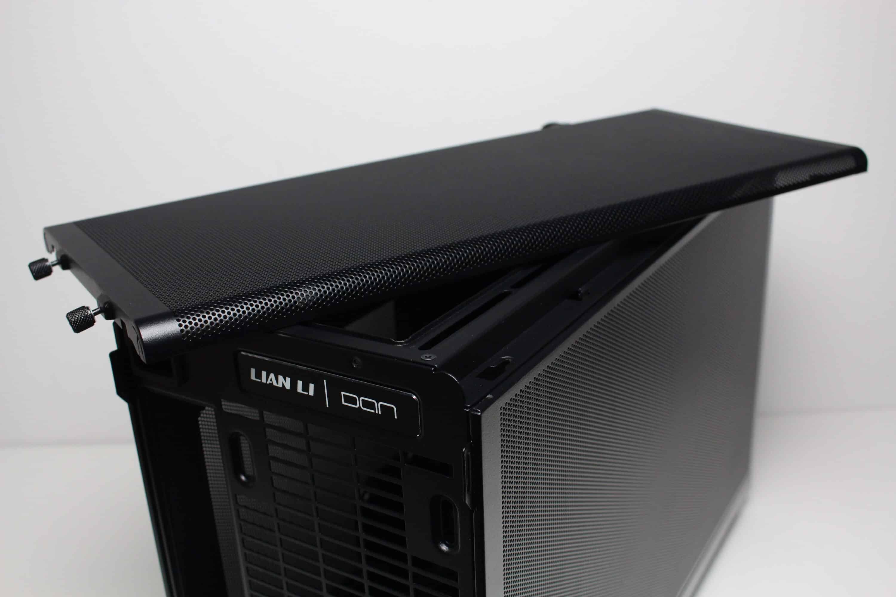 Die Deckelpartie des Lian Li & DAN A3-mATX ist ebenfalls mit Fokus auf eine gute Belüftung ausgelegt worden. So verfügt diese über sehr viele, runde Öffnungen, bei denen jedoch auf einen Staubfilter verzichtet wurde. Die Ecken der Deckelplatte sind dabei etwas abgerundet, wodurch das A3-mATX weniger klobig wirkt. Unterhalb der modularen Deckelplatte verbaut der Hersteller einen Montagerahmen für drei 120- oder zwei 140-mm-Lüfter. Der Rahmen gehört jedoch fest zum Korpus und kann nicht entfernt werden.