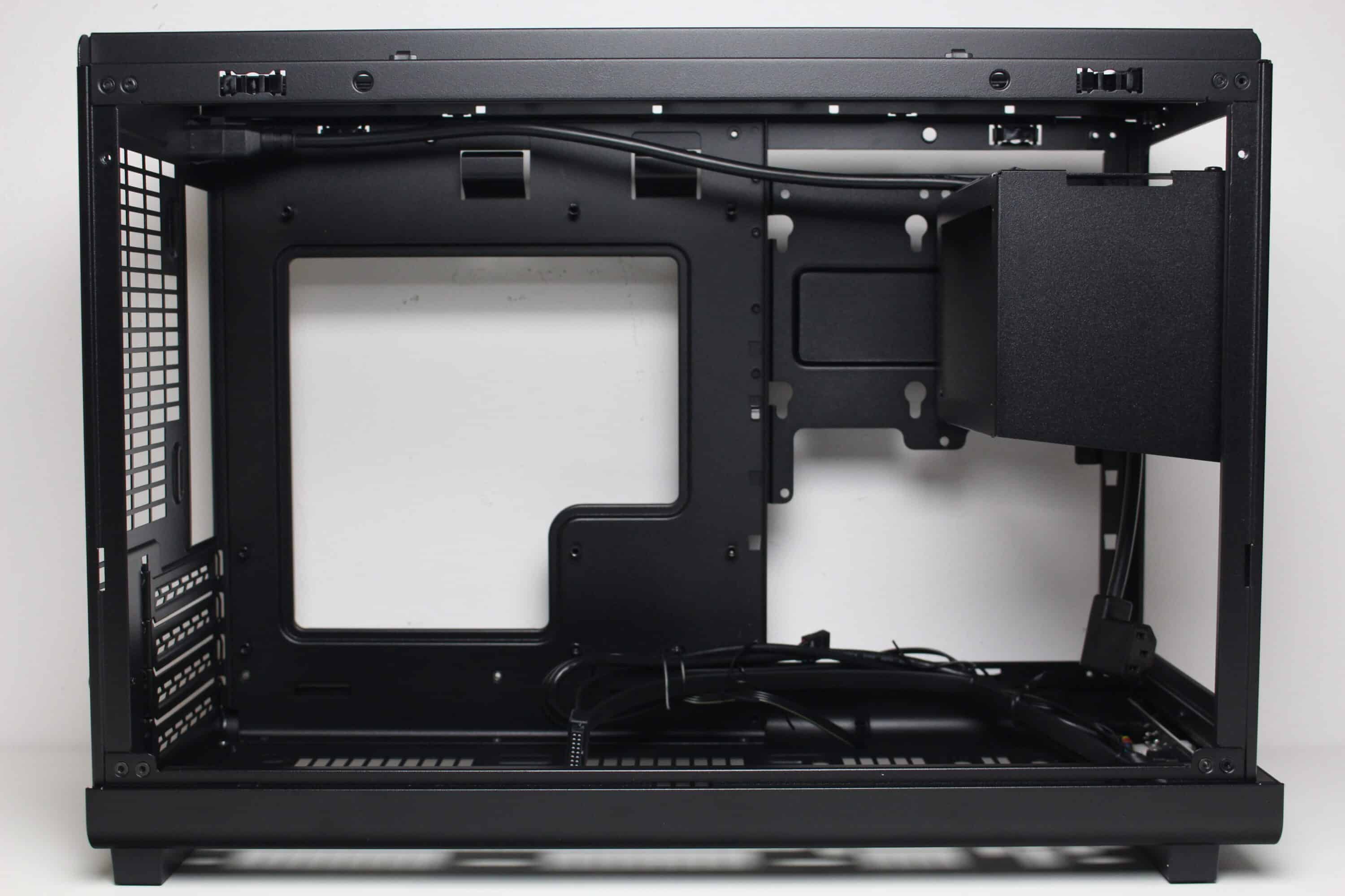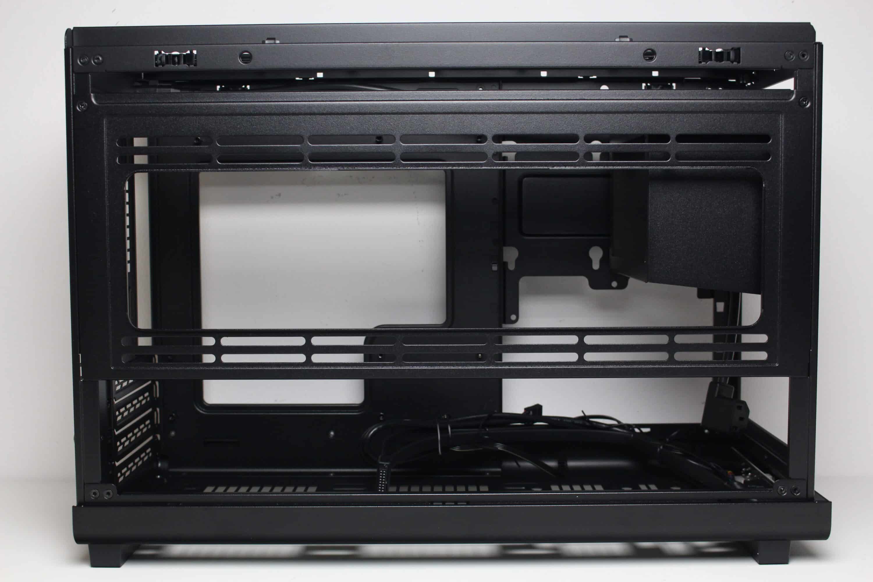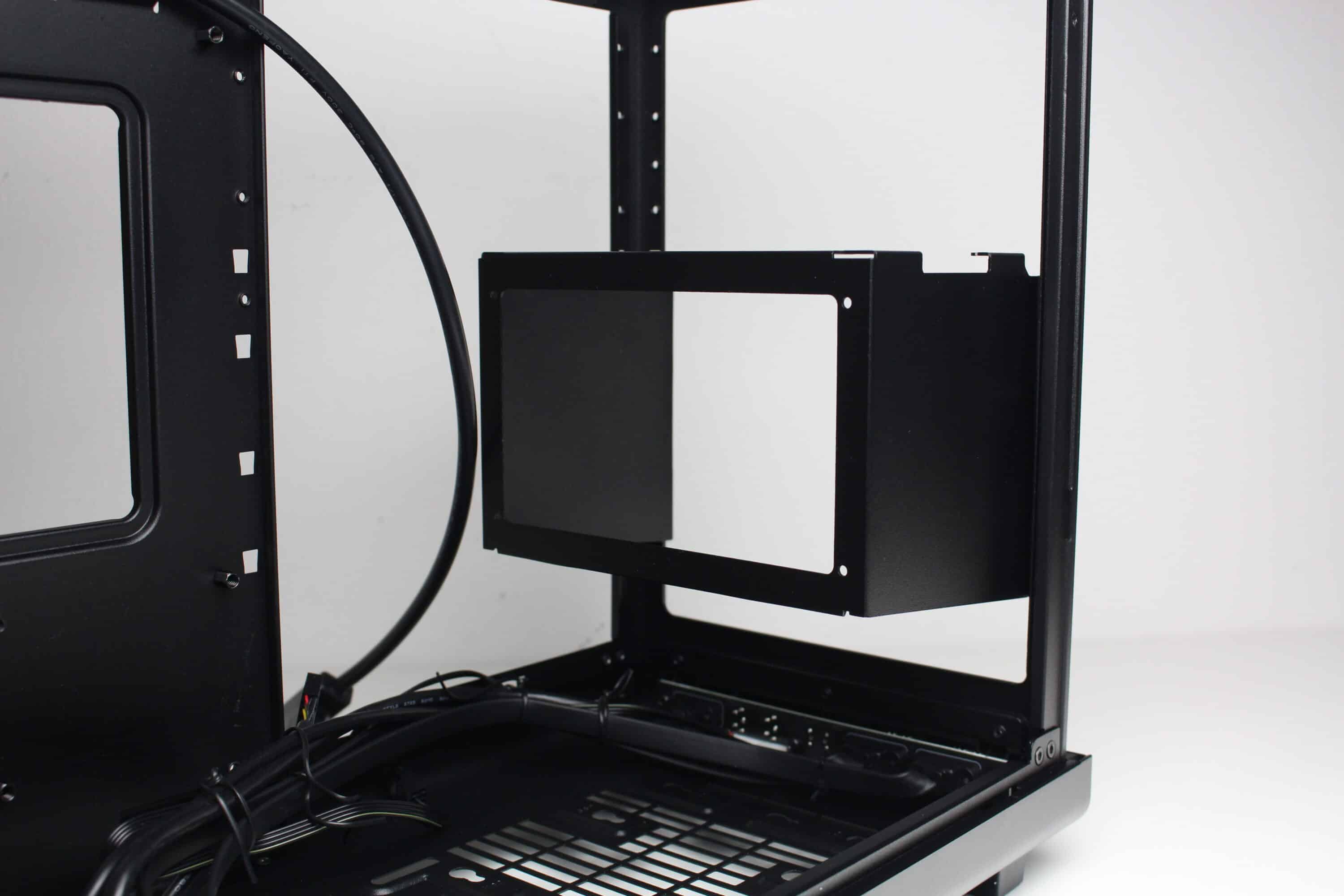 Der Innenraum des Lian Li & DAN A3-mATX besteht aus einer großen Hauptkammer mit Platz für ein µATX-Mainboard, eine lange 3-Slot-Grafikkarte sowie ein SFX(-L)- oder ATX-Netzteil. Vor der Kammer ist ab Werk noch ein Lüfterrahmen für drei 120-mm- oder zwei 140-mm-Lüfter befestigt, der nach dem Lösen von zwei Schrauben aufgeklappt und entfernt werden kann. Das Mainboard-Tray ist plan gestaltet und verfügt oberhalb über zwei Klammern für das Netzteilkabel. Zusätzliche Kabelmanagementöffnungen oder Ösen für Kabelbinder gibt es nicht.