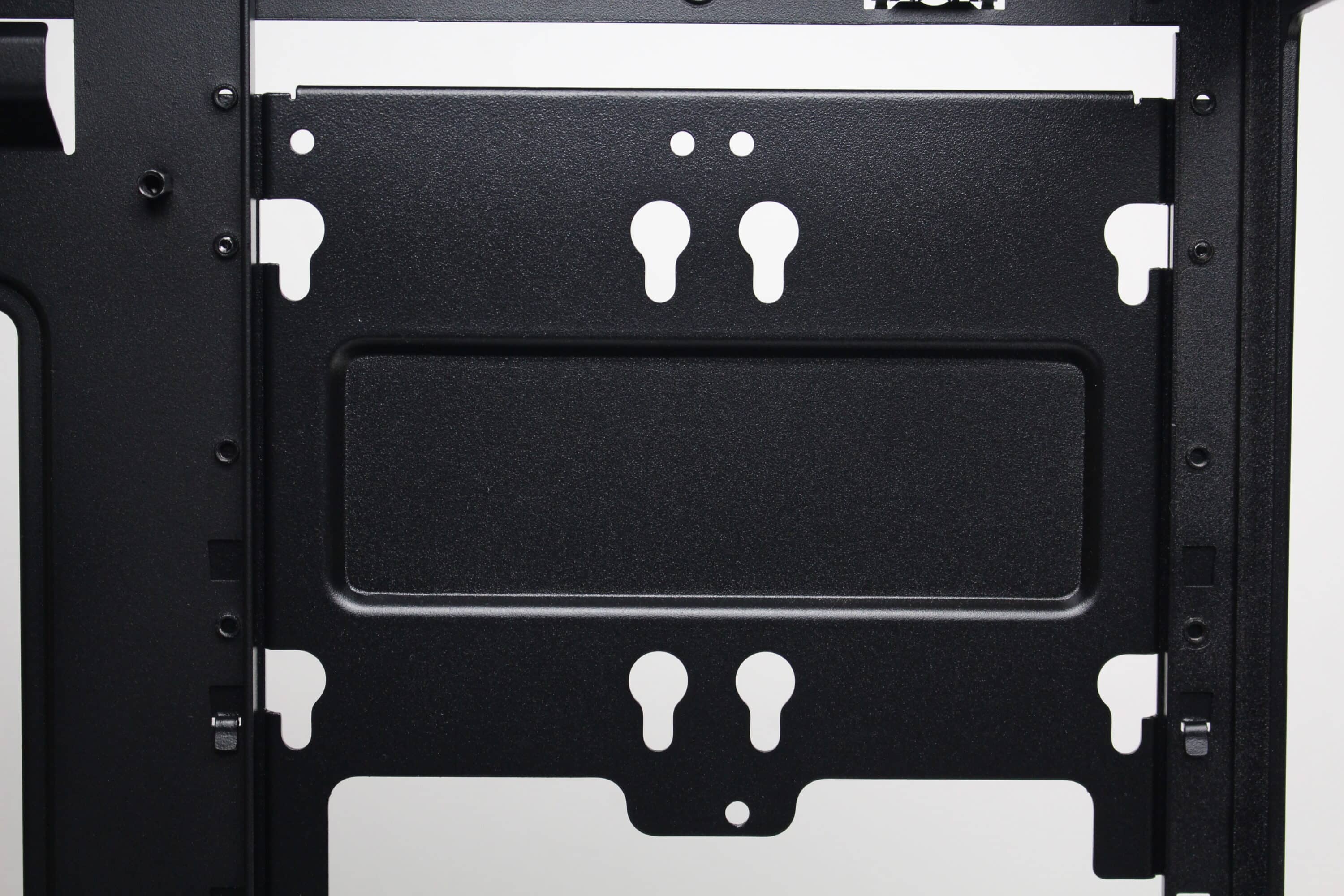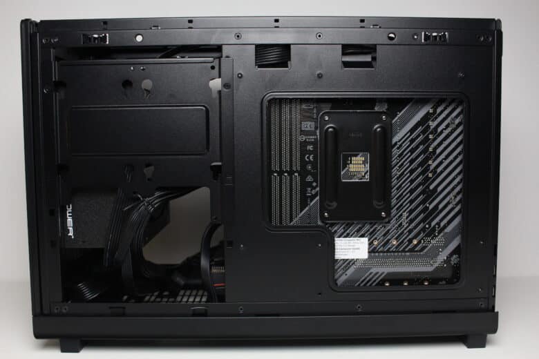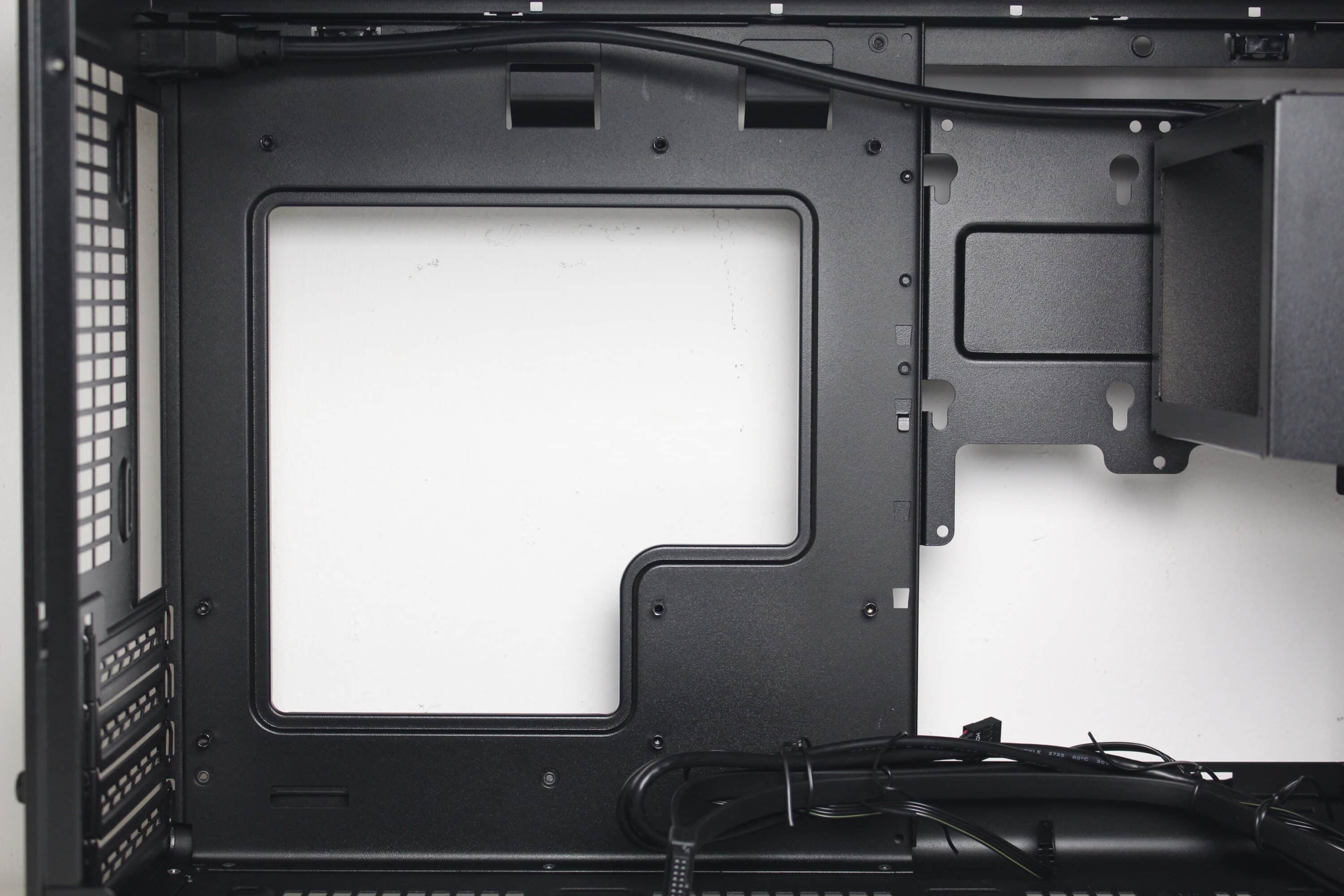 An der Rückseite des Mainboard-Trays bleibt es unspektakulär. So gibt es hier weder Kabelmanagementöffnungen noch besonders viel Platz für Kabel. Außer für die erstmalige Systemmontage muss man das rechte Seitenteil vermutlich nie wieder entfernen. Dennoch stattet der Hersteller das Tray mit einer Öffnung aus, die eine nachträgliche Montage von CPU-Kühlern mit Backplate ermöglicht.
