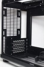 Weiterhin bietet die Hauptkammer zwei unterschiedliche Montagepunkte für den modularen Netzteilkäfig oder den SSD-Halterahmen. Montageposition 1 befindet sich im vorderen Bereich des Innenraums, direkt hinter dem Frontpanel, und Montageposition 2 implementiert der Hersteller rechts neben dem Mainboard-Tray. Der SSD-Rahmen bzw. der Netzteilkäfig können deshalb in bis zu neun verschiedenen Positionen platziert werden. Das sorgt für maximale Flexibilität.