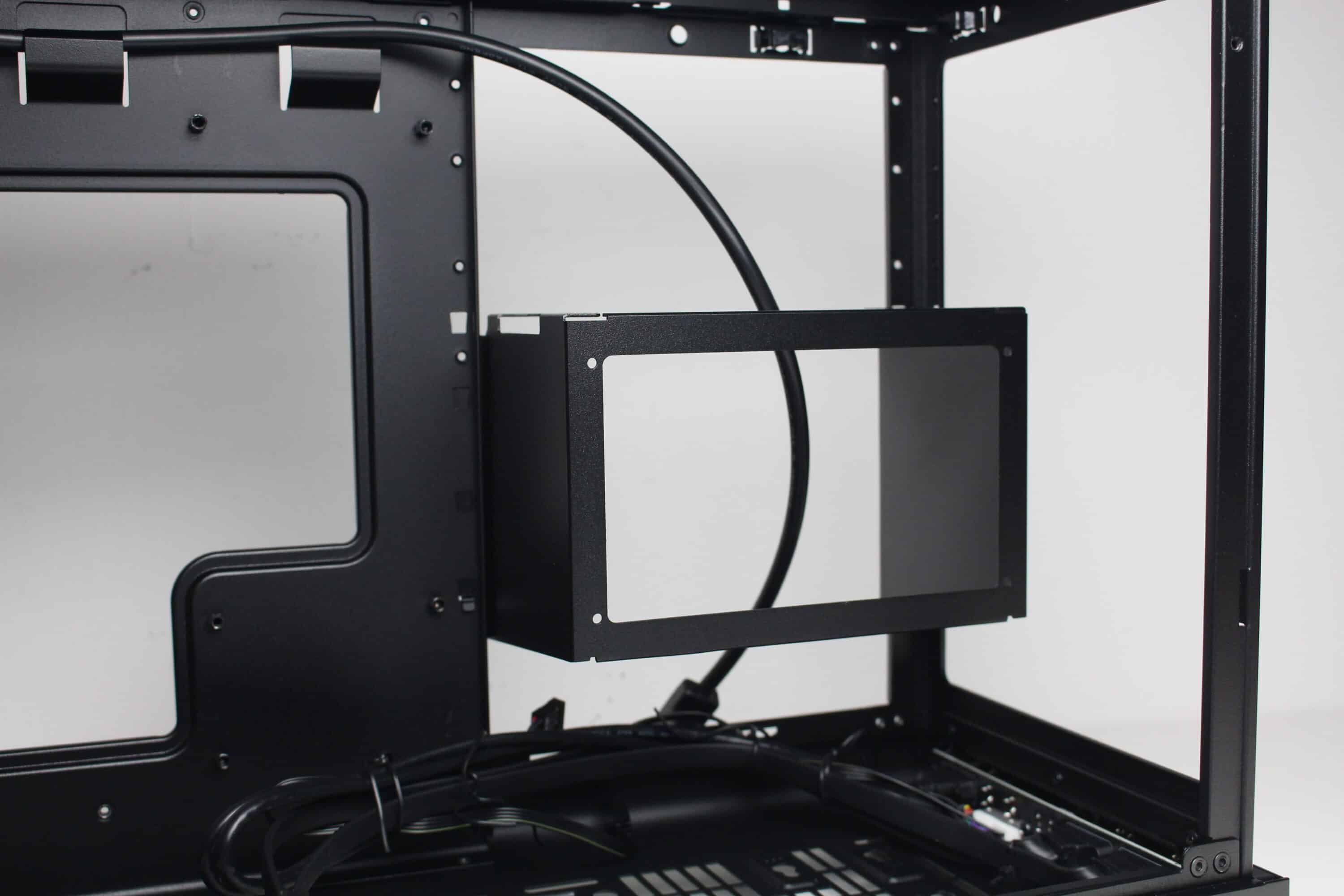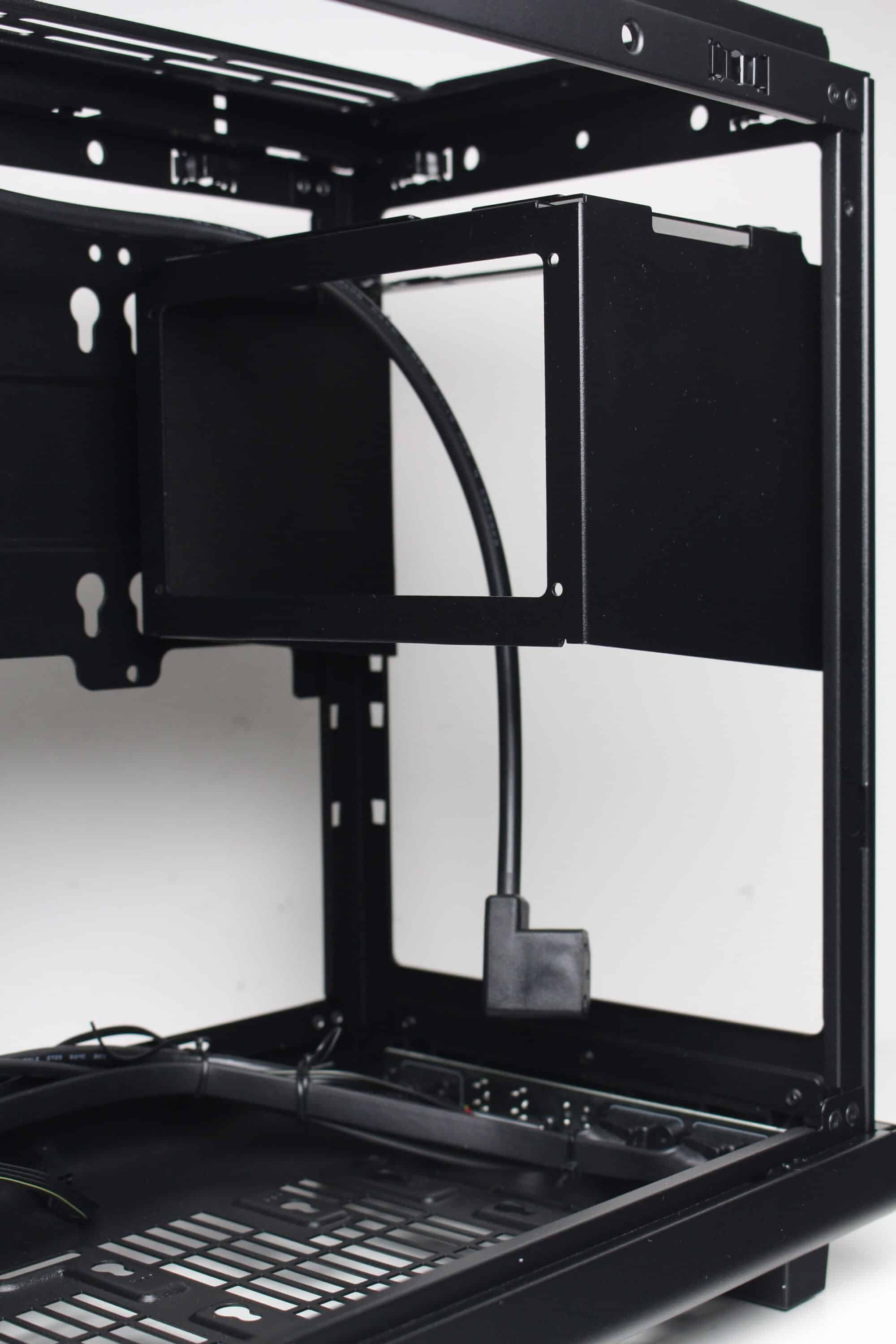Für Datenträger bietet das Lian Li & DAN A3-mATX nicht besonders viel Platz. So verfügt der Mini-Tower über einen Halterrahmen aus Stahl, an welchem zwei 2,5″-SSDs befestigt werden können. Je nach Montageposition des Netzteils kann der Stahlrahmen an der Front oder am Mainboard-Tray befestigt werden. Zusätzlich verfügt der Boden über einen Montageplatz für einen 3,5″- oder 2,5″-Datenträger. In diesem Fall müsste man aber auf einen 120-mm-Lüfter verzichten. Dafür erfolgt die Datenträgermontage immer entkoppelt.