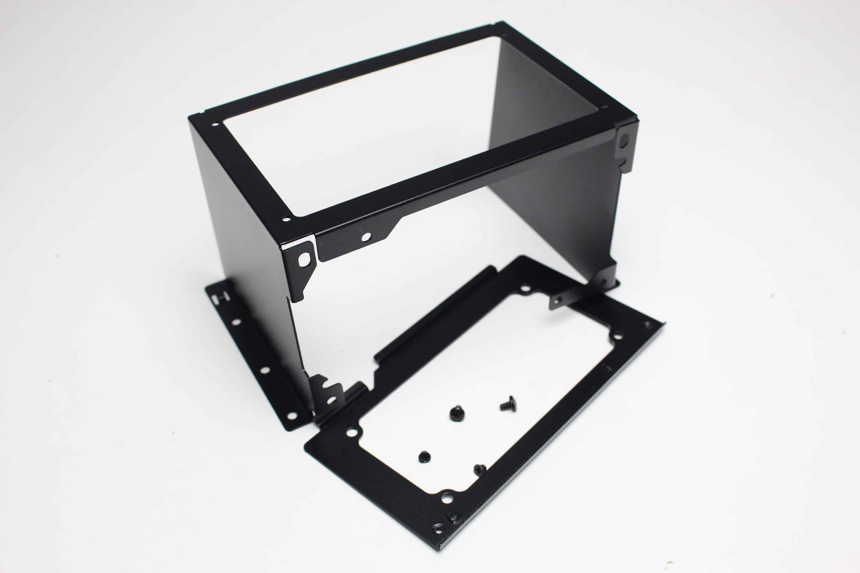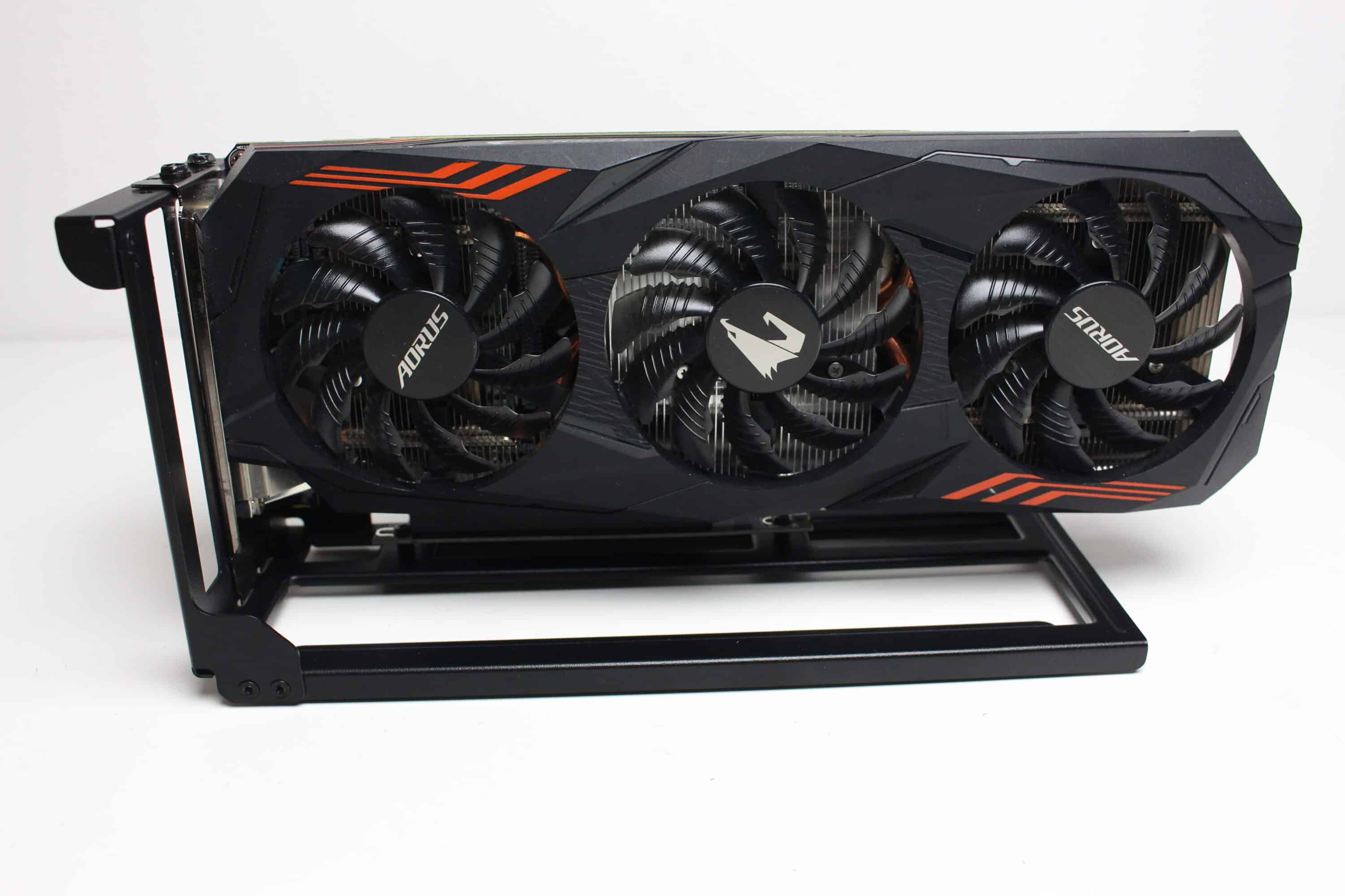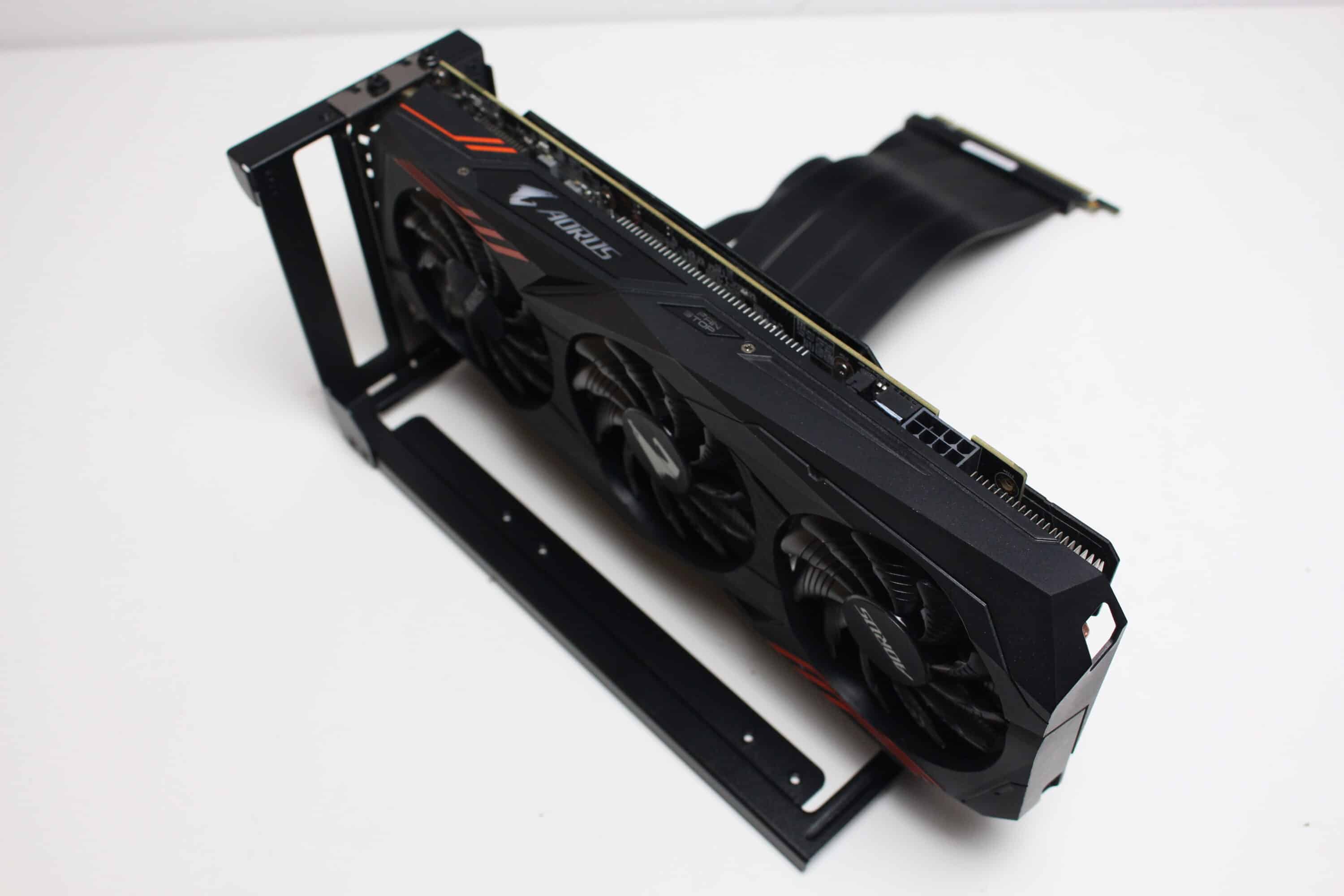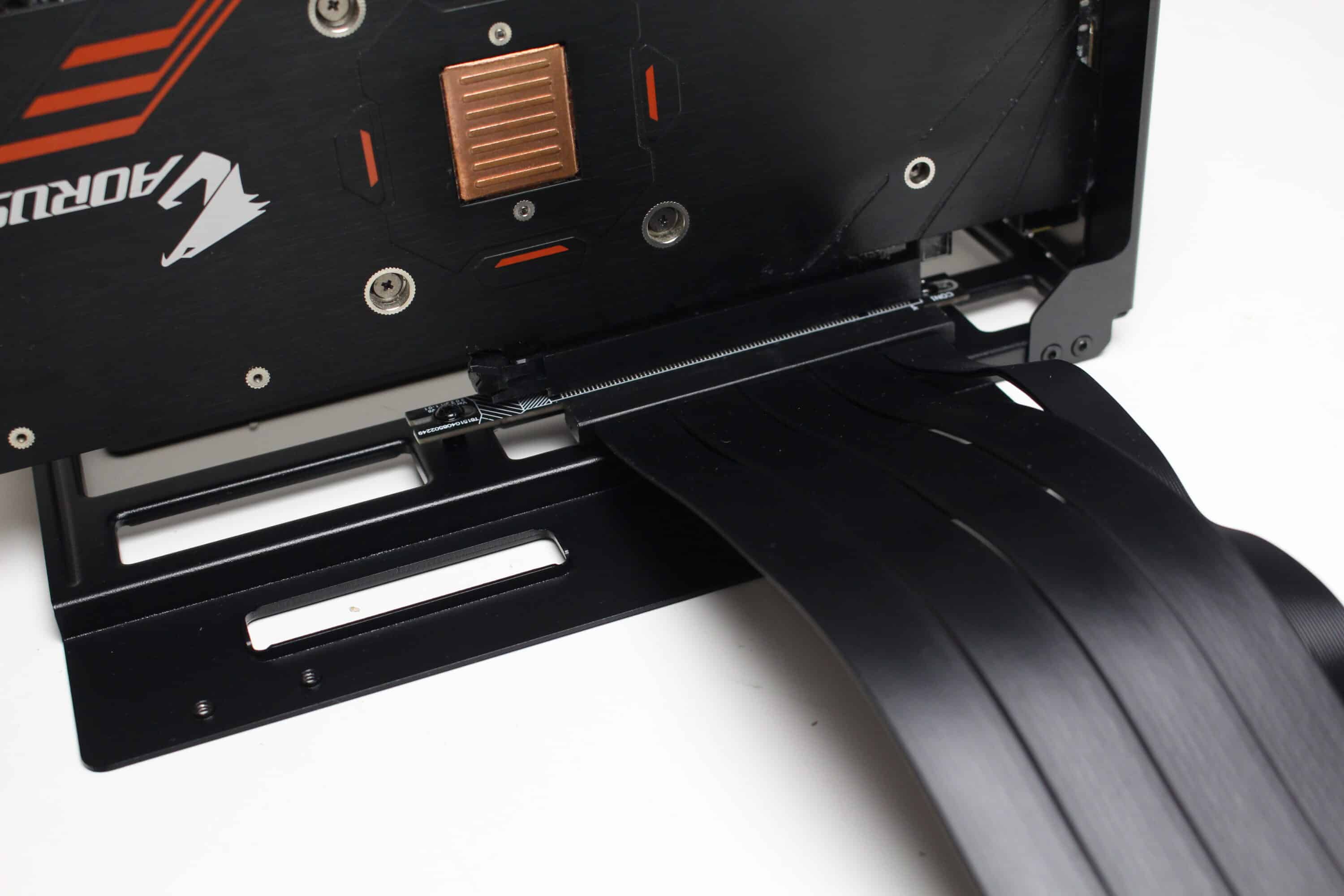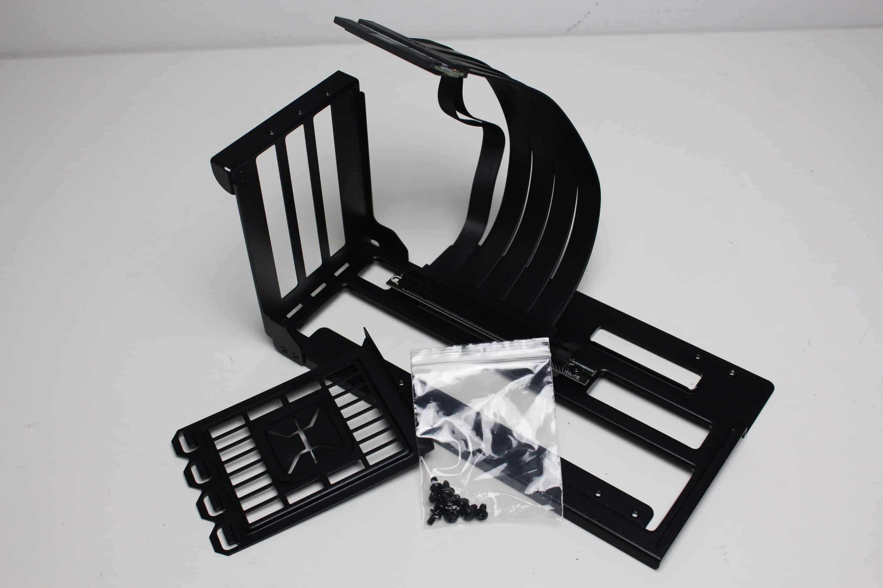 Die optionale Riser-Karte kommt mit einem großen Befestigungsrahmen aus Stahl daher. Insgesamt wirkt die Art der Implementierung der Riser-Karte aber nicht wirklich durchdacht. Der Rahmen wird einfach von unten in den Boden geschraubt und blockiert dort somit alle Lüfterplätze. Zudem wandert die GPU komplett in den Innenraum, wodurch wertvoller Platz verschenkt wird und das Bildschirmkabel über die beigelegte Blende immer nach Innen geführt werden muss. Wir persönlich würden vom Erwerb der Riser-Karte abraten, da diese weder besonders gut implementiert wurde noch die Gesamtoptik großartig aufgewertet wird.