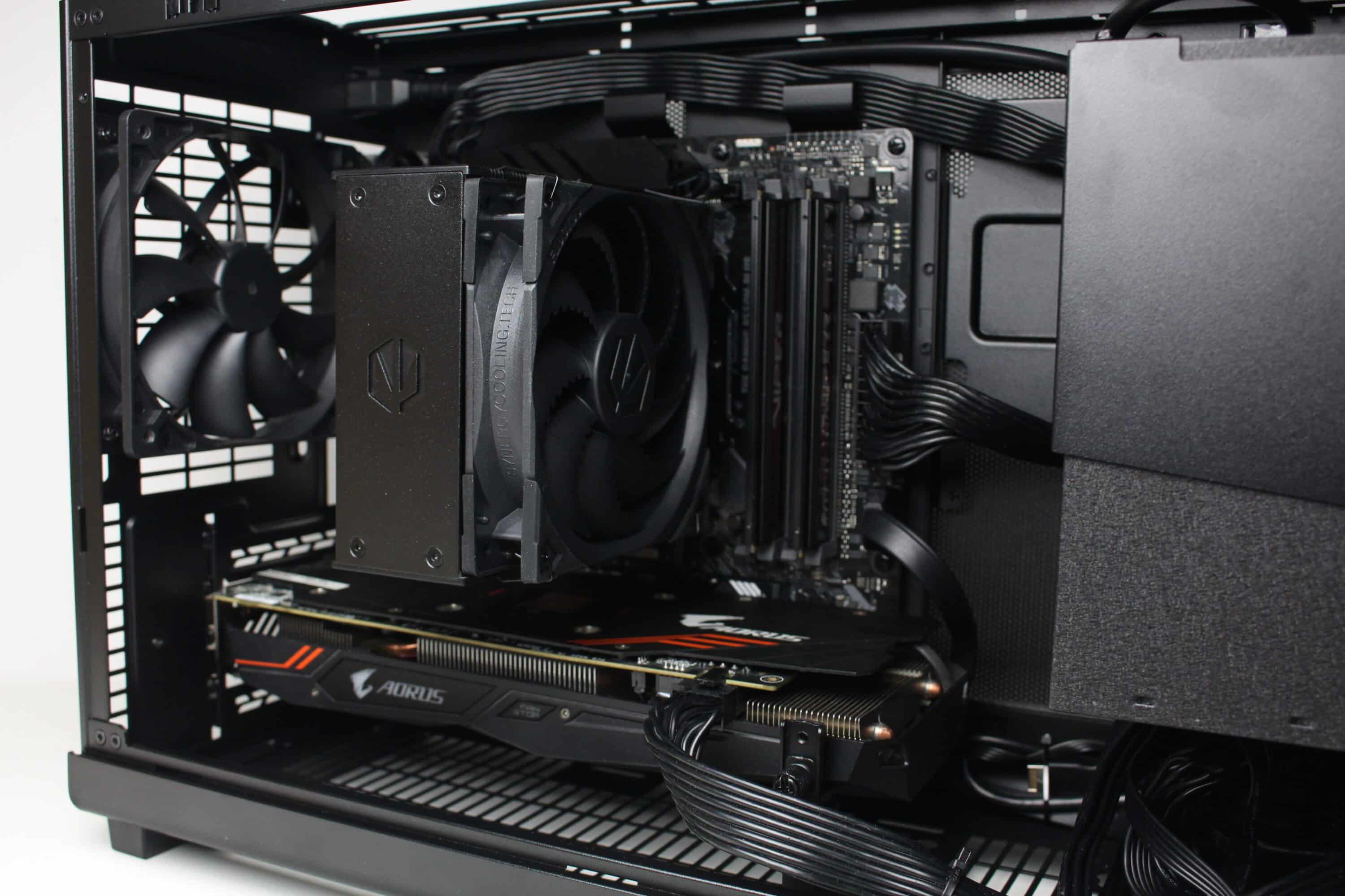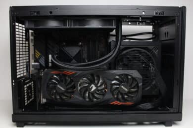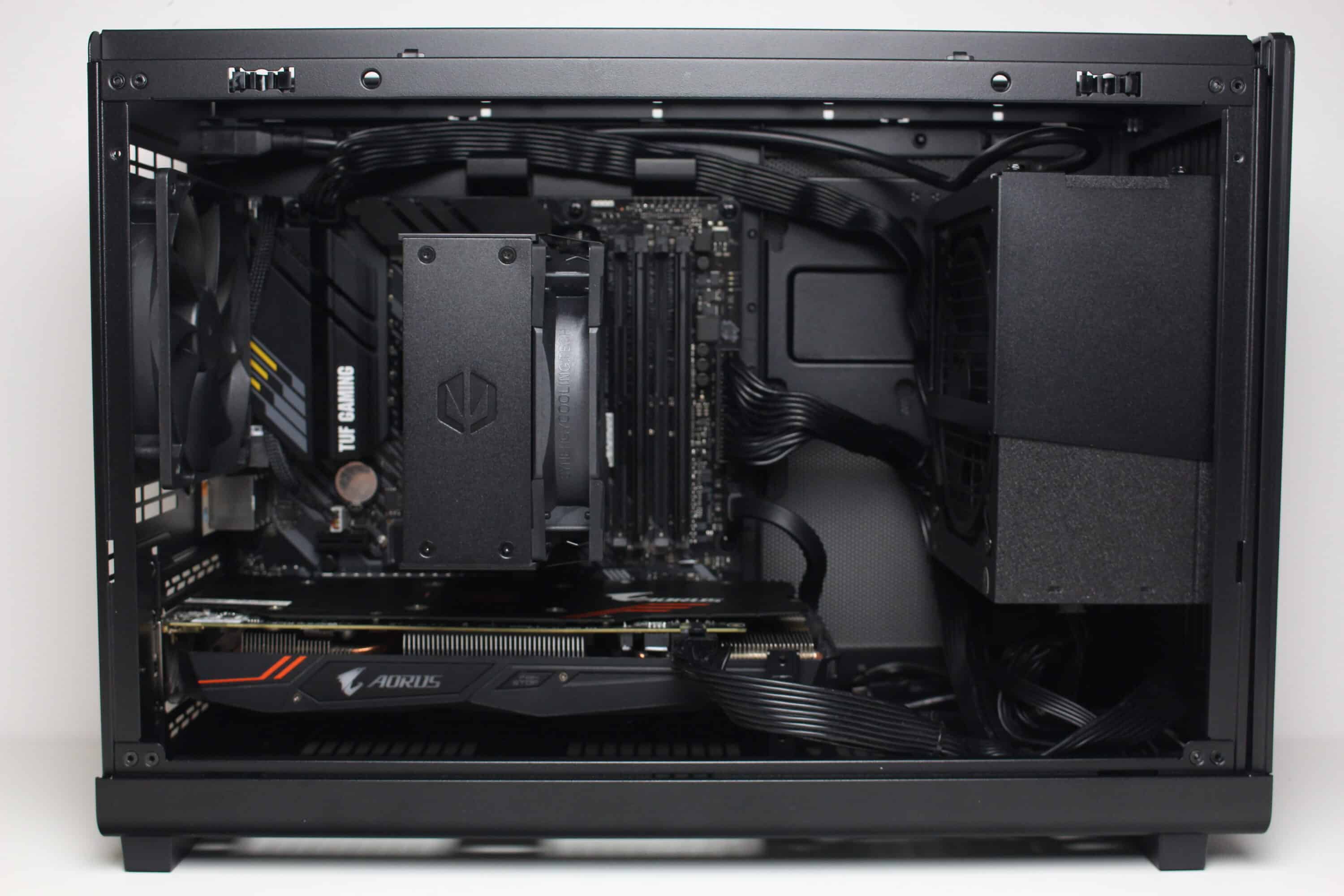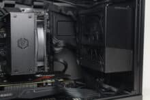 Die Komplexität des Zusammenbaus bzw. der Verkabelung hängt tatsächlich von den gewählten Komponenten und Zubehörteilen ab. Unser luftgekühltes Testsystem konnte sehr schnell und unproblematisch eingebaut bzw. verkabelt werden. Bei der Verwendung eines ATX-Netzteil kann dieses jedoch nur in der Front und nicht seitlich verbaut werden, wenn die Grafikkarte horizontal eingebaut wird und sehr lang ist. Je nach Länge der Grafikkarte bzw. Montageposition des Netzteils hätte man sogar Platz für einen 360-mm-Radiator im Deckel. Dieser sollte inklusive Lüfter aber nicht dicker als 52 Millimeter sein, wenn das Mainboard über hohe VRM-Kühlkörper verfügt. Alternativ kann auch seitlich ein 360-mm-Radiator angebracht werden. In diesem Fall darf das Netzteil sich aber nicht in der Front befinden.