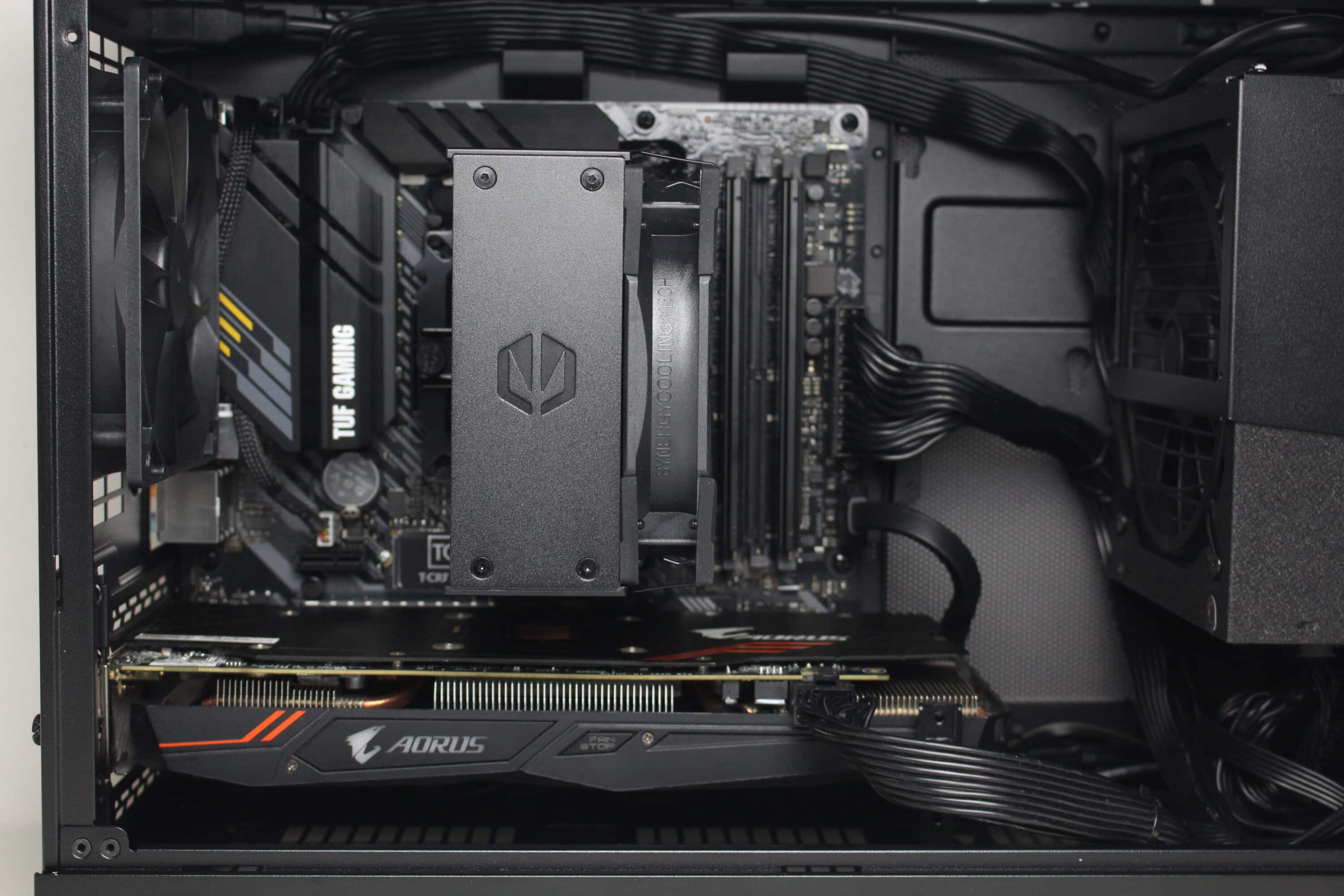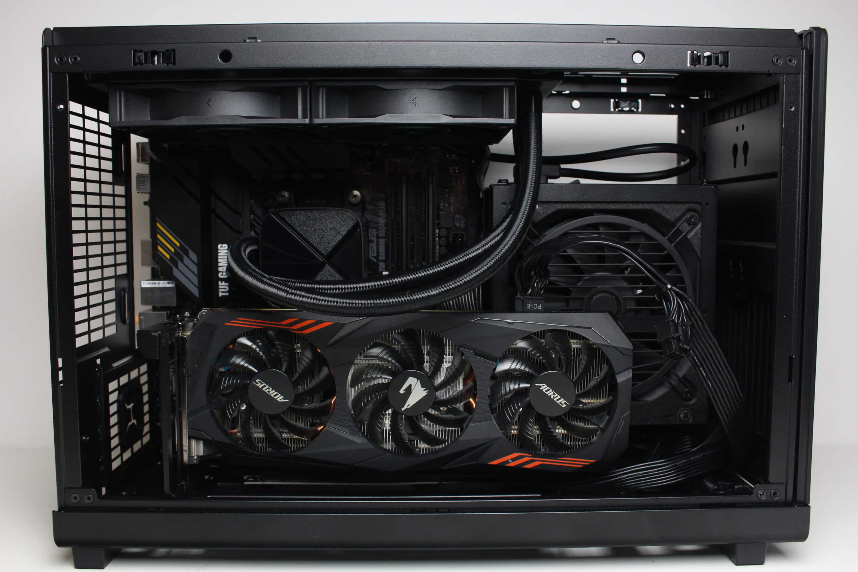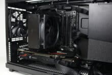 Deutlich herausfordernder war der Einbau in Verbindung mit der optionalen Riser-Karte. Möchte man die GPU vertikal verbauen, dann fällt dadurch die Möglichkeit weg einen hohen Tower-Kühler montieren zu können und es bleibt nur noch die Wahl zwischen einem Low-Profile-Kühler oder einer Kompaktwasserkühlung. Je nach Position und Länge der GPU kann das Netzteil zudem nur noch seitlich angebracht werden, was wiederum die Größe der Kompaktwasserkühlung einschränkt, zumindest wenn man sich für ein ATX-Netzteil entscheidend.