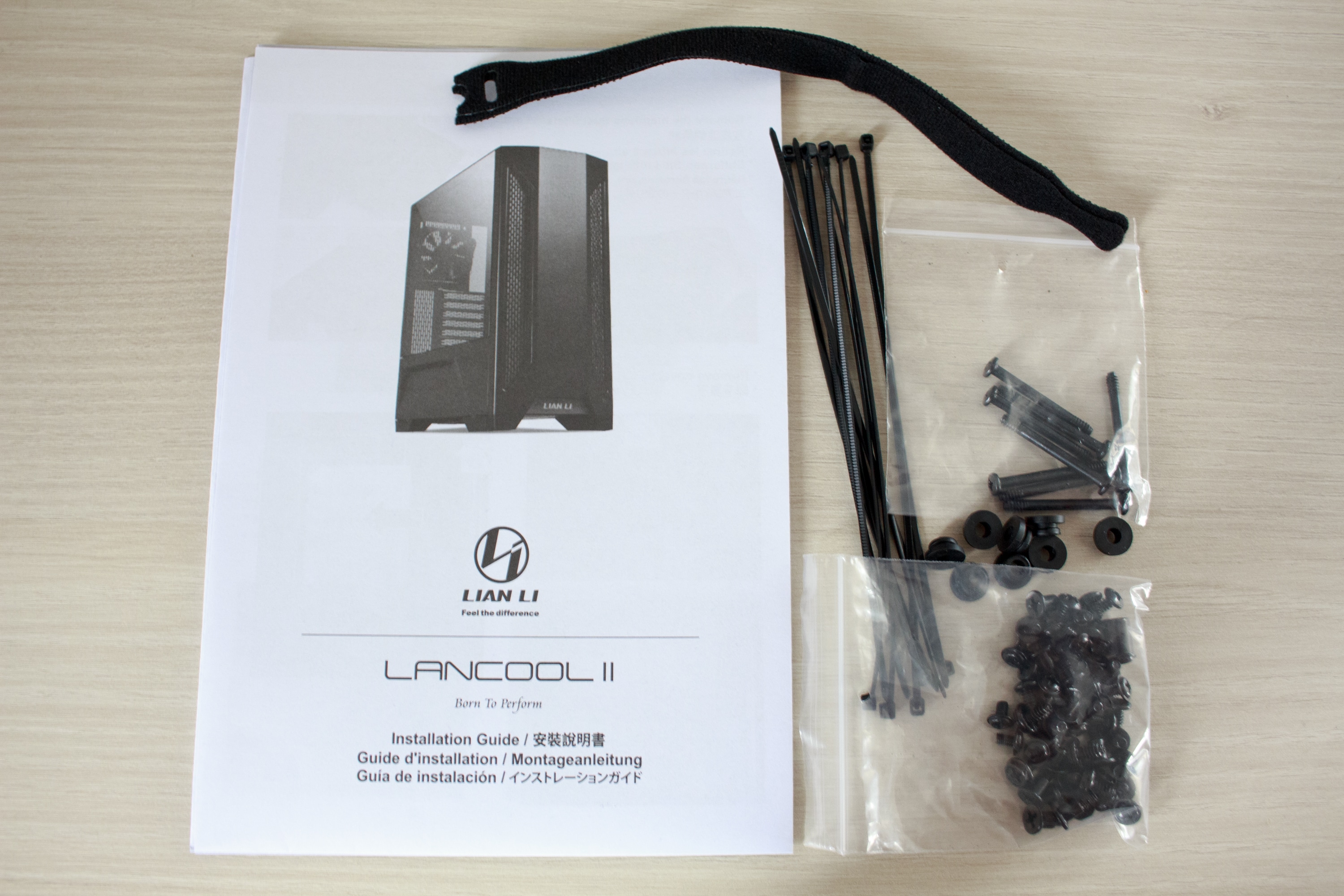 Das Lian Li LANCOOL II kommt gut und sicher verpackt in einem braunen Karton mit schwarzer Schrift und ist von normalen Styropor-Blöcken umhüllt. Des Weiteren hat der Hersteller beide Seitenfenster mit zusätzlichen Schutzfolien beklebt, um Kratzer zu verhindern. Das mitgelieferte Zubehör wurde in einem weißen Karton innerhalb des Festplattenkäfigs verstaut. Dieser Karton beinhaltet alle wichtigen Schrauben, eine Bedienungsanleitung, diverse schwarze Kabelbinder und zwei wiederverwendbare Klettstreifen. Außerdem gehören zum Lieferumfang drei vorinstallierte 120-Millimeter-Lüfter, vorinstallierte Abstandshalter, Staubfilter für Front, Deckel und Netzteil, sowie zwei vorinstallierte RGB-Streifen inklusive Steuerplatine.