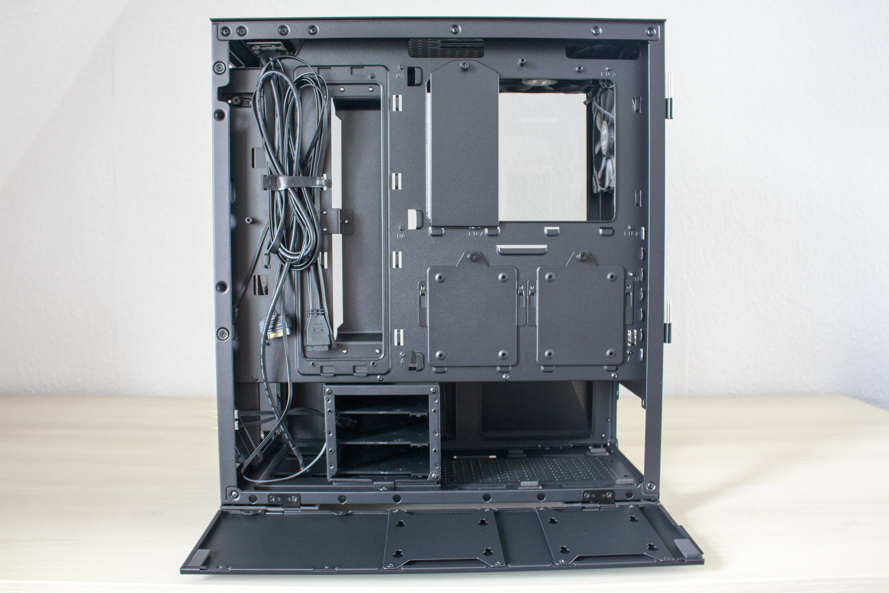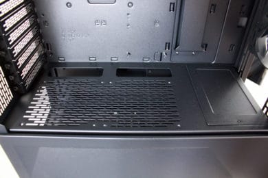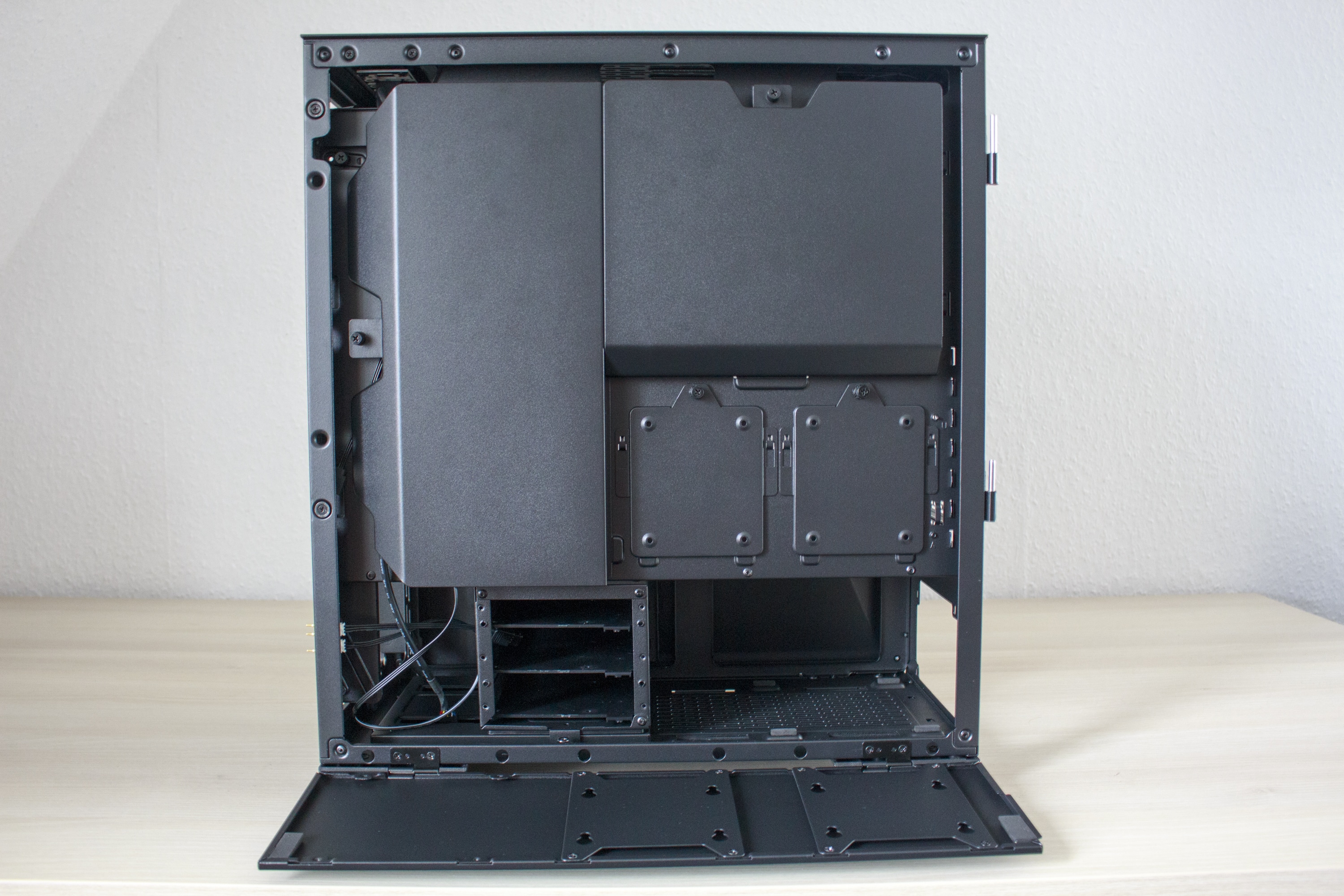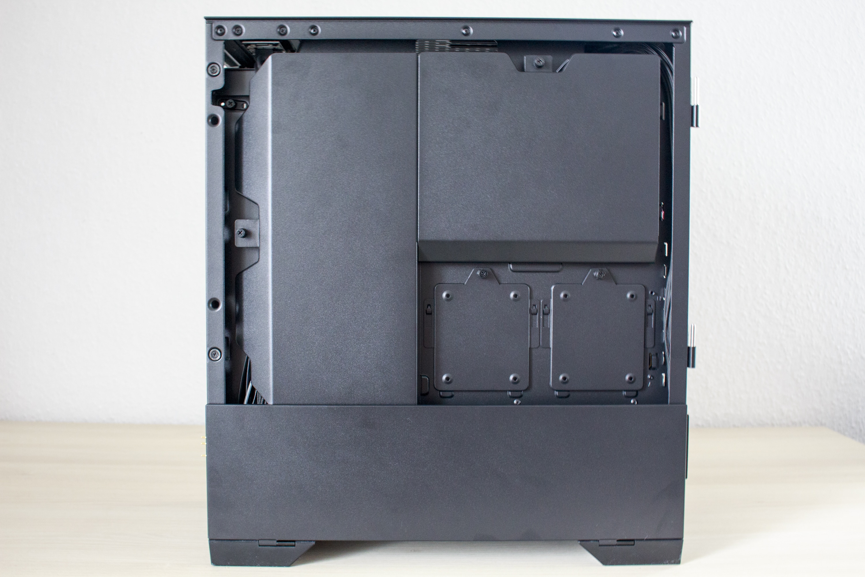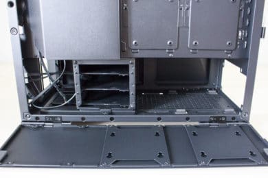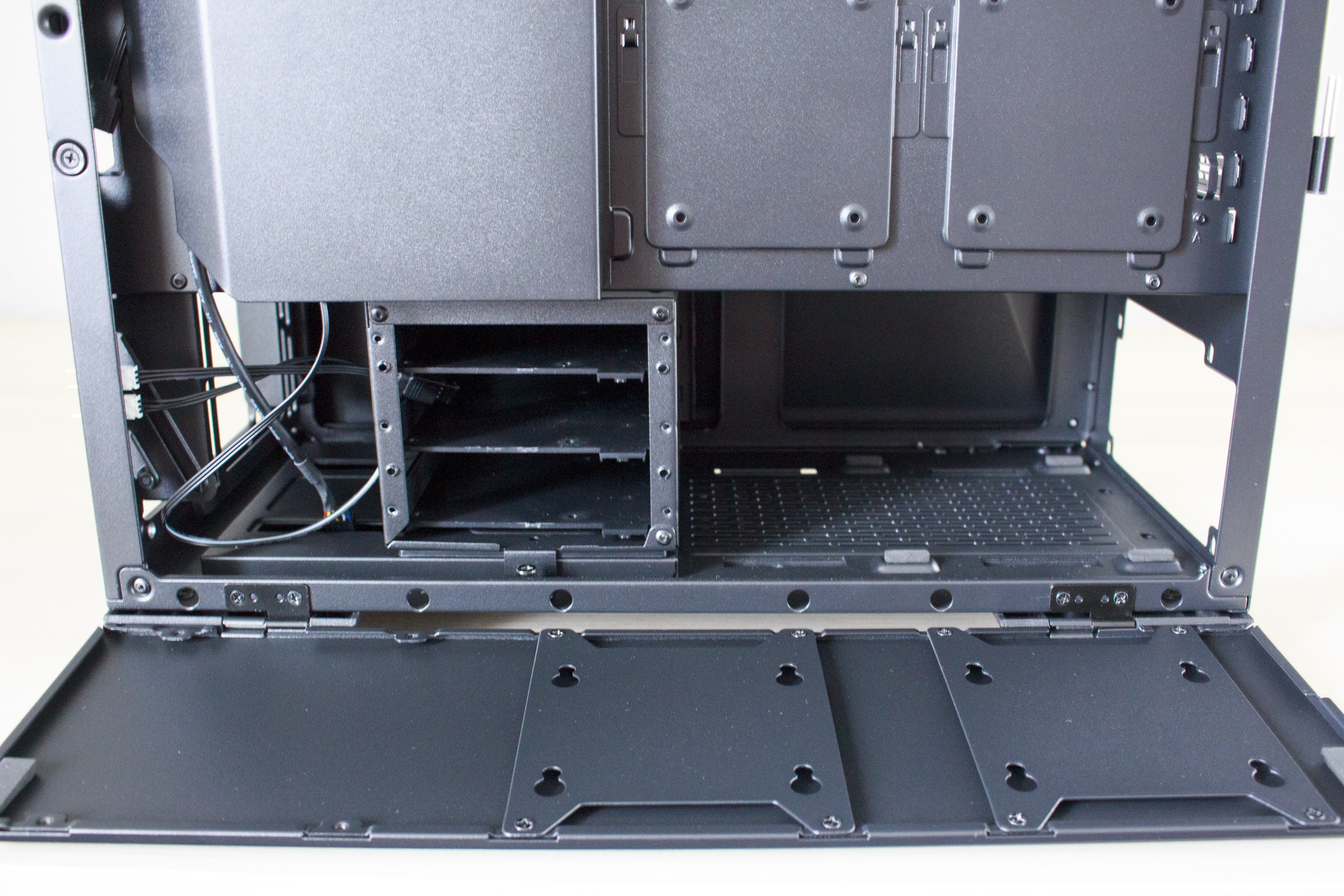 Die im unteren Bereich angebrachte Netzteilabdeckung verbessert nicht nur die Optik indem sie das Netzteil, Kabel und den Festplattenkäfig verdeckt, sie bietet außerdem Lüftungsschlitze und Bohrungen für zwei Lüfter mit einer Rahmenbreite von 120 Millimetern. Zusätzlich ist die Abdeckung modular aufgebaut. Möchte man in der Front einen dicken Wasserkühlungs-Radiator verbauen, lässt sich mithilfe einer einzige Schrauben eine entsprechende Blende entfernen.