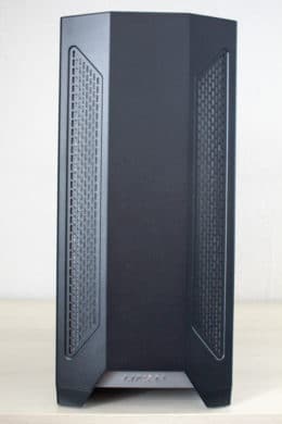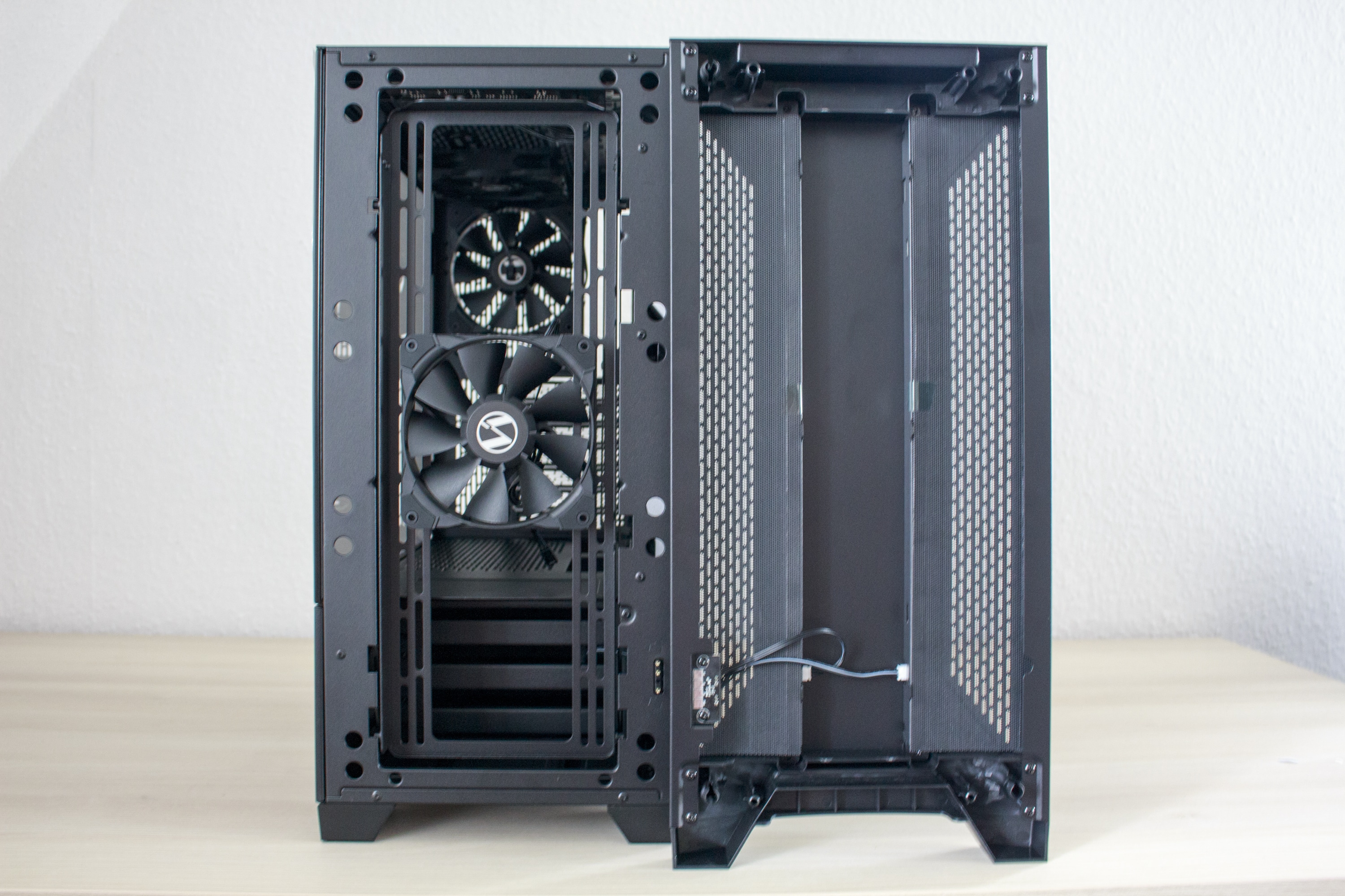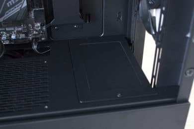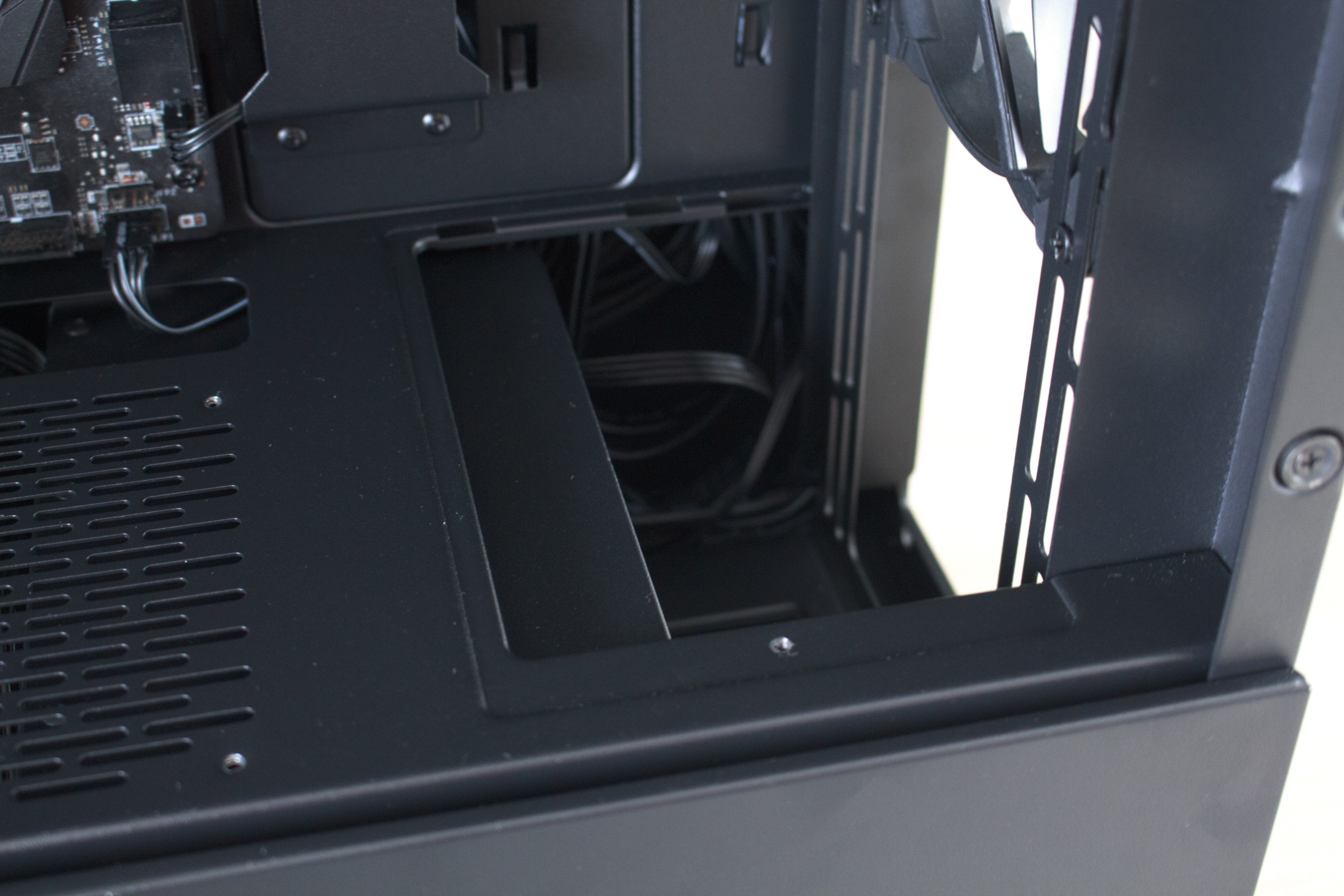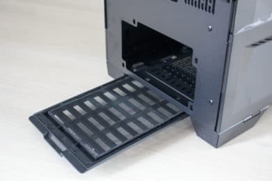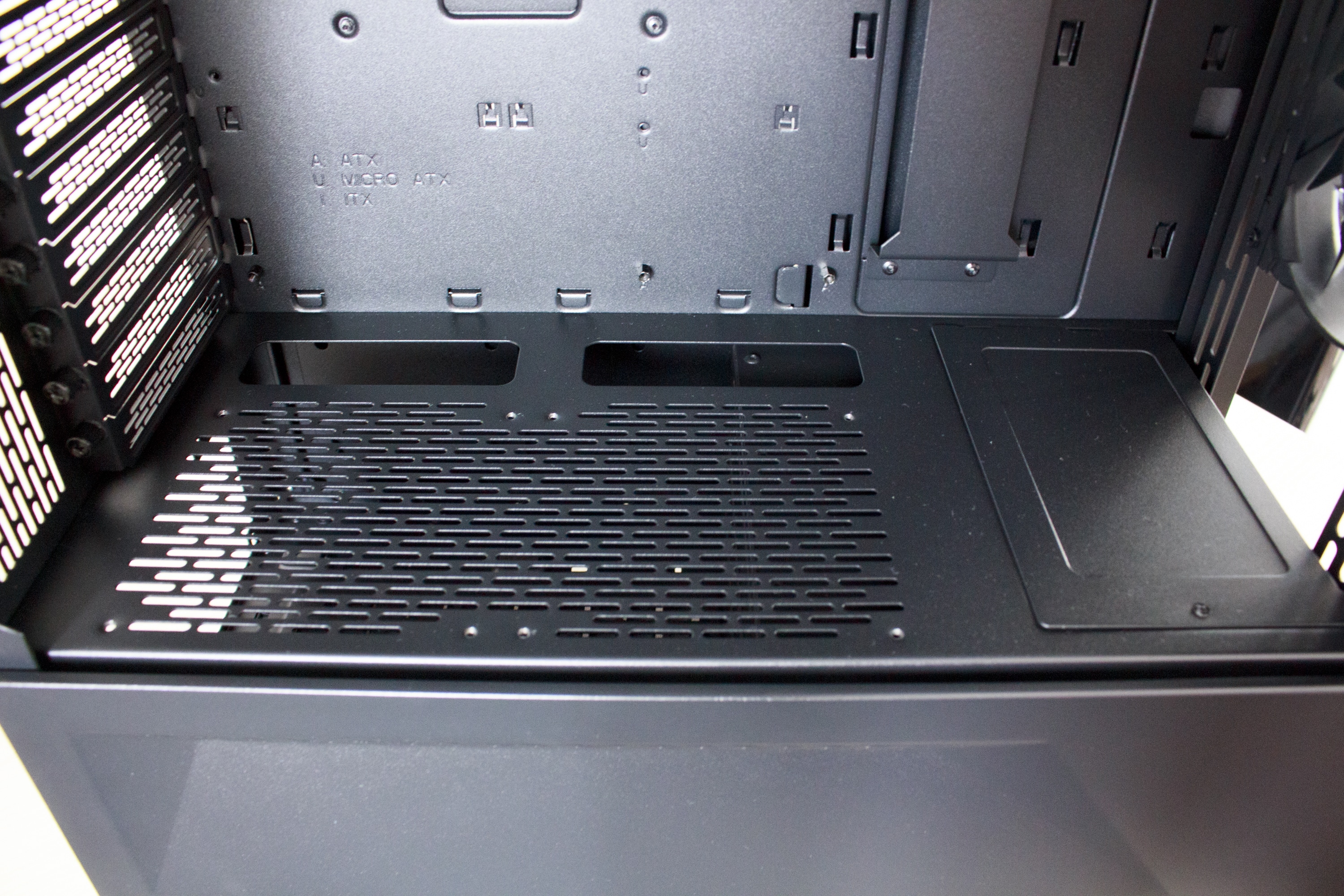 Die im unteren Bereich angebrachte Netzteilabdeckung verbessert nicht nur die Optik indem sie das Netzteil, Kabel und den Festplattenkäfig verdeckt, sie bietet außerdem Lüftungsschlitze und Bohrungen für zwei Lüfter mit einer Rahmenbreite von 120 Millimetern. Zusätzlich ist die Abdeckung modular aufgebaut. Möchte man in der Front einen dicken Wasserkühlungs-Radiator verbauen, lässt sich mithilfe einer einzige Schrauben eine entsprechende Blende entfernen.