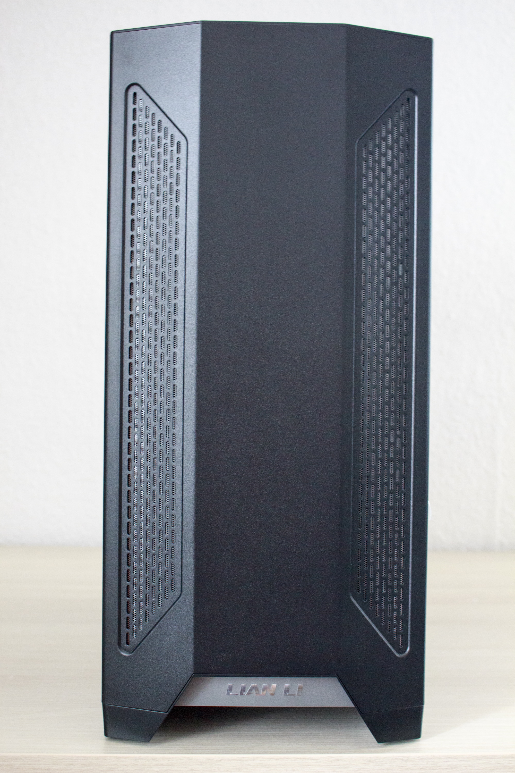 Die Frontpartie des LANCOOL II unterscheidet sich im Vergleich durch den fast vollständigen Verzicht auf Aluminium. Mit Ausnahme des Hersteller-Logos besteht das komplette Frontpanel aus Stahl bzw. Kunststoff und verfügt zu besseren Belüftung des Innenraums über große Öffnungen auf beiden Seiten. Zieht man das Frontelement mit einem kräftigem Ruck ab, offenbaren sich dahinter ein variabler Lüfterrahmen für bis zu drei 120-mm-Lüfter und zwei magnetisch angebrachte Staubfilter. Hinter den beiden Staubfiltern verstecken sich zwei digital-adressierbare RGB-Streifen. Um bei der Demontage die Gefahr von abgerissenen Kabeln zu vermeiden, verfügt das Frontpanel über einen Quick-Connect-Anschluss für die Beleuchtung.