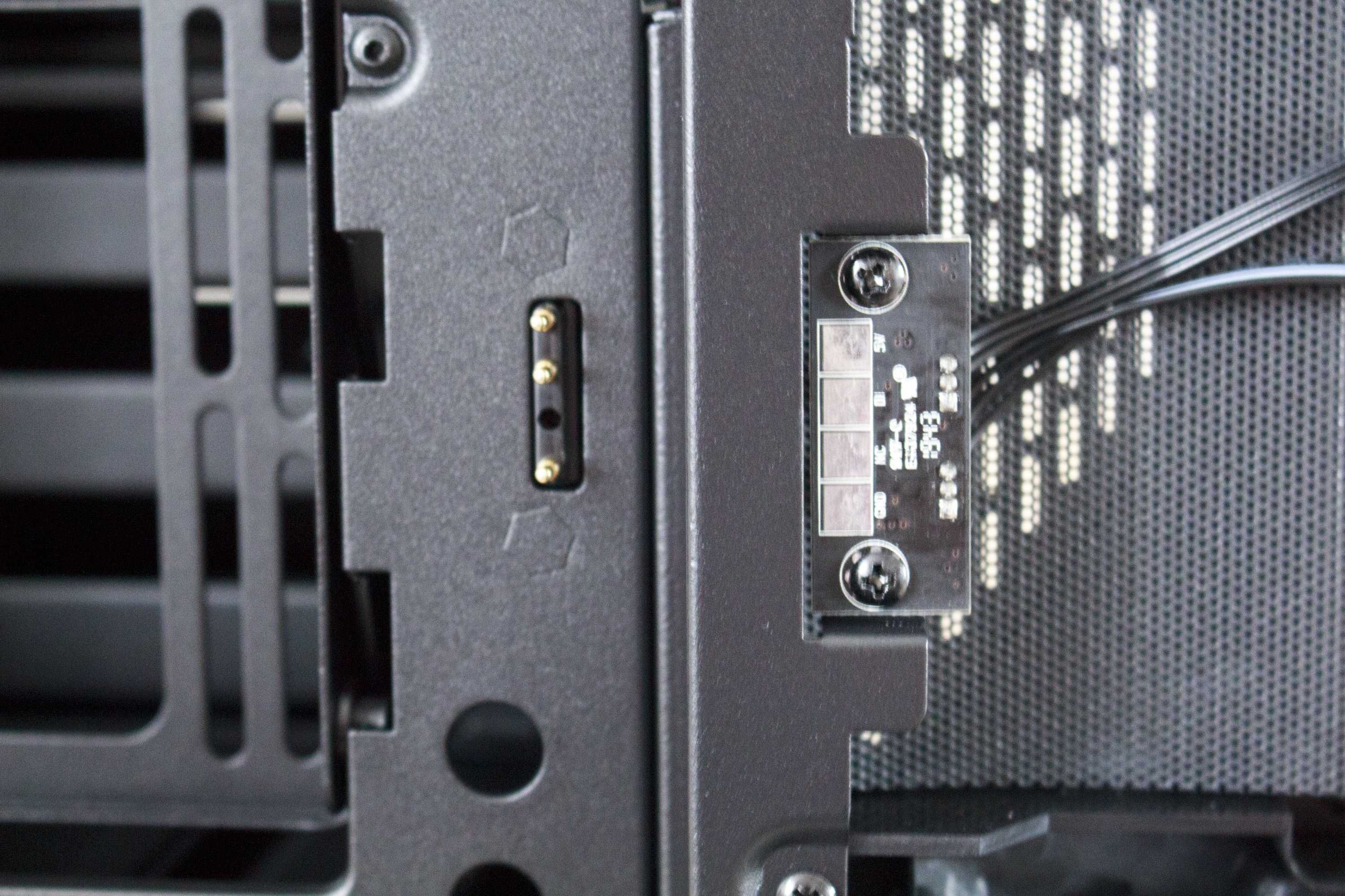 Im Vergleich zu vielen Konkurrenten verzichtet Lian Li bei LANCOOL II komplett auf RGB-Lüfter und setzt auf zwei versteckte RGB-Streifen in der Front. Die Ansteuerung des Streifen erfolgt entweder digital über das Mainboard per 3pin-5V-RGB-Anschluss oder über die integrierte Steuerplatine im I/O-Panel. Um letzteres zu ermöglichen, muss das RGB-Anschlusskabel lediglich mit der Kontaktplatine an der Front verbunden werden. Dieser optionale Schritt ist aber leider in der Bedienungsanleitung nicht näher erläutert. Die indirekte Beleuchtung der Lüftergitter wirkt stimmig und erinnert ein wenig an das Gesicht eines Transformers. Abschließend noch ein paar Impressionen zur Beleuchtung.