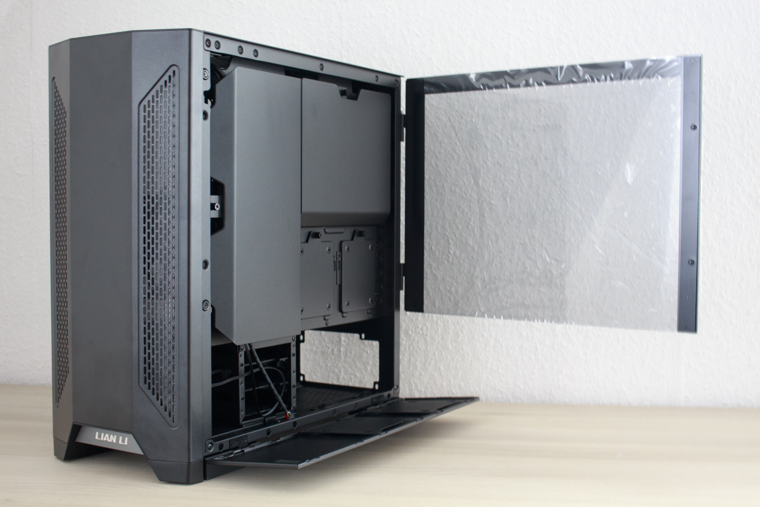 Das linke und rechte Seitenteil des LANCOOL II bestehen aus gehärtetem Glas und sind mit Magneten bzw. Scharnieren am Korpus angebracht. Durch den Wegfall von Rändelschrauben wird die Optik verbessert und zudem die Demontage der Seitenteile erleichtert. Auf den Bildern kann man gut erkennen, dass die Seitenteile nur den oberen Bereich abdecken. Für den Bereich unterhalb der Netzteilabdeckung hat sich Lian Li ein weiteres nettes Feature überlegt. Der Midi-Tower verfügt nämlich beidseitig über zwei magnetische Klappen aus Stahl. Sind diese geöffnet, hat man Zugriff auf den Festplatten-Käfig und kann das Netzteil montieren ohne die kompletten Seitenteile entfernen zu müssen.
