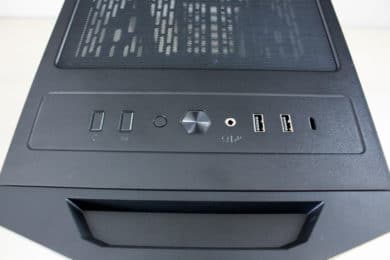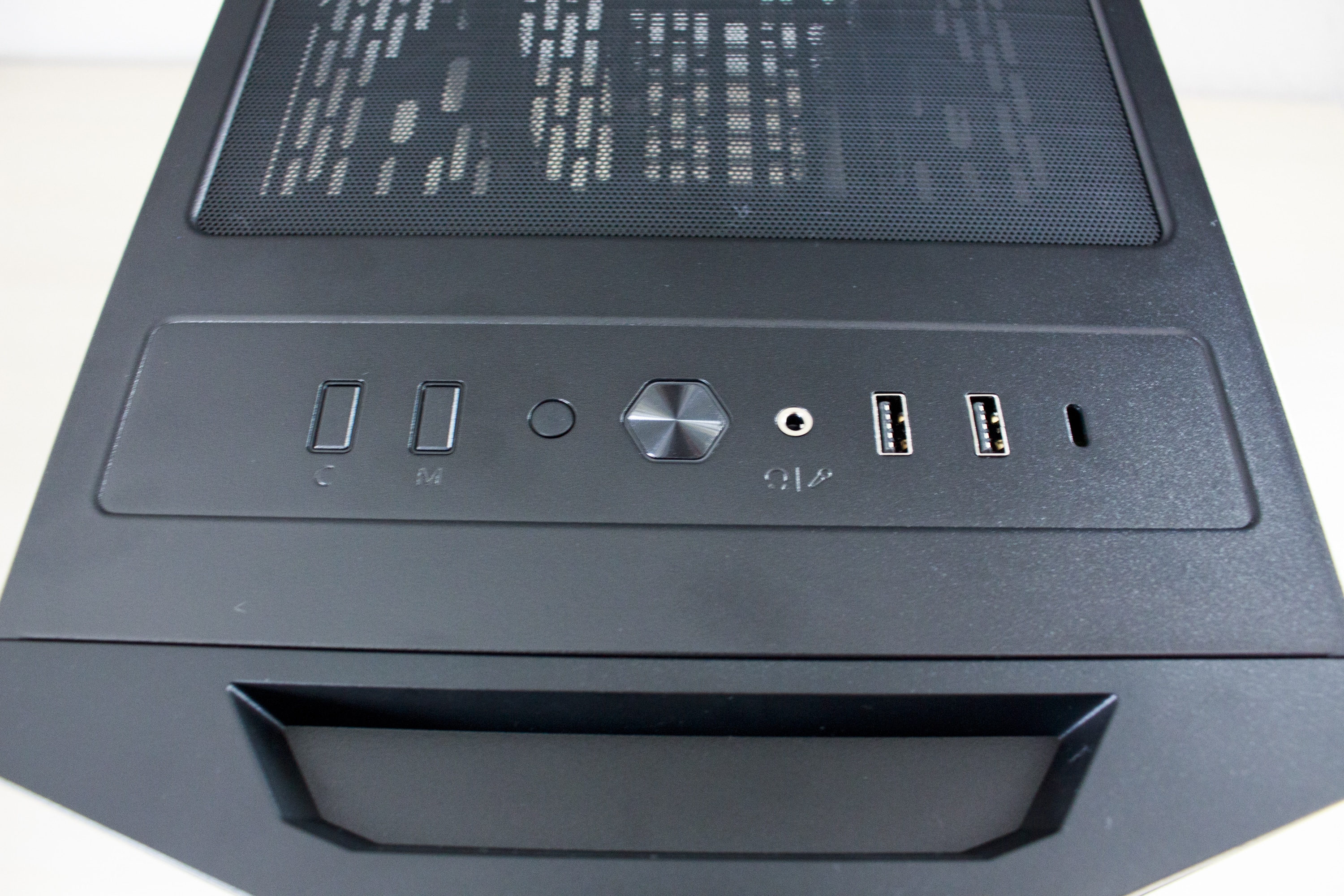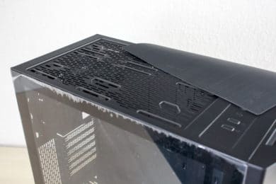 Die Deckelpartie des LANCOOL II ähnelt dem Design vieler aktueller Midi-Tower. Ein Großteil der Deckelfläche wird durch eine große Lüfteröffnung dominiert und von einem magnetischen Staubfilter vor Staub geschützt bzw. optisch aufgehübscht. Davor liegt das I/O-Panel. Dieses zeichnet sich durch zwei USB 3.0-Anschlüsse, eine Mikrofon-Kopfhörer-Kombibuchse und insgesamt vier Schalter aus. Die vier Schalter dienen für Power, Reset und zur Steuerung des RGB-Streifens. Zuletzt sei hier noch zu erwähnen, dass das I/O-Panel mit einer Vorbereitung für einen USB 3.1 Typ-C-Port versehen wurde. Das entsprechende Kabel muss aber zusätzlich erworben werden und gehört nicht zum Lieferumfang.