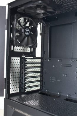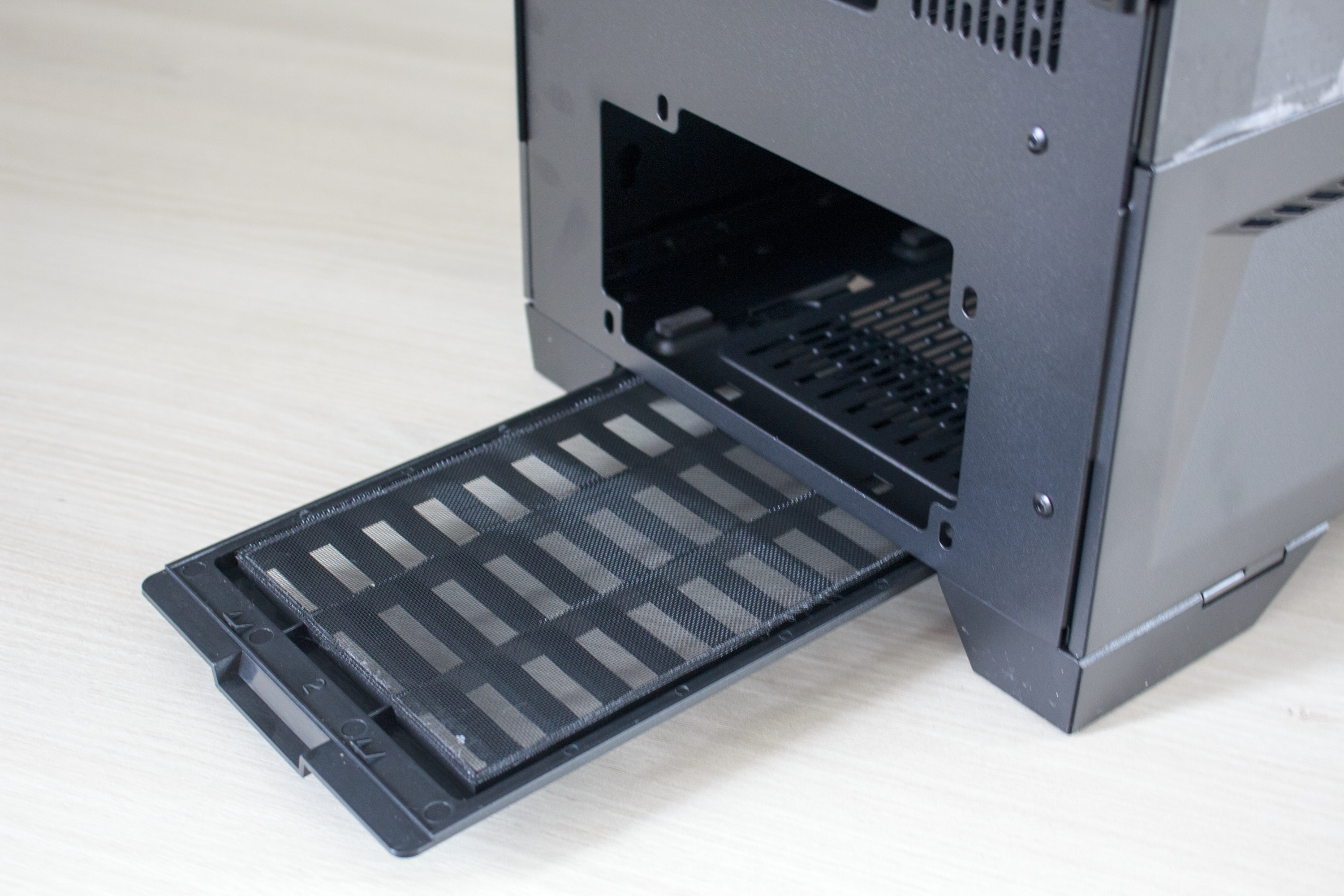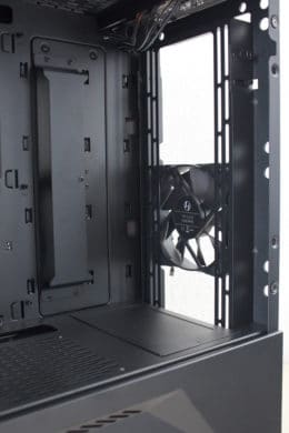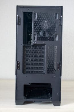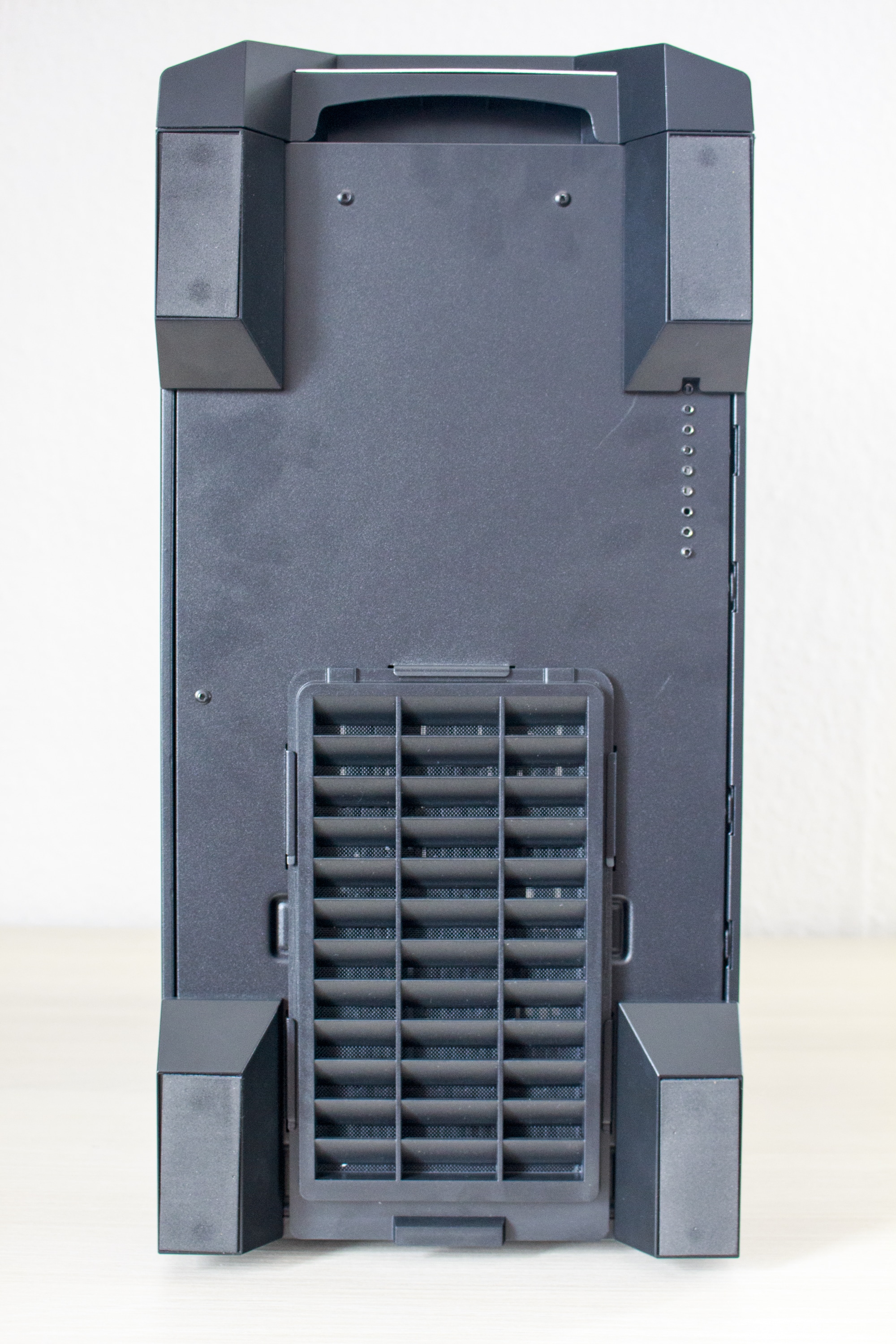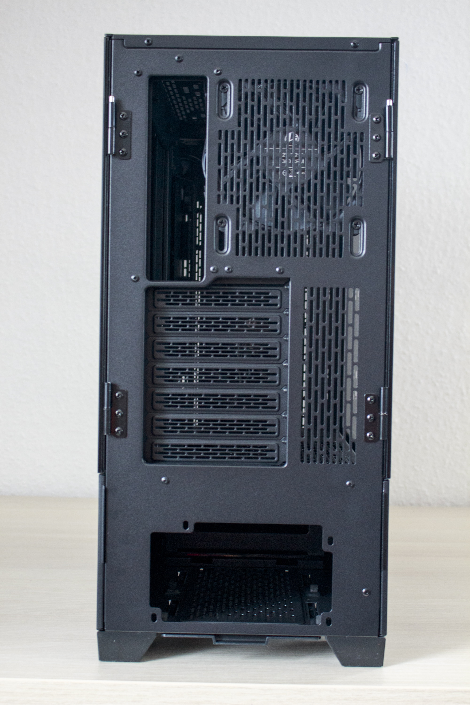Unterseite und Rückseite sind hingegen klassisch gestaltet. Der Midi-Tower steht auf vier soliden und mit Gummistreifen ausgestatteten Füßen aus Kunststoff. Das Netzteil sitzt unten und wird durch einen großen, feinmaschigen Staubfilter vor Verschmutzung geschützt. Außerdem gibt es eine Art Schienensystem, um den Festplattenkäfig bei Bedarf verschieben zu können. An der Rückseite existieren sieben wiederverwendbare PCI-Slotblenden, Belüftungslöcher und ein Montageplatz für einen Lüfter mit einer Rahmenbreite von 120 Millimetern.