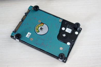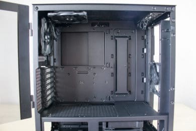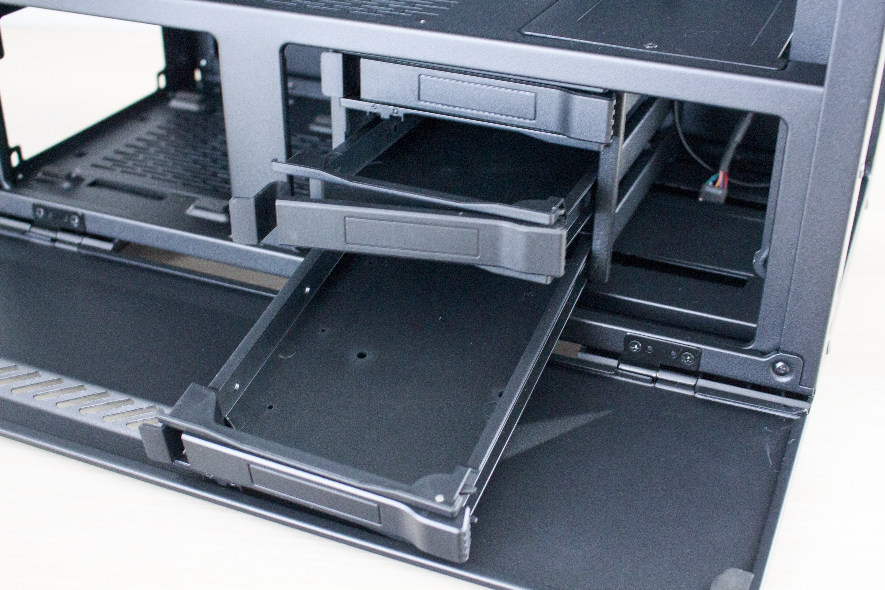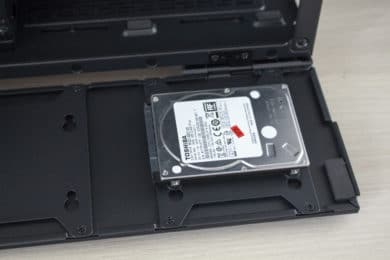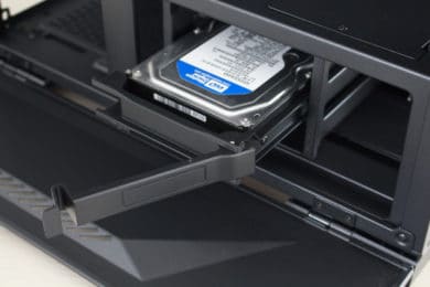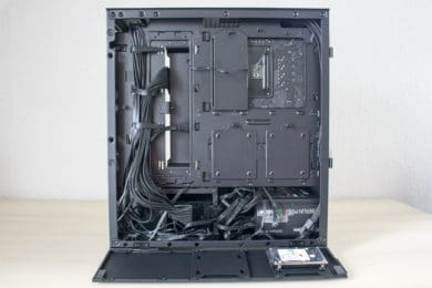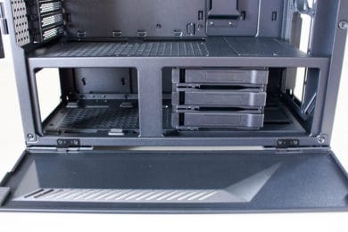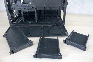 Die Montage der Datenträger erfordert in allen Fällen die Verwendung eines Schraubendrehers. Große 3,5″-Festplatten kommen im HDD-Käfig im vorderen Bereich des Gehäuses unter. Zur Befestigung werden die HDDs mit dem Kunststoffrahmen verschraubt und anschließend in den Schacht geschoben. Eine richtige Entkopplung gibts es aber leider nicht. Zwei SSDs können hinter dem Mainboards-Tray mit jeweils vier normalen Schrauben an einer Stahlplatte angebracht werden. Zwei weitere SSDs oder kleine Festplatten können zudem auf der Rückseite der Klappe der Netzteilabdeckung befestigt werden.
