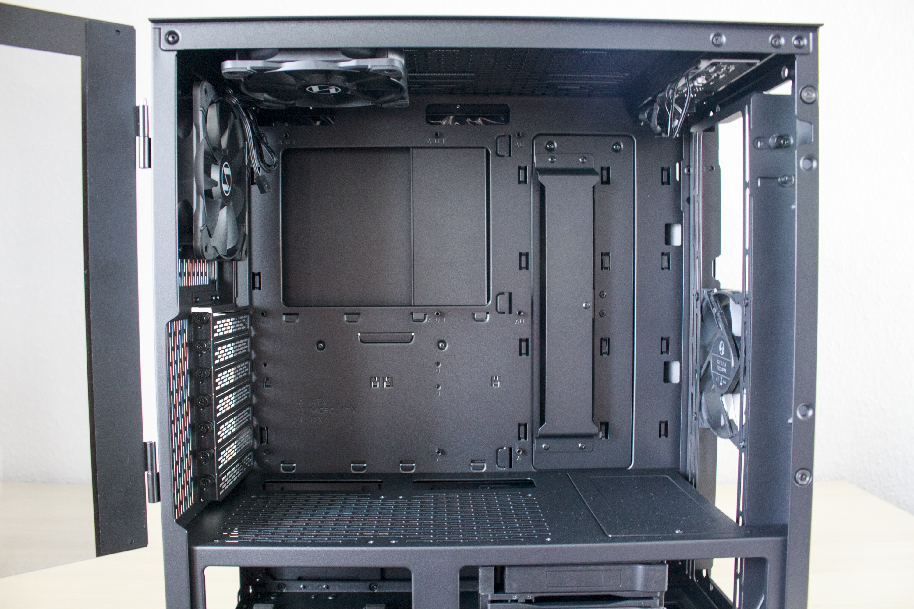 Die Gestaltung des Innenraums wurde beim LANCOOL II ebenfalls überdacht. Dieser folgt zwar auch dem aktuellen Trend und ist sehr offen bzw. in zwei Kammern unterteilt. Die gummierten Kabelmanagement-Öffnungen mussten aber einer herausstehenden Sichtblende weichen. Das Mainboard, Erweiterungskarten und mögliche Radiatoren werden also, wie so üblich, in der oberen Kammer untergebracht. Neben der Sichtblende auf der rechten Seite des Mainboards gibt es noch weitere Kabelmanagement-Öffnungen in der Netzteilabdeckung und oberhalb des Mainboard-Trays. Durch den Wegfall von HDD-Käfigen in der oberen Kammer, kann der vorinstallierte Lüfter ungehindert kalte Luft ins Innere befördern. Durch den variablen Lüfterrahmen ist es zudem möglich, die Frontlüfter/ Frontradiatoren in vier verschiedenen Positionen zu verbauen.