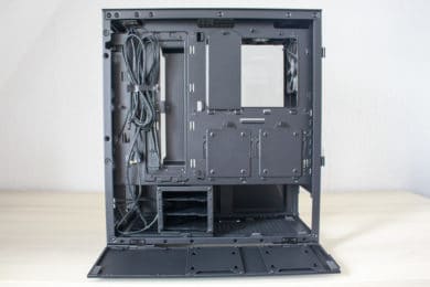 Werfen wir nun ein Blick auf die Rückseite. Ein besonderes Feature dürfte hier jedem sofort auffallen. Um die rechte Seite trotz Verkabelung ordentlich wirken zu lassen, hat Lian Li die Rückseite mit zwei Kabel-Abdeckungen ausgestattet. Was nicht verdeckt wird, sind lediglich die zwei Montageplätze für 2,5″-SSDs. Öffnet man auf der rechten Seite die Klappe des Netzteiltunnels kommen zwei weitere Montageplätze für 2,5″-SSDs zum Vorschein. 3,5″-Festplatten können im LANCOOL II ebenfalls untergebracht werden. Dazu muss man nur auf der linken Seite die untere Klappe öffnen und hat direkten Zugriff auf drei HDD-Rahmen aus Kunststoff. Der HDD-Käfig ist auf einem Schienensystem gelagert und kann verschoben oder zugunsten von einem längeren Netzteil auch komplett ausgebaut werden.