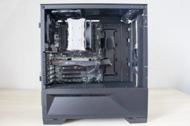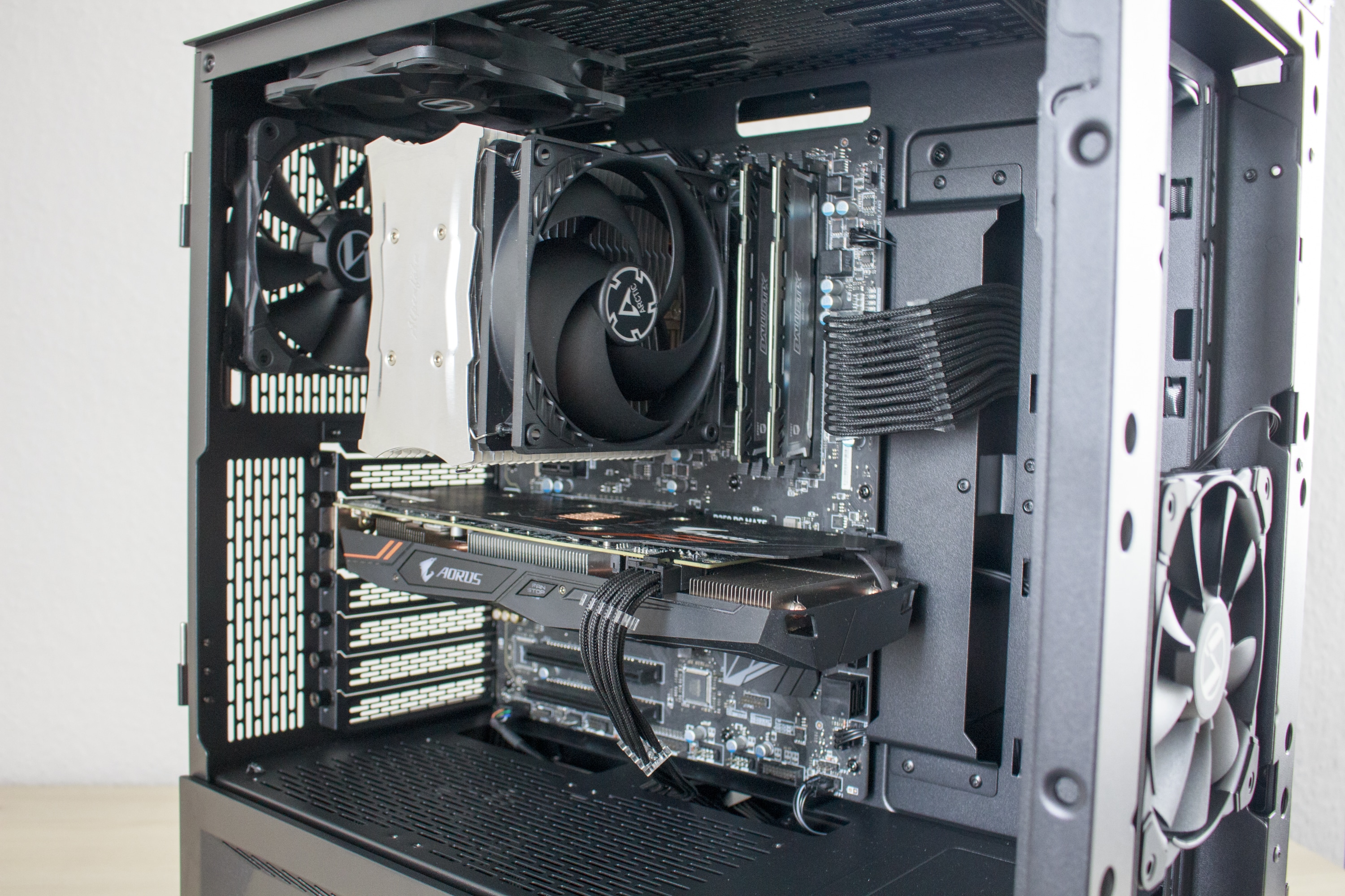 Nun kommen wir zum Systemeinbau. Als Hardware verwenden wir einen AMD Ryzen 5 1400 auf einem MSI B350 PC Mate mit 16GB Crucial Ballistix Sport LT grau DDR4-2666. Der Ryzen wird von einem EKL Alpenföhn Matterhorn Pure gekühlt. Für die Bildausgabe ist eine GTX 1060 6GB von Gigabte AORUS zuständig. Die Stromversorgung erledigt das nichtmodulare Berlin Pro RGB 650W mit RGB-Lüfter. Um die Verkabelung optisch noch etwas aufzuwerten, wurden zudem einzeln gesleevte Kabelverlängerungen von Phanteks verwendet.