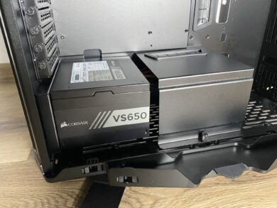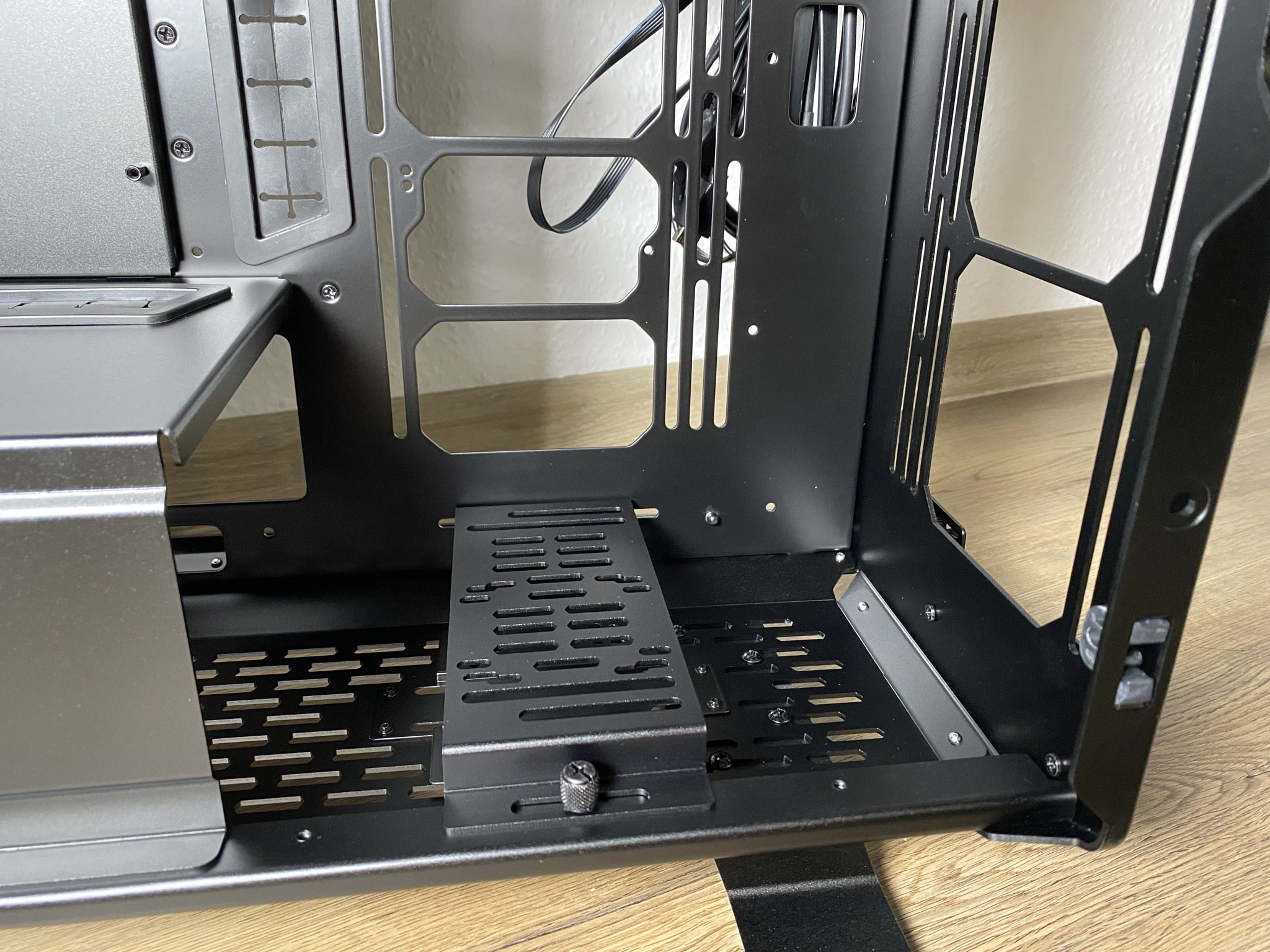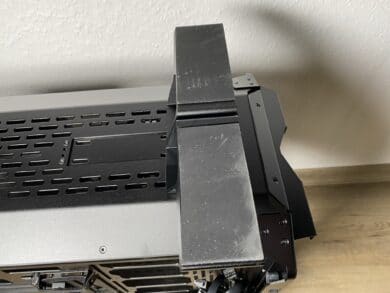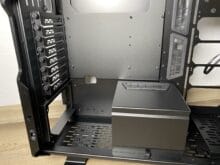 Starten wir also mit dem ersten, welches in diesem Fall der PSU-Schacht mit der optionalen Blende wäre. In unserer Montage haben wir auf den Anbau dieser Blende verzichtet – aus optischen und praktischen Gründen. Einmal sieht es etwas, durch die entstehende Lücke zwischen Blende und PSU, fehl am Platz aus. Je nach Netzteil kann dieser Punkt entsprechend anders ausfallen. Verzichtet man auf die Blende, erhält man aber auch einen weiteren Platz für einen Lüfter am Boden.
