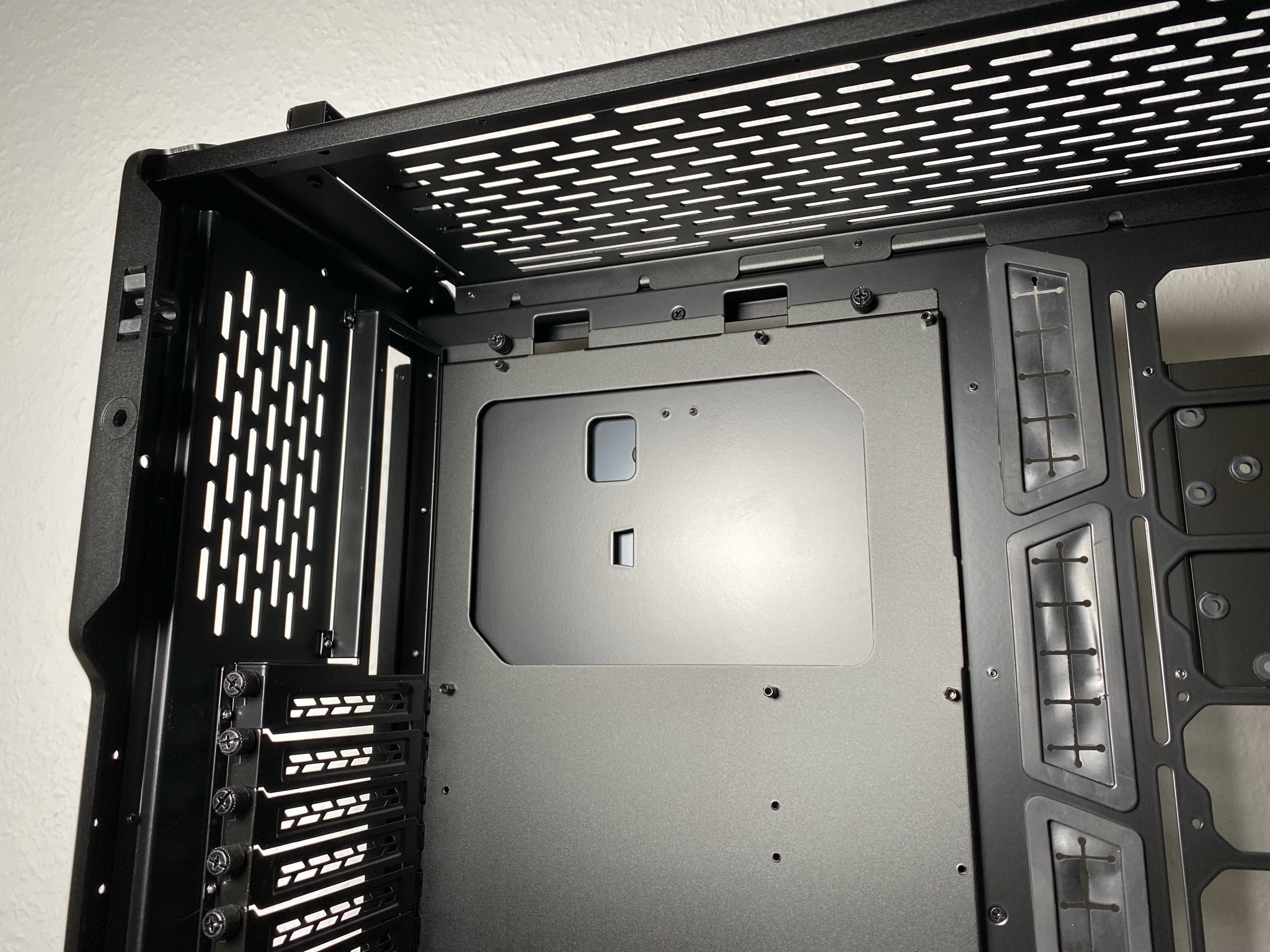Im nächsten Schritt wollen wir einen Blick ins Innere des ODYSSEY X werfen, den wohl am spannendsten Part des gesamten Gehäuses. Hier lässt sich einiges am Design des Gehäuses ändern, je nach Form, die man am Ende haben möchte. Das spiegelt sich dann auch im Innenraum mit den auffällig vielen Schrauben wieder. Wobei so gut wie jede Schraube einen berechtigten Sinn hat. Mainboardplatte für ITX- bis E-ATX-Mainboards, PSU-Schacht, Wasserpumpen-Halterung, Front-IO und sogar die Schiene für die Lüfter lassen sich demontieren und an einer anderen Stelle wieder befestigen. Ein einzigartiges Konzept, welches mit Aufwand durch Umbauten verbunden ist. Dadurch lässt sich das Gehäuse jedoch in mehreren Wegen modifizieren.