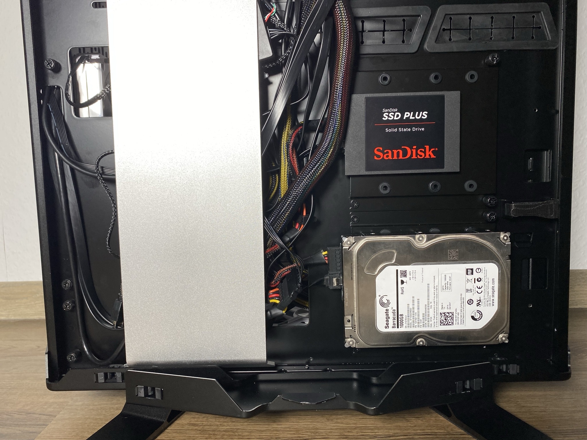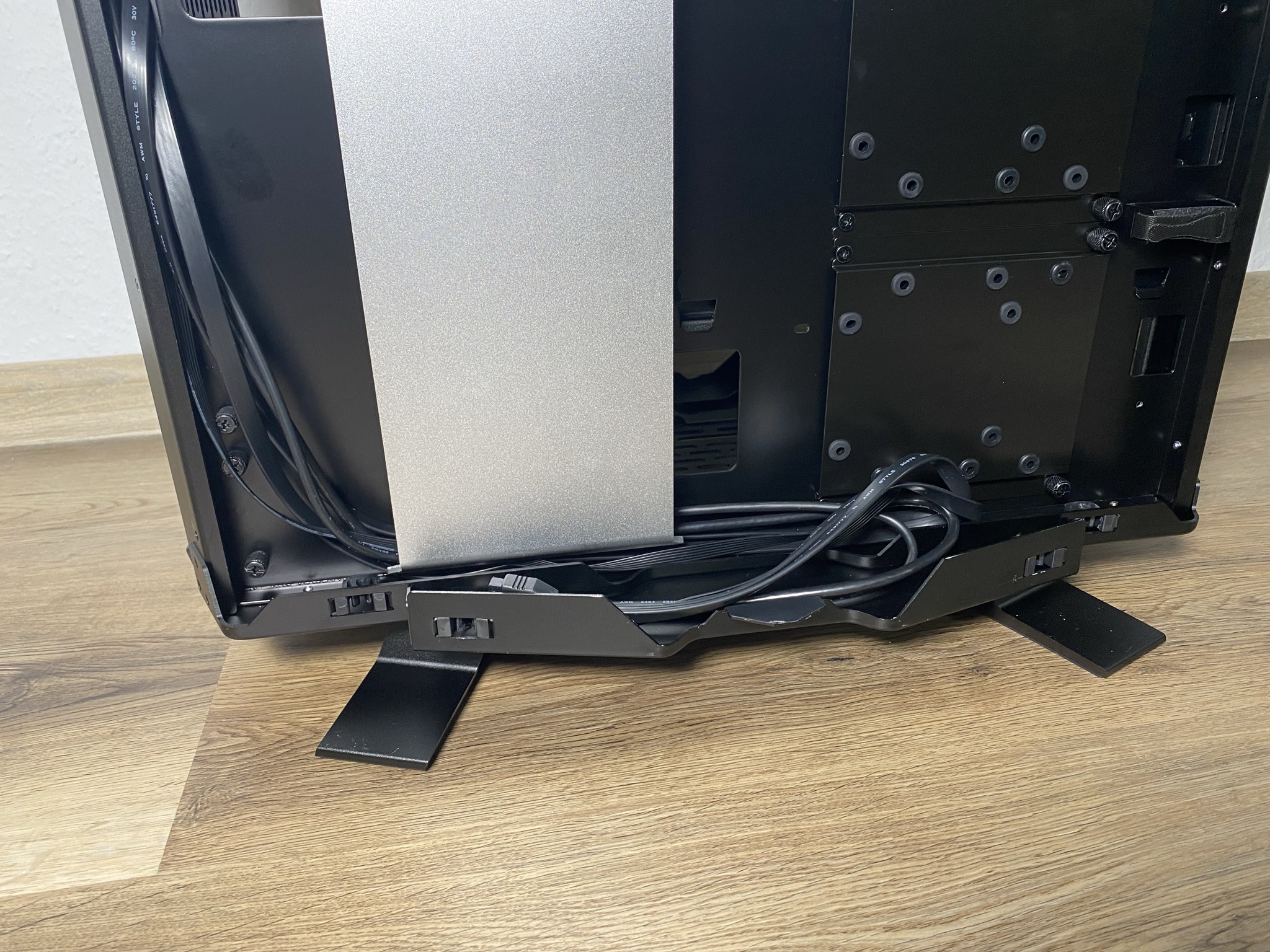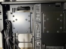 Das zweite besondere sieht man an Rückseite. Schraubt man den PSU-Schacht fest, müssen die Kabel vom Netzteil einen etwas unnötigen Weg bis zur untersten HDD oder SSD wählen. Aus dem Loch heraus unten an der HDD oder SSD vorbei bis zum vorderen Teil des Gehäuses und dann schließlich um die Ecke an die Festplatte. Eine Schnalle zum Festziehen der Kabel ist an diesem Punkt zwar vorhanden, erzeugt aber, aufgrund der Durchsichtigkeit der Glasscheibe auf der Rückseite, kein schönes Bild. Dazu hätte die silberne Kabelblende auch verstellbar sein können, damit die Kabel etwas mehr auf der rechten Seite verdeckt werden hätten können.