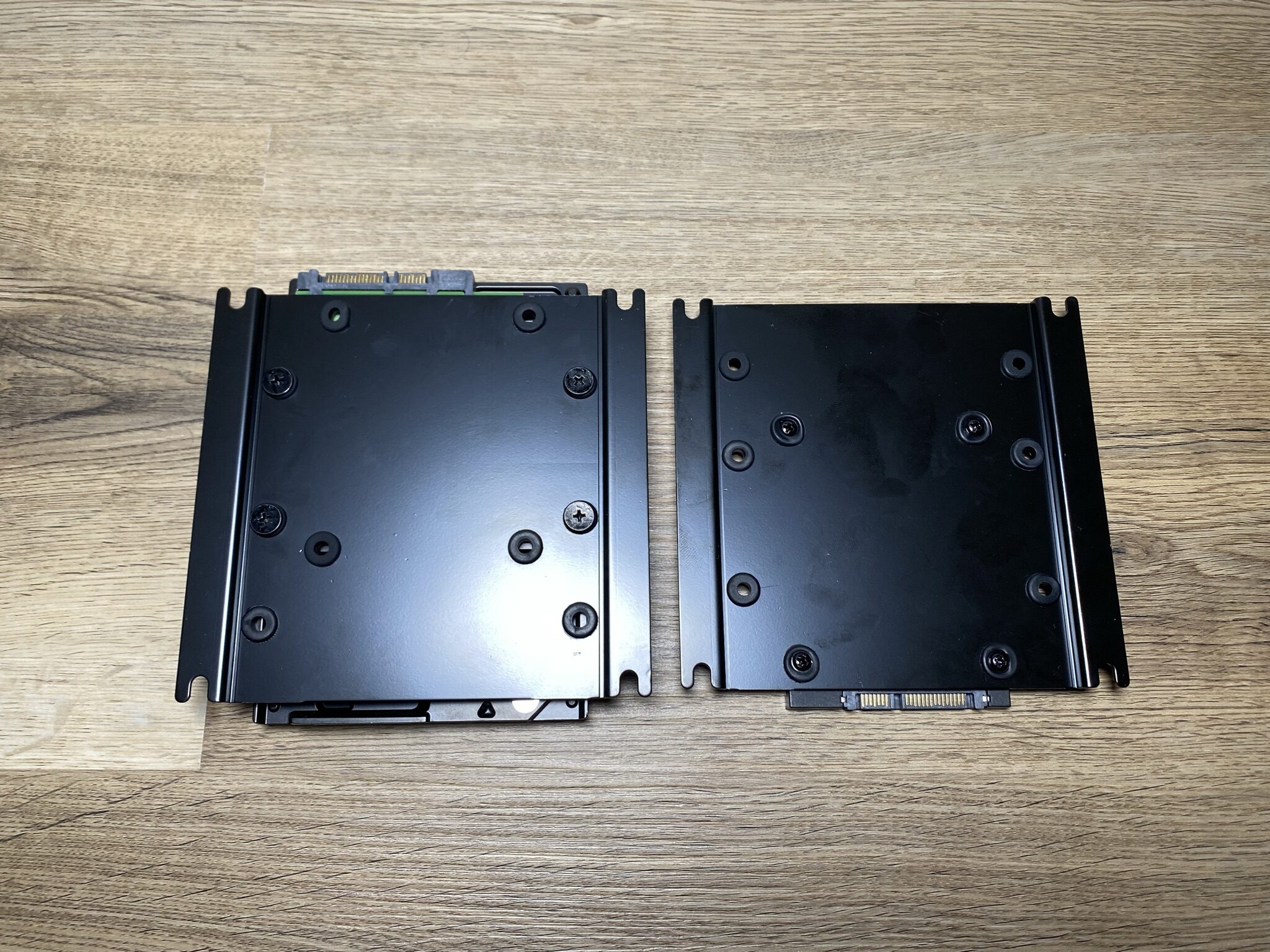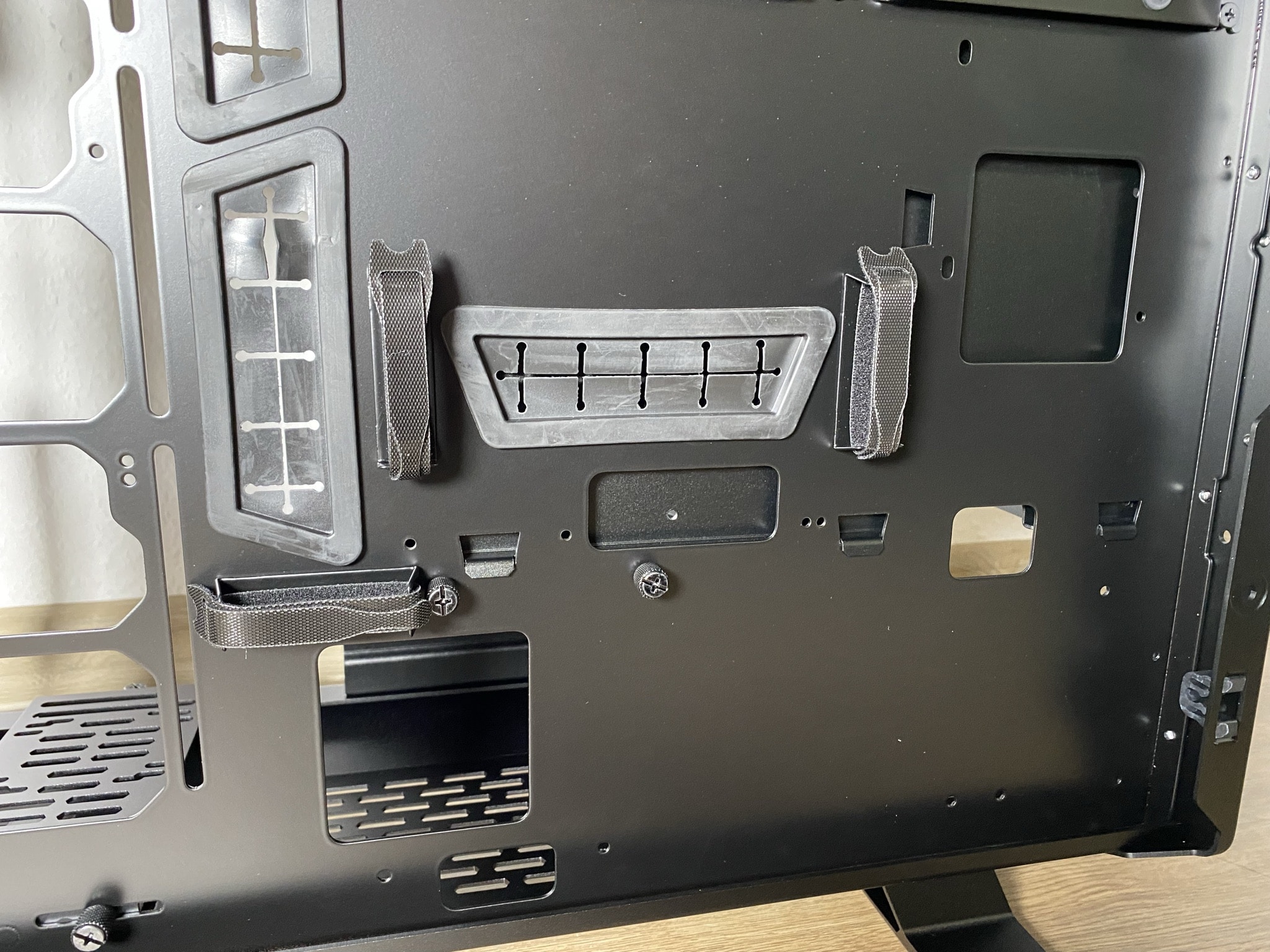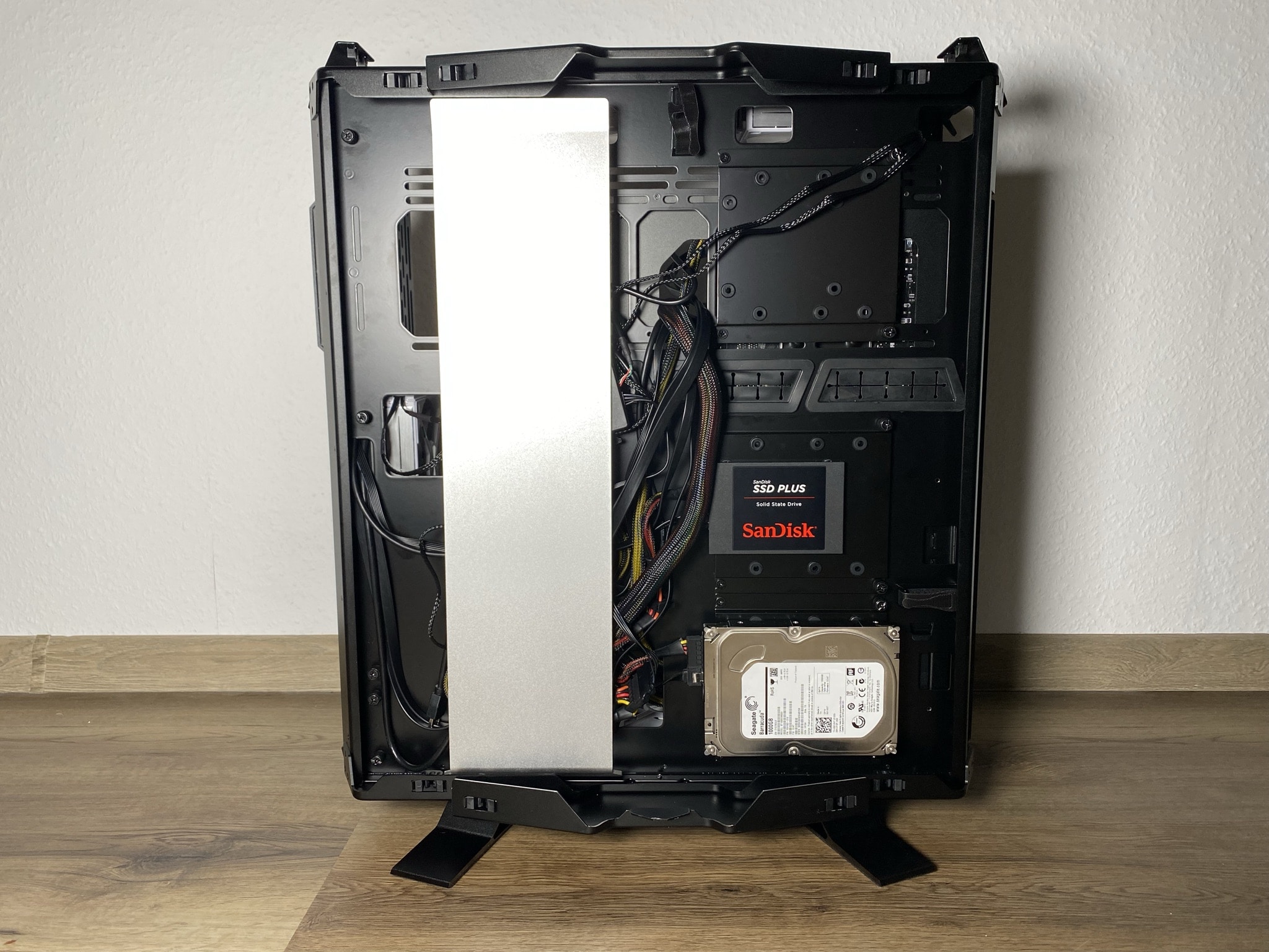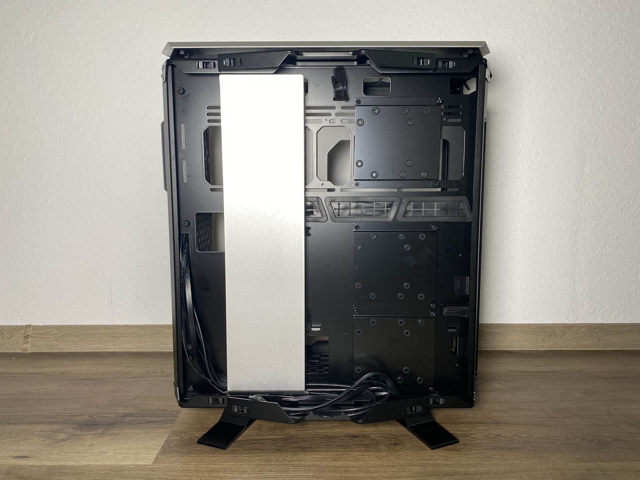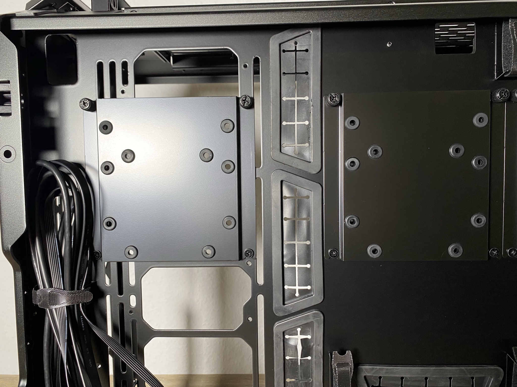 Leiden musste darunter leider die Anzahl an möglichen 2,5″-SSD und 2,5″- bis 3,5″-HDD-Steckplätzen. Insgesamt befinden sich an der Rückseite drei Schienen, die sich mit vier Schrauben an der mittleren Platte festhalten. Diese sind an den Verschraubungspunkten zum Schutz der Platten gummiert. Mit etwas mehr Geschick hätten an der Rückseite oder Innenseite der mittleren Platte weitere Slots Platz gefunden. Dafür wurden nur drei Schienen mitgeliefert, was in einem Big-Tower-Gehäuse etwas mau sein kann.