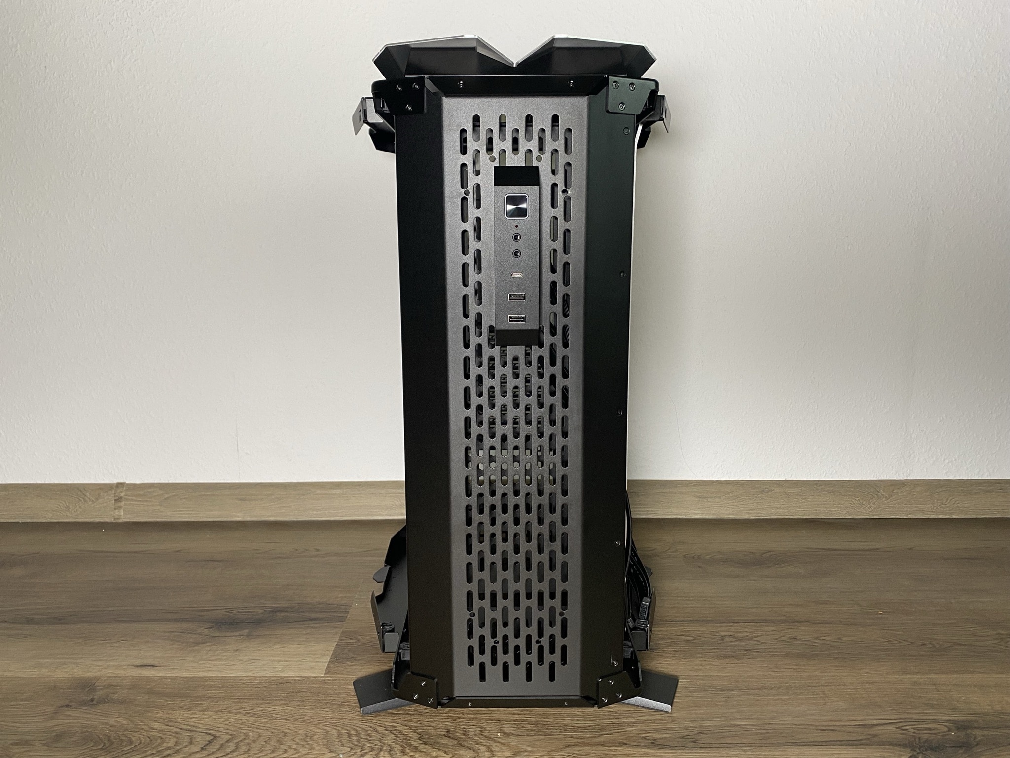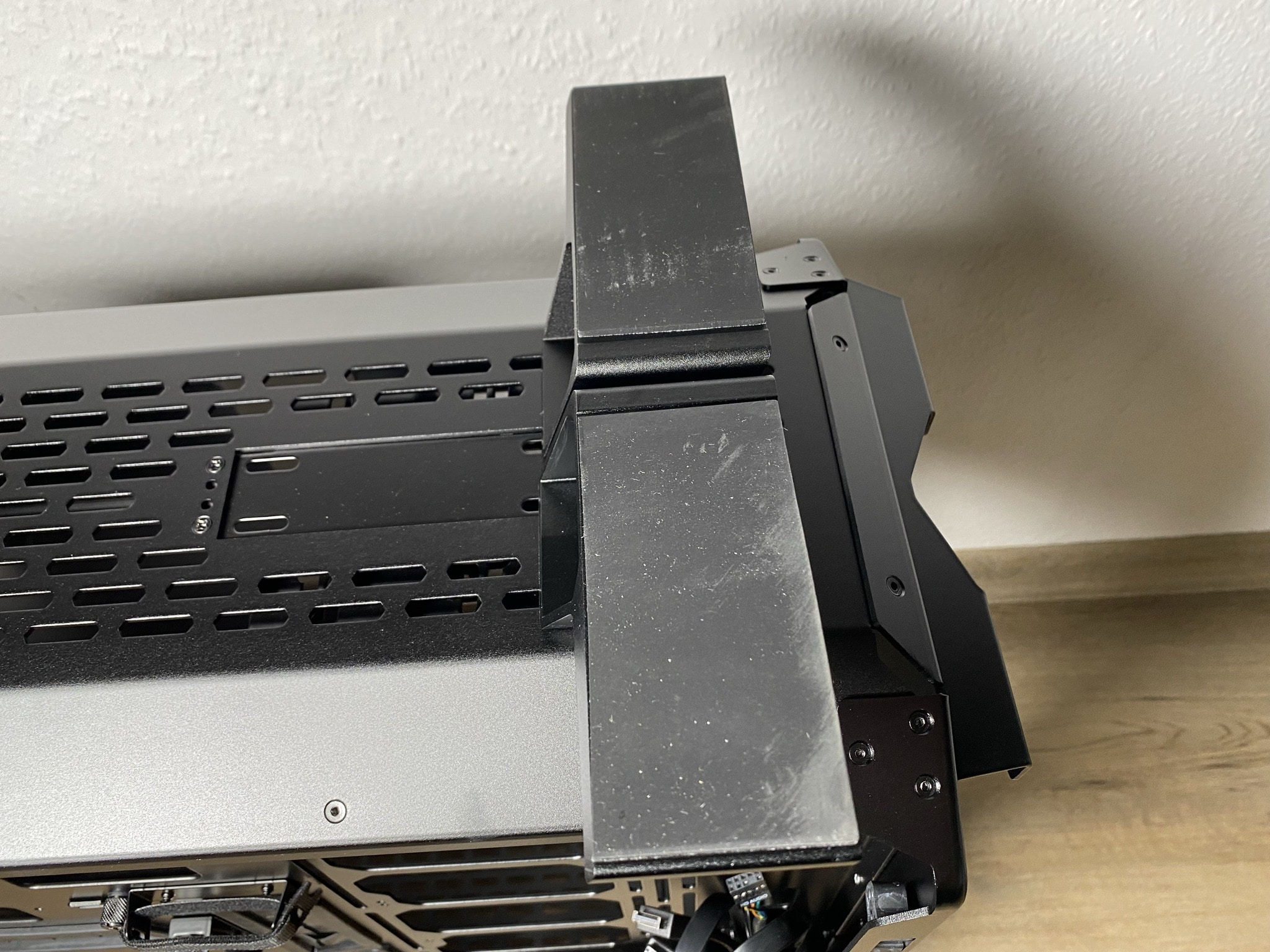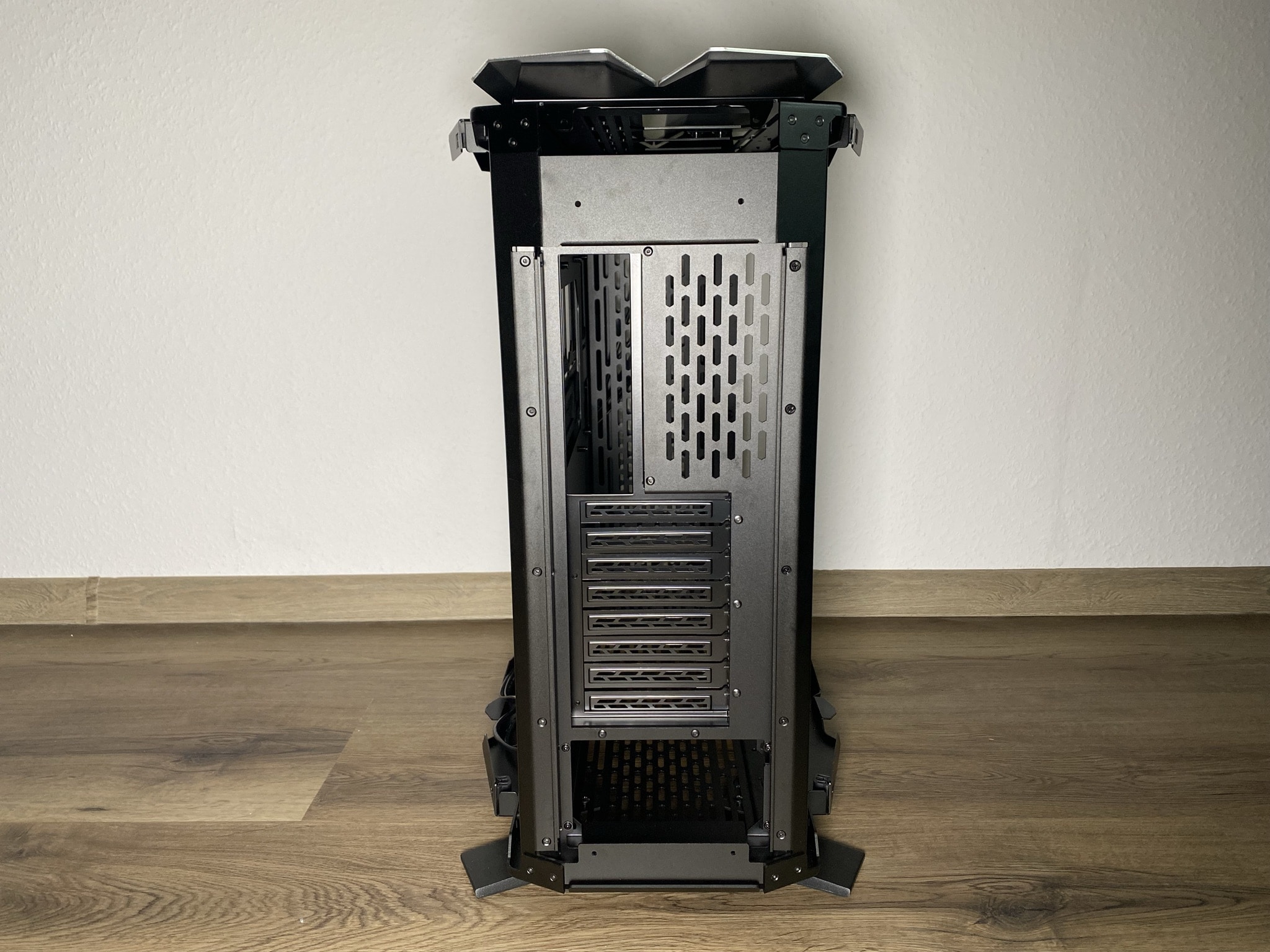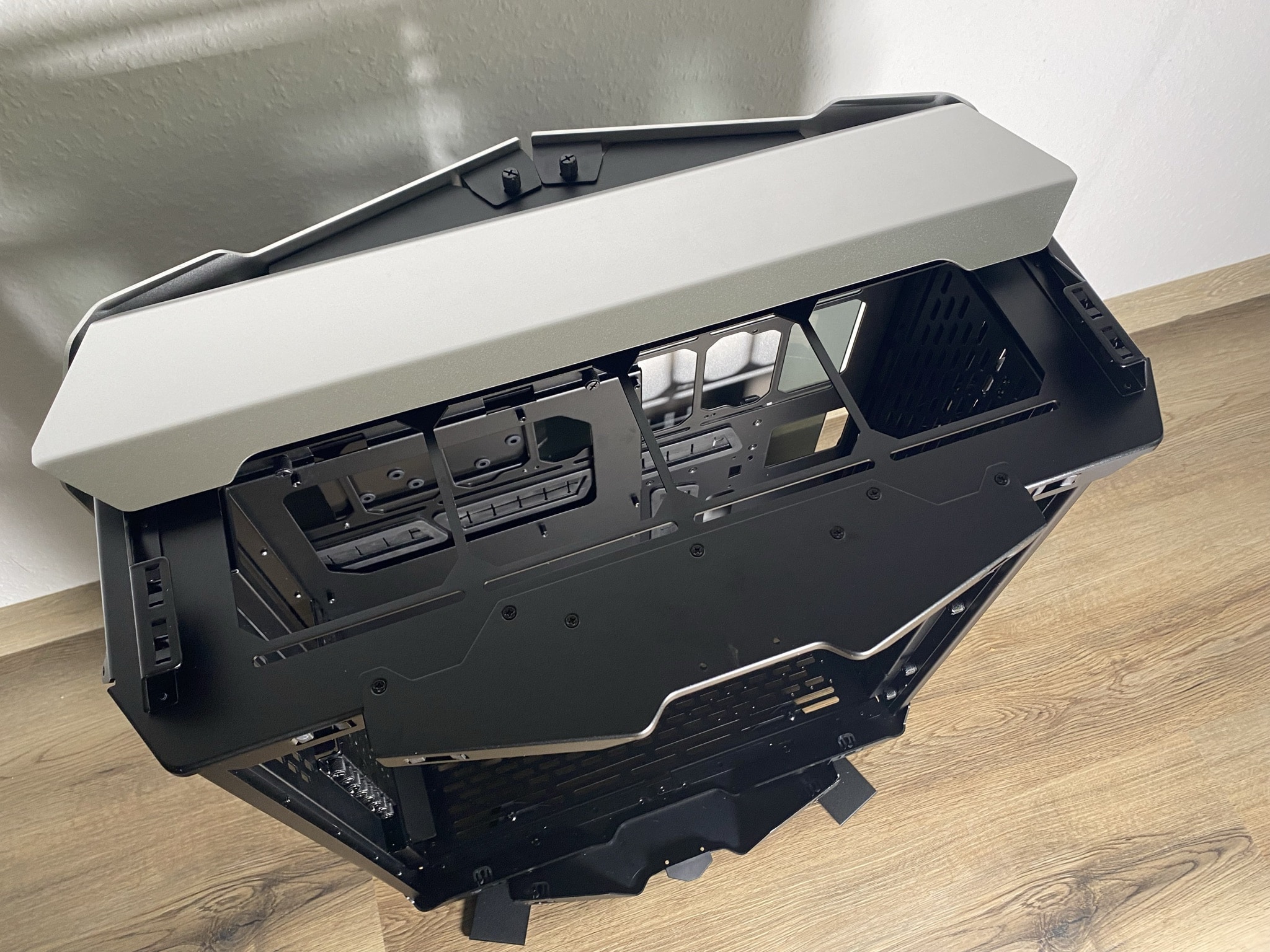 Wie genau die Details einen Unterschied machen können, kann man außerordentlich schön in diesem Kapitel sehen. Starten wir jedoch bei den Grundlagen – der Basis des ODYSSEY X. Hier beginnt die gesamte Magie des Gehäuses. Die Basis ist nicht ohne Grund unfertig montiert geliefert worden, sondern so weit es möglich war offen als eine Art Baukasten. Im ersten Schritt sollte man sich für eine der möglichen drei Varianten mit zwei wesentlich unterschiedlichen Looks entschieden. Den einfachen normalen Look, eine rotierte Variante des normalen Looks und zuletzt ein die von uns getestete Performance-Variante. Je nach Entscheidung kann man die Basis aus einem anderen Winkel betrachten.
