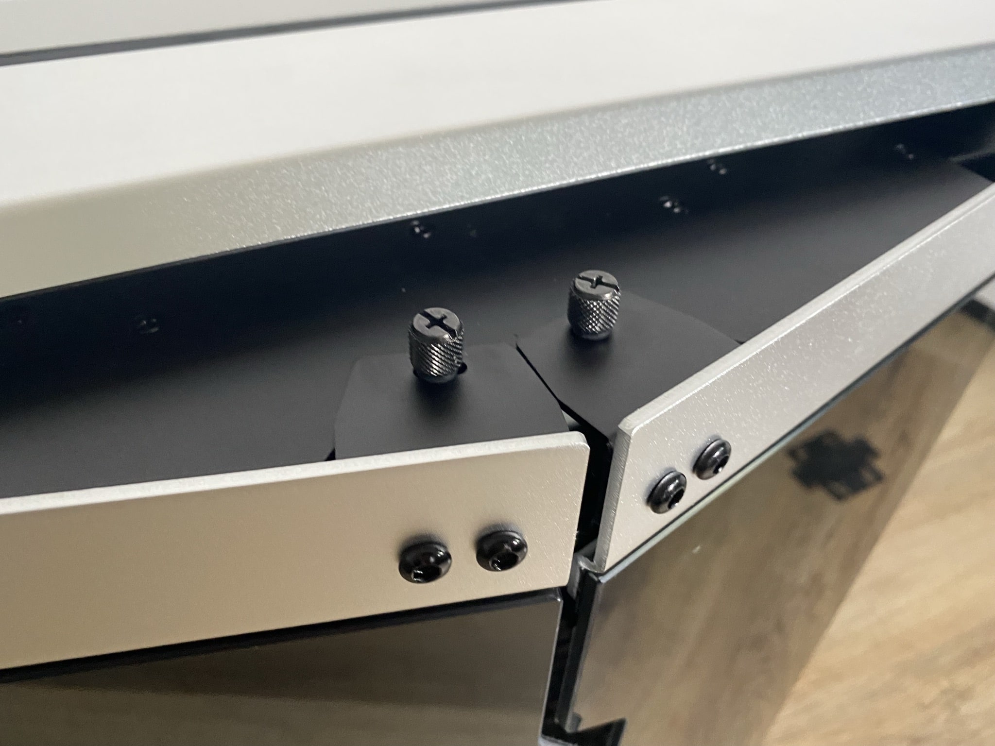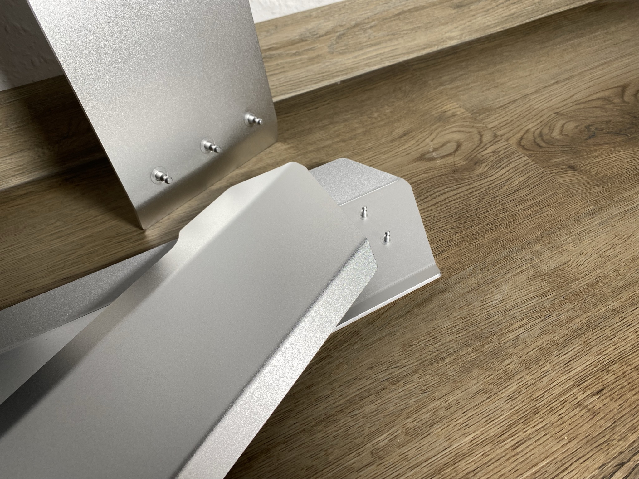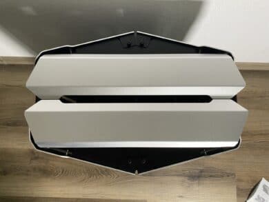 Nun geht es also ins Detail – alle Teile des ODYSSEY X erzeugen schon direkt nach dem Auspacken einen edlen Eindruck. Die Bauteile sind äußerlich hochwertig, die schwarze Lackierung an der Basis sieht super gleichmäßig und dick aus, das silberne Aluminium ist leicht rau und ohne scharfe Kanten. Alles macht somit einen soliden Eindruck. Ein gutes weiteres Beispiel sind die Metallplatten samt Klipps. Diese wirken zwar beim ersten Betrachten etwas instabiler, jedoch ist das Aluminium dermaßen dick, dass hier nichts abbrechen kann. An Materialkosten wurde sicherlich nicht gespart, das spiegelt sich aber auch im Preis wieder.