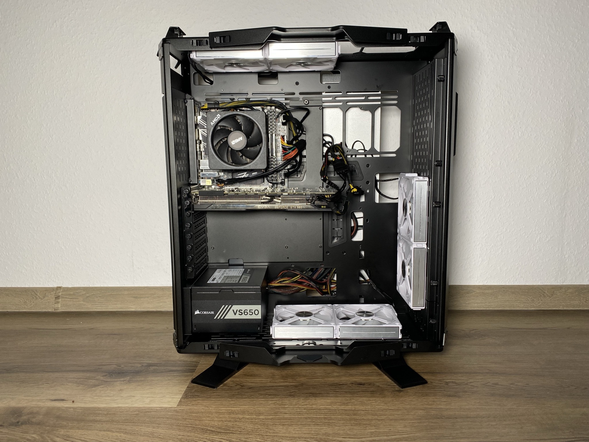 Besonders schön sind zugleich die Möglichkeiten zum Anbringen von Lüftern. An der Vorderseite lassen sich vier 120-mm-Lüfter befestigen, verzichtet man auf den PSU-Schacht lassen sich unten weitere zwei 120-mm- oder 140-mm-Lüfter montieren. Oben sieht die Aussparung zwar kompatibel für vier 120-mm-Lüfter aus, es ist aber nur Platz für drei weitere 120-mm- oder 140-mm-Lüfter vorhanden. Zuletzt würden in der inneren Platte auch noch Platz für vier 120-mm-Lüfter finden, der in der Regel aber nicht gebraucht wird. Dafür ist das Gehäuse offen und groß genug.