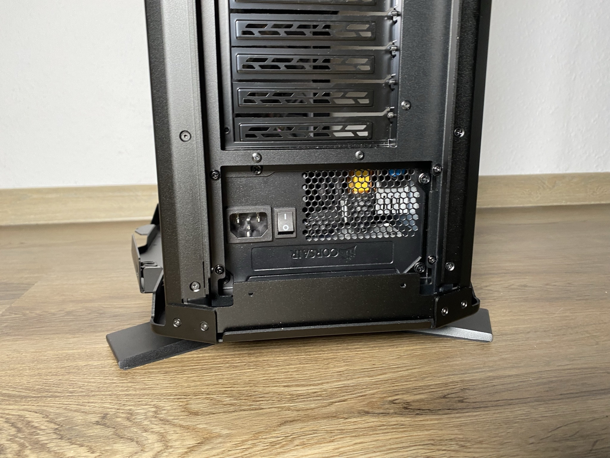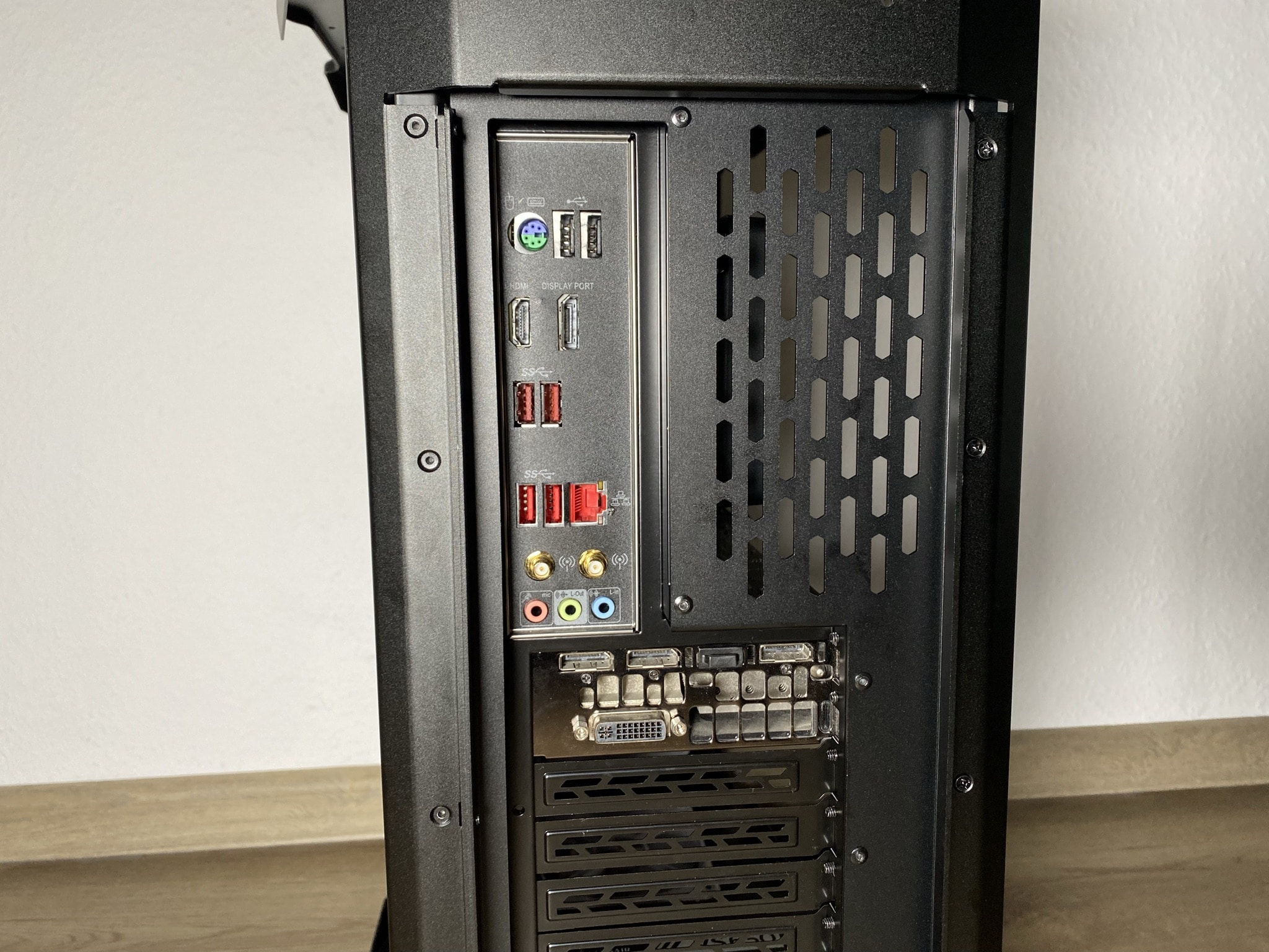 Weiter geht es mit der Rückseite. Grundlegend ist hier alles wie gewohnt, außer dass man an der Rückseite keinen standardmäßigen 120-mm-Lüfter anbringen kann. Das ist bei der Art und Bauform des Gehäuses aber kein tragischer Verlust.